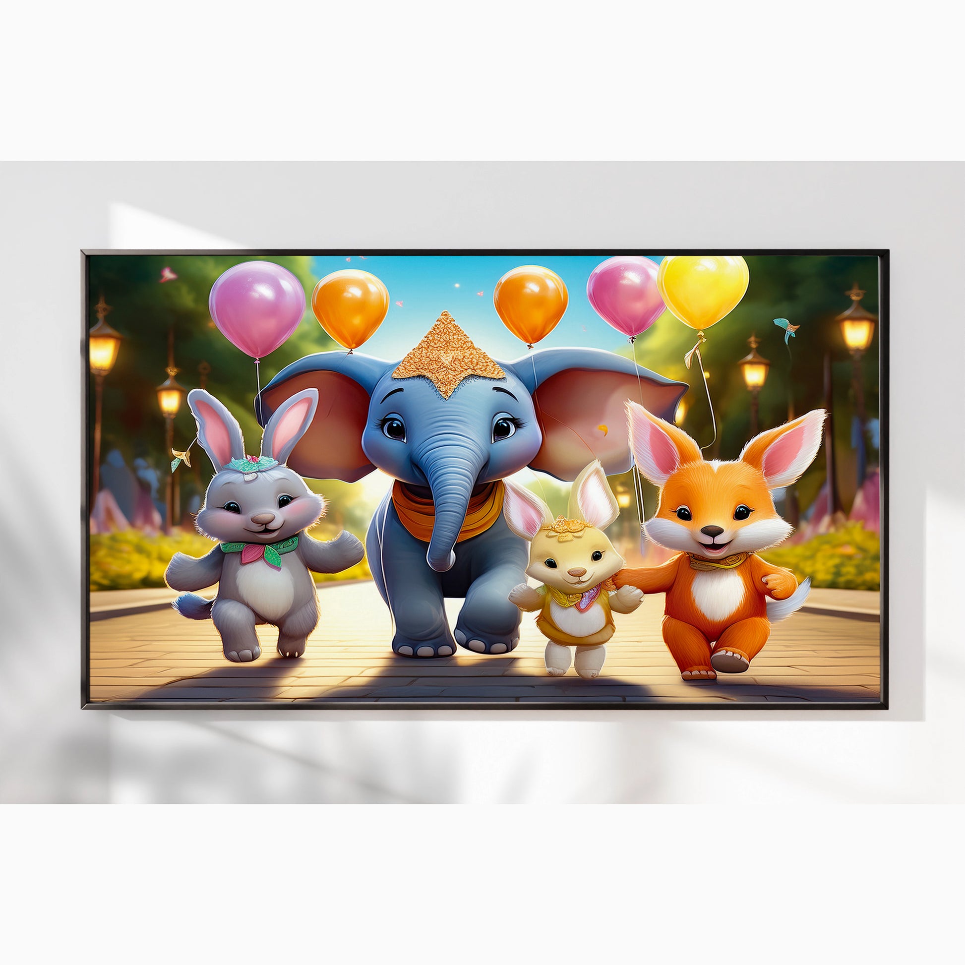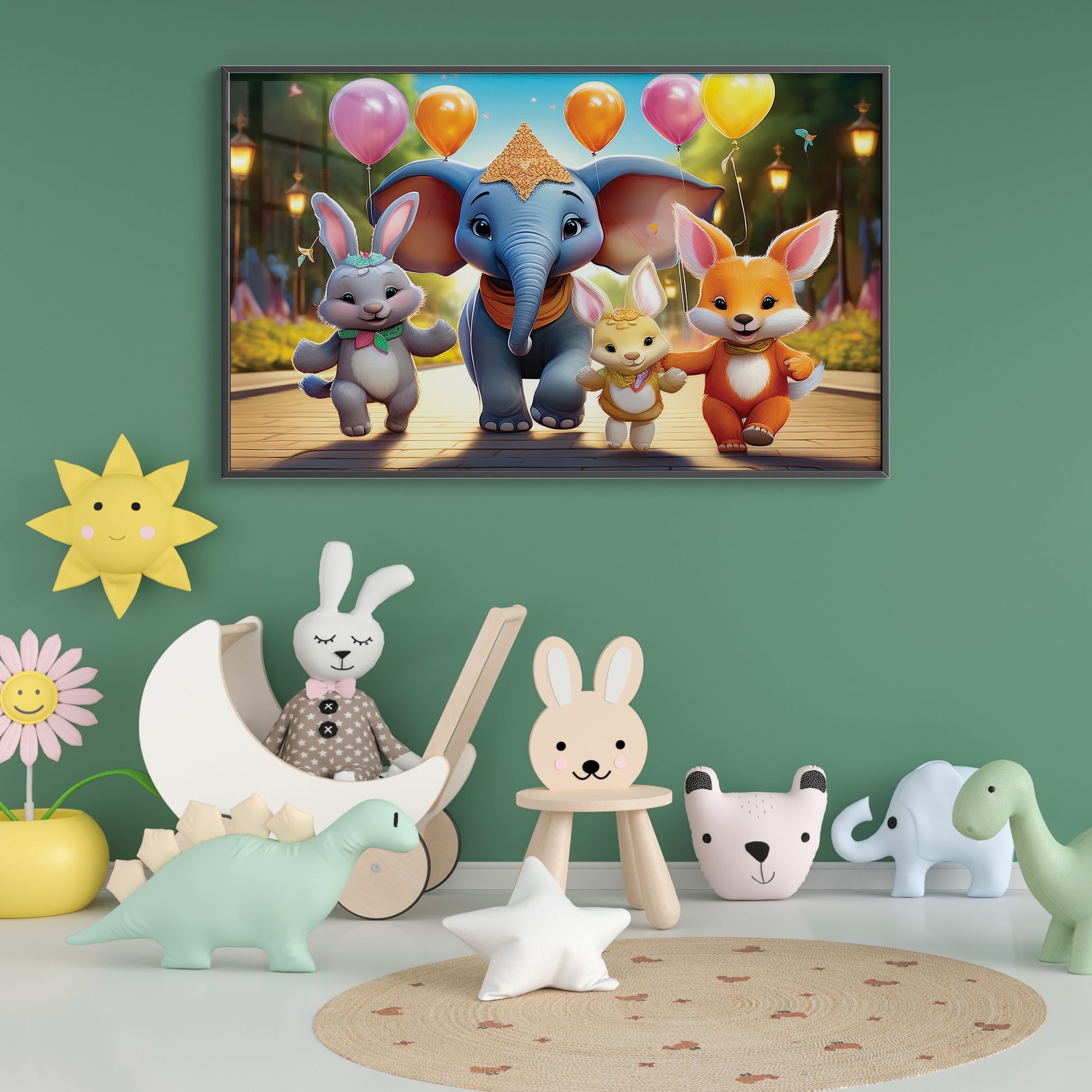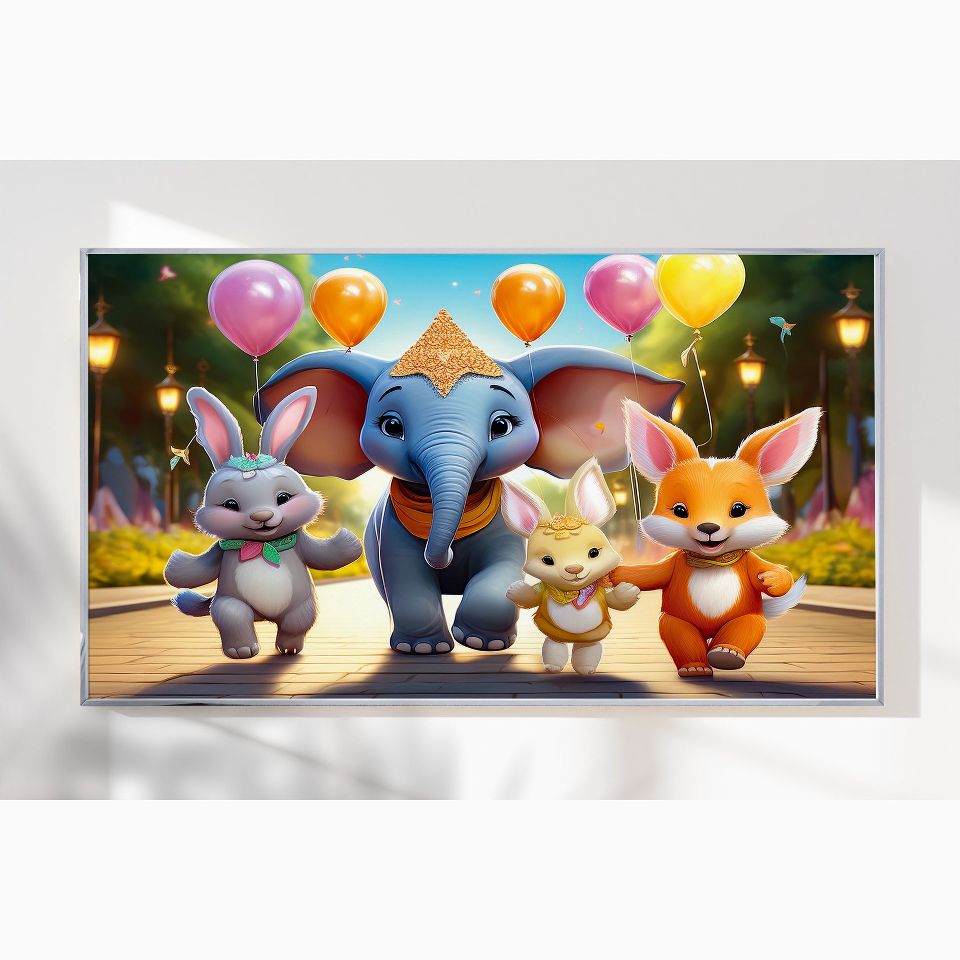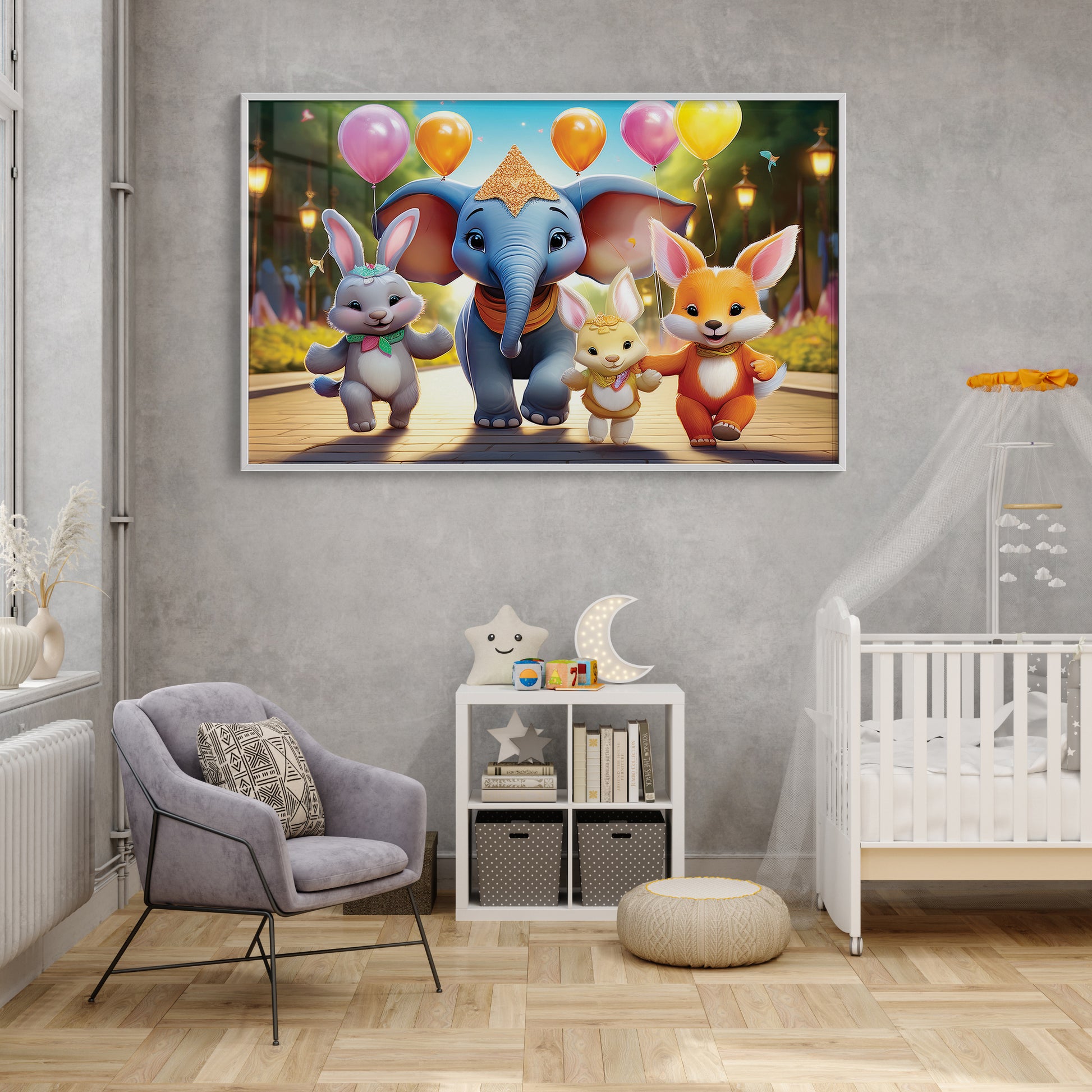 Step into a magical world where elephants wear crowns and bunnies float balloons through lantern-lit paths. This 3D-style illustration bursts with delight and wonder—perfect for inspiring young imaginations and cozy dreams.