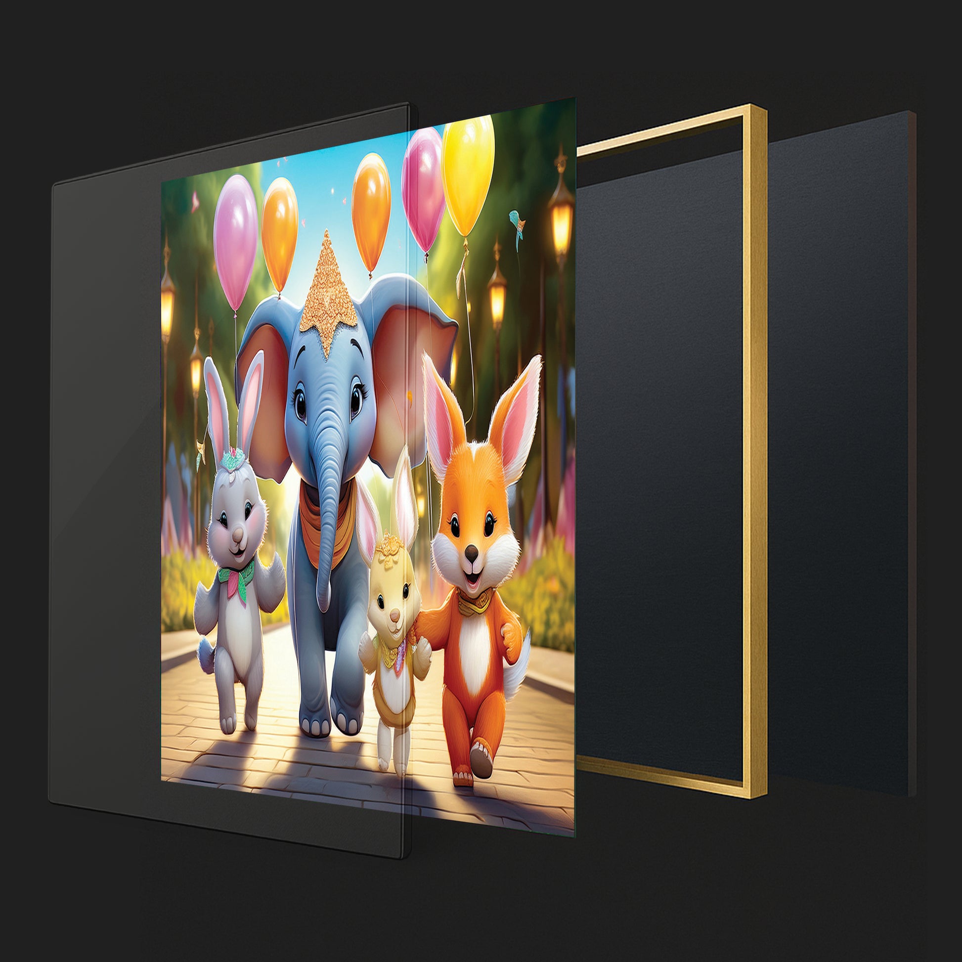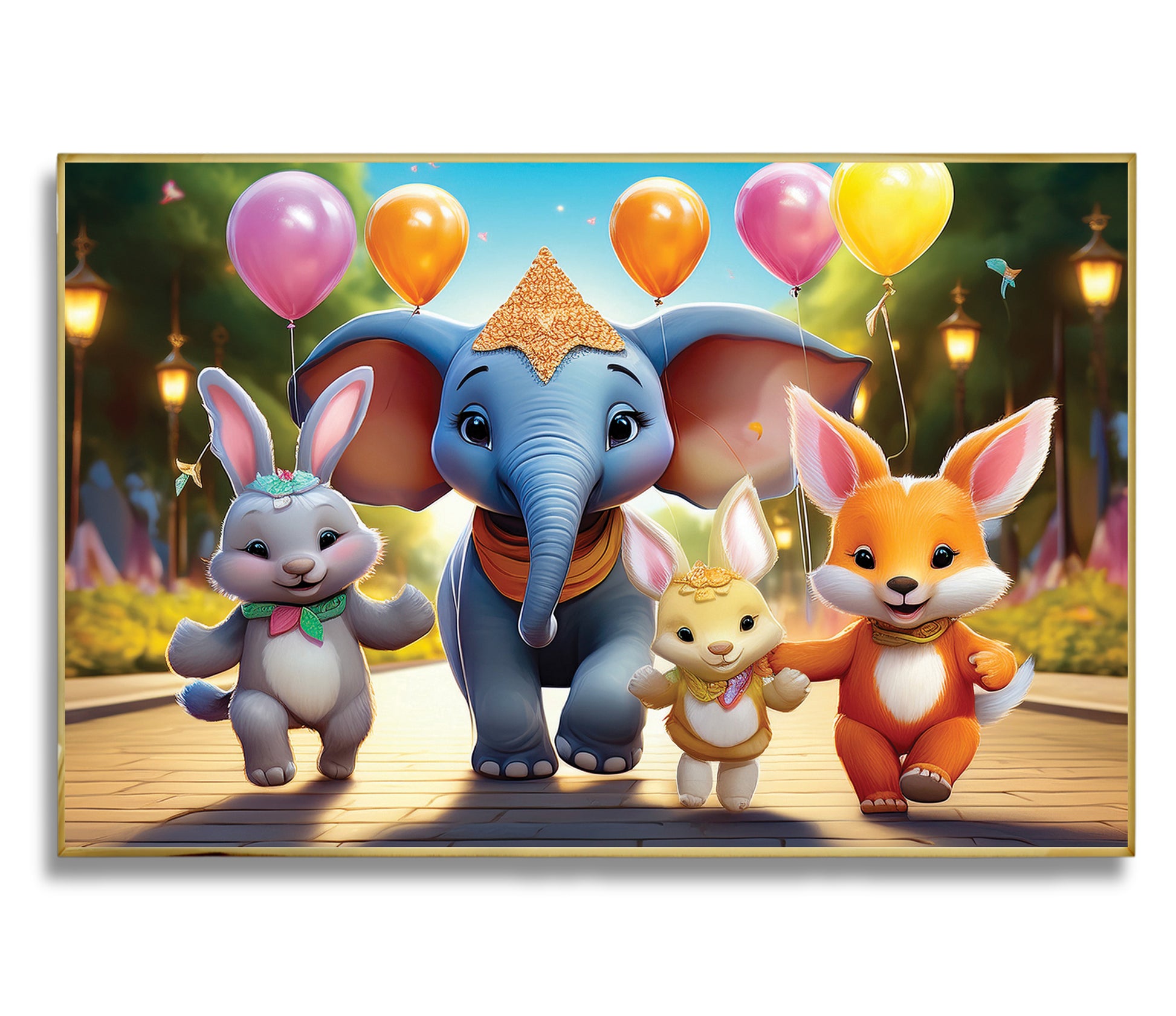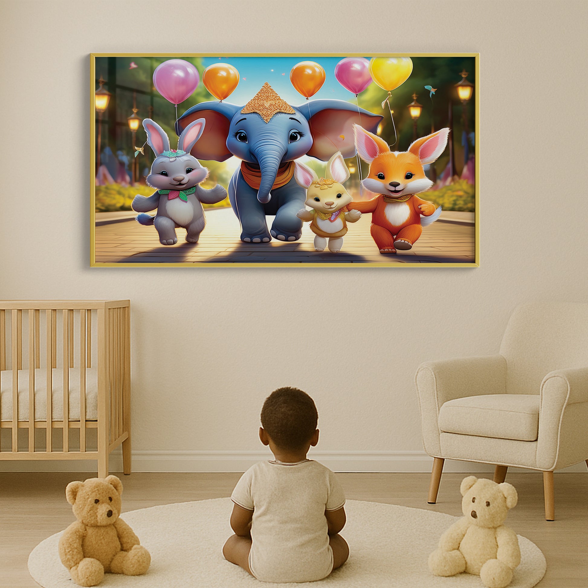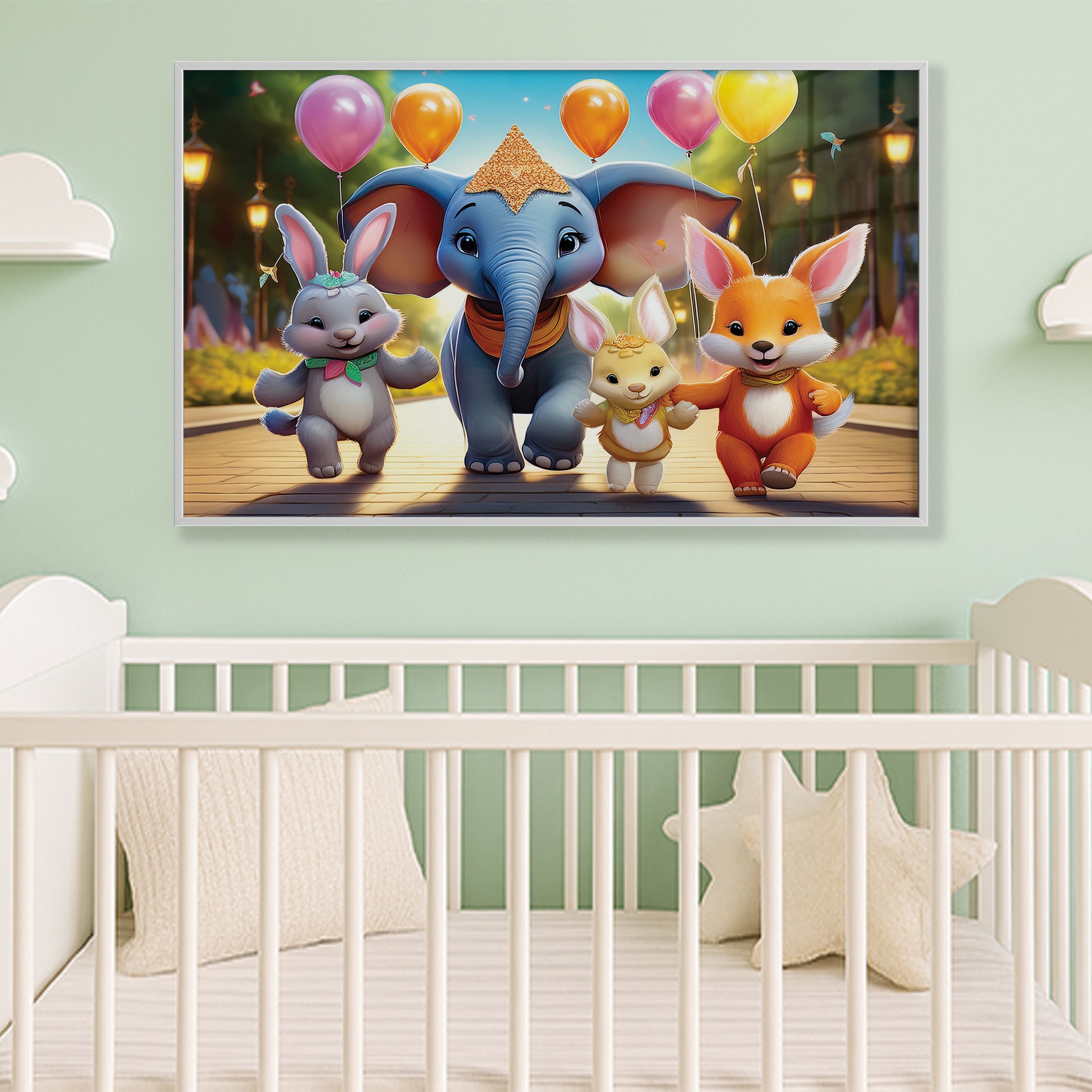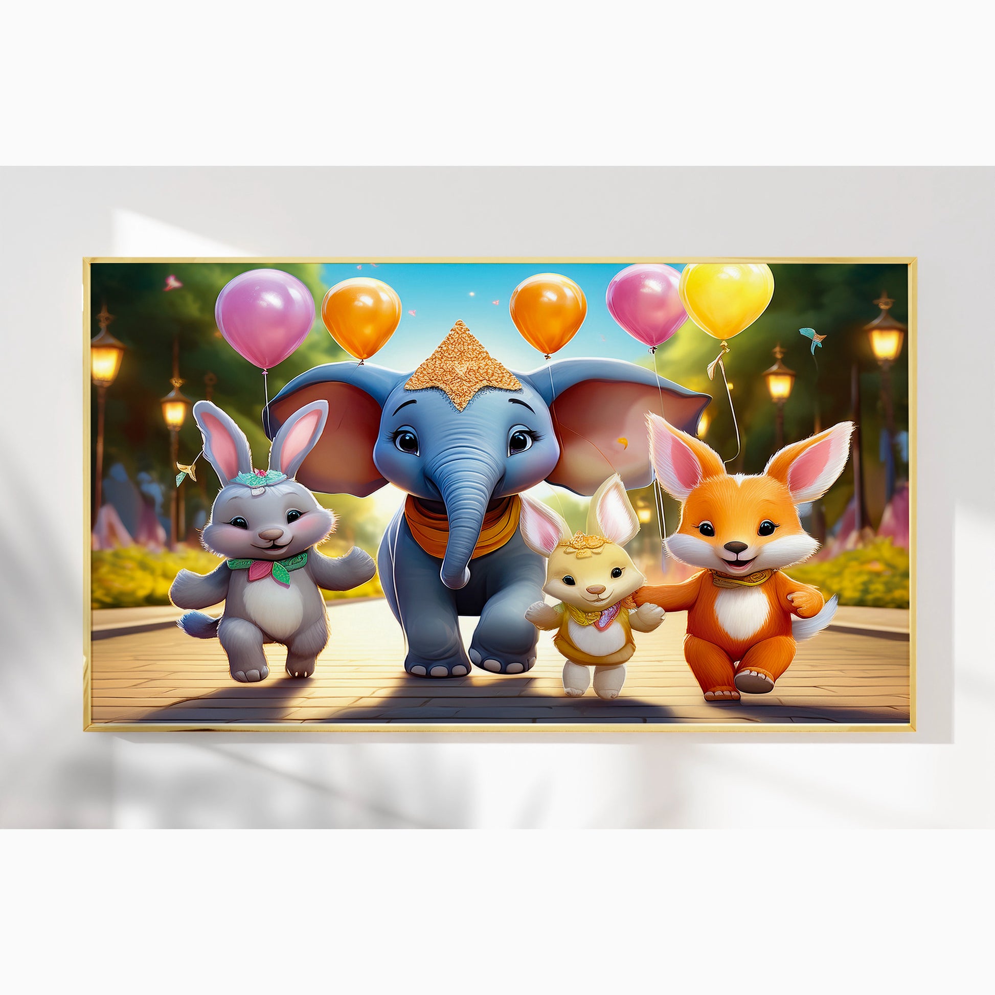 Step into a magical world where elephants wear crowns and bunnies float balloons through lantern-lit paths. This 3D-style illustration bursts with delight and wonder—perfect for inspiring young imaginations and cozy dreams.
