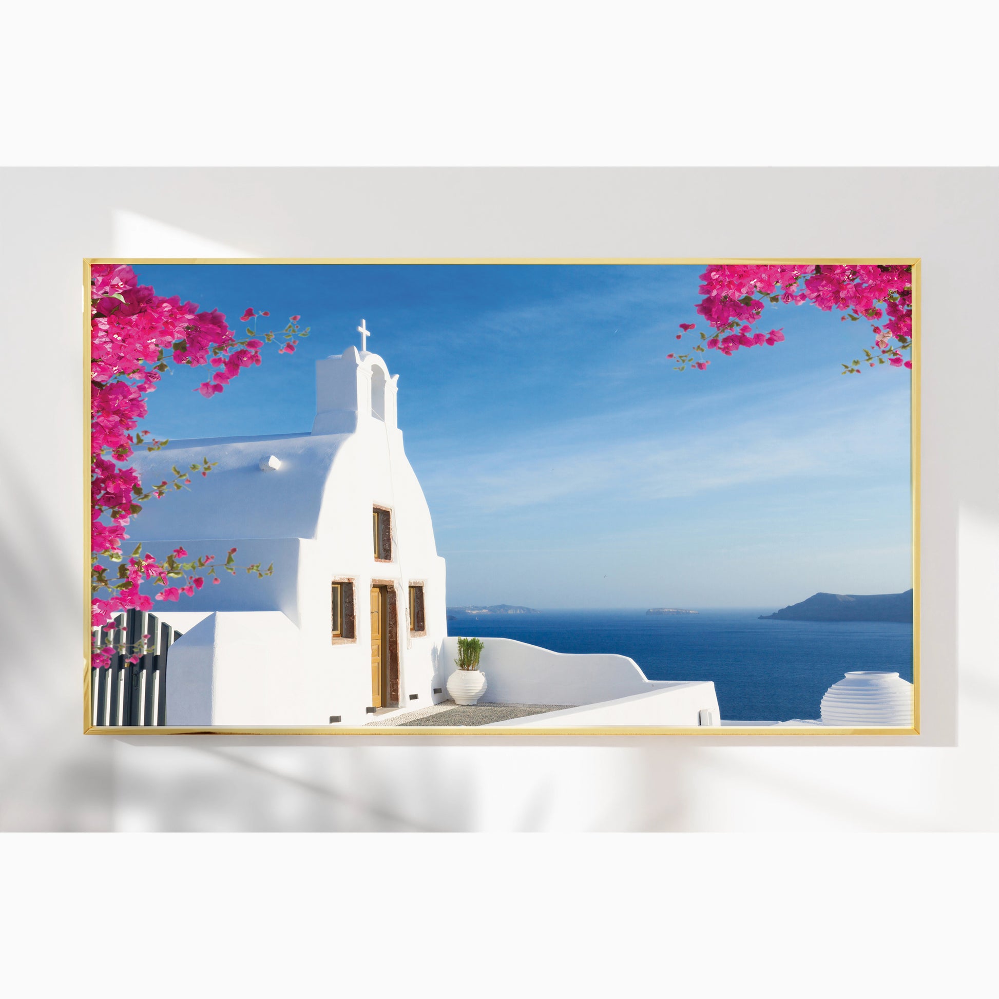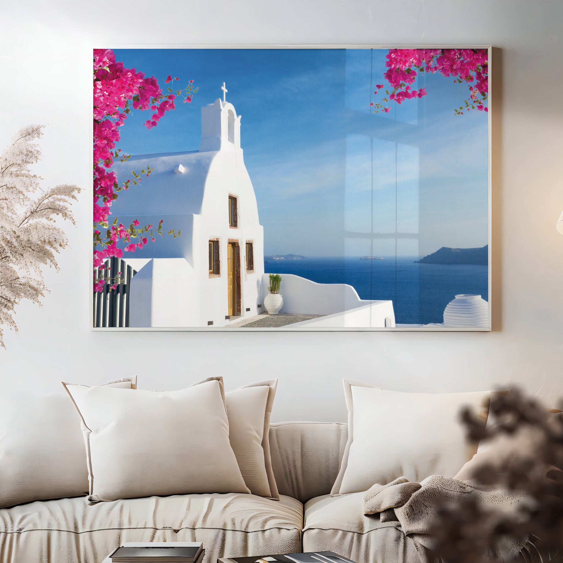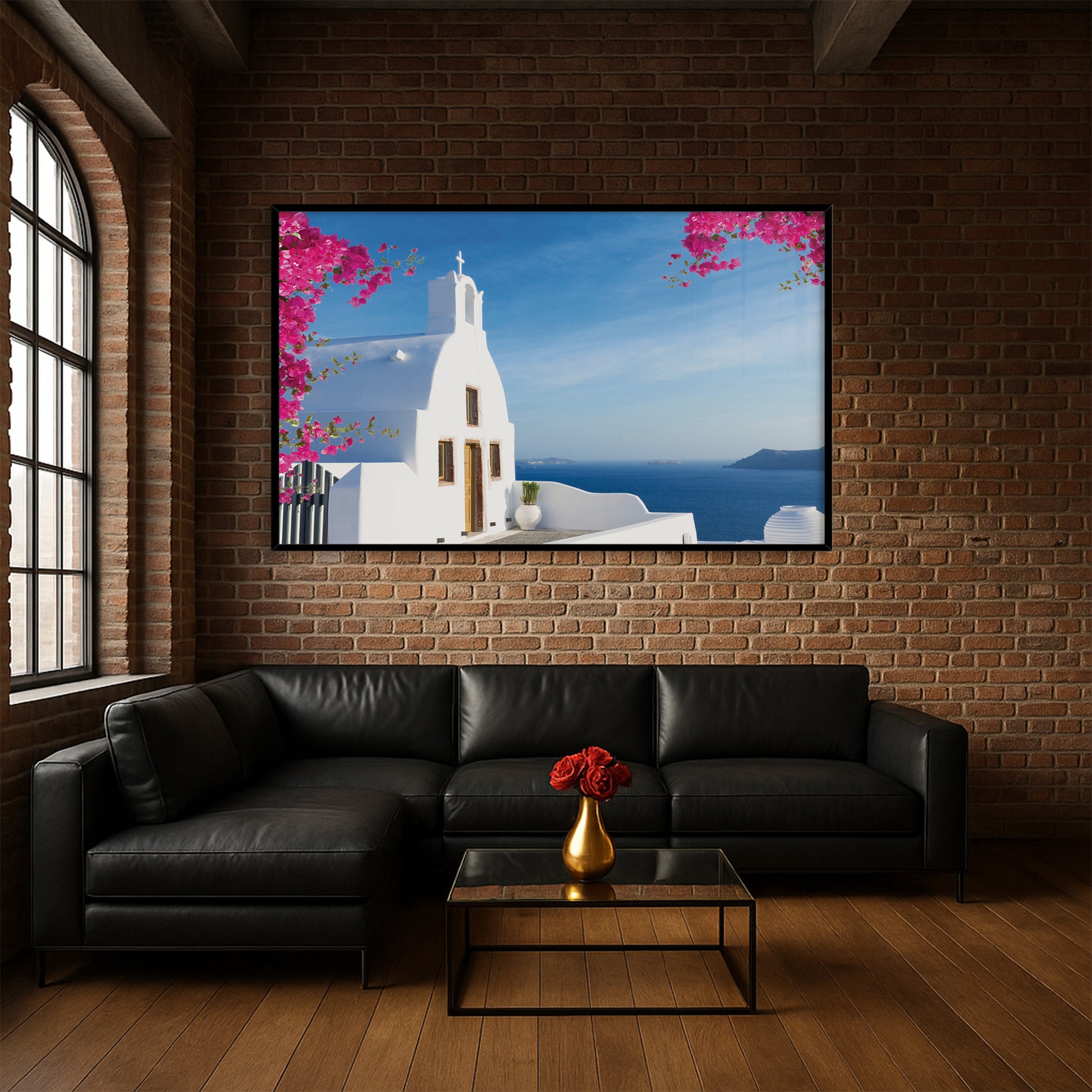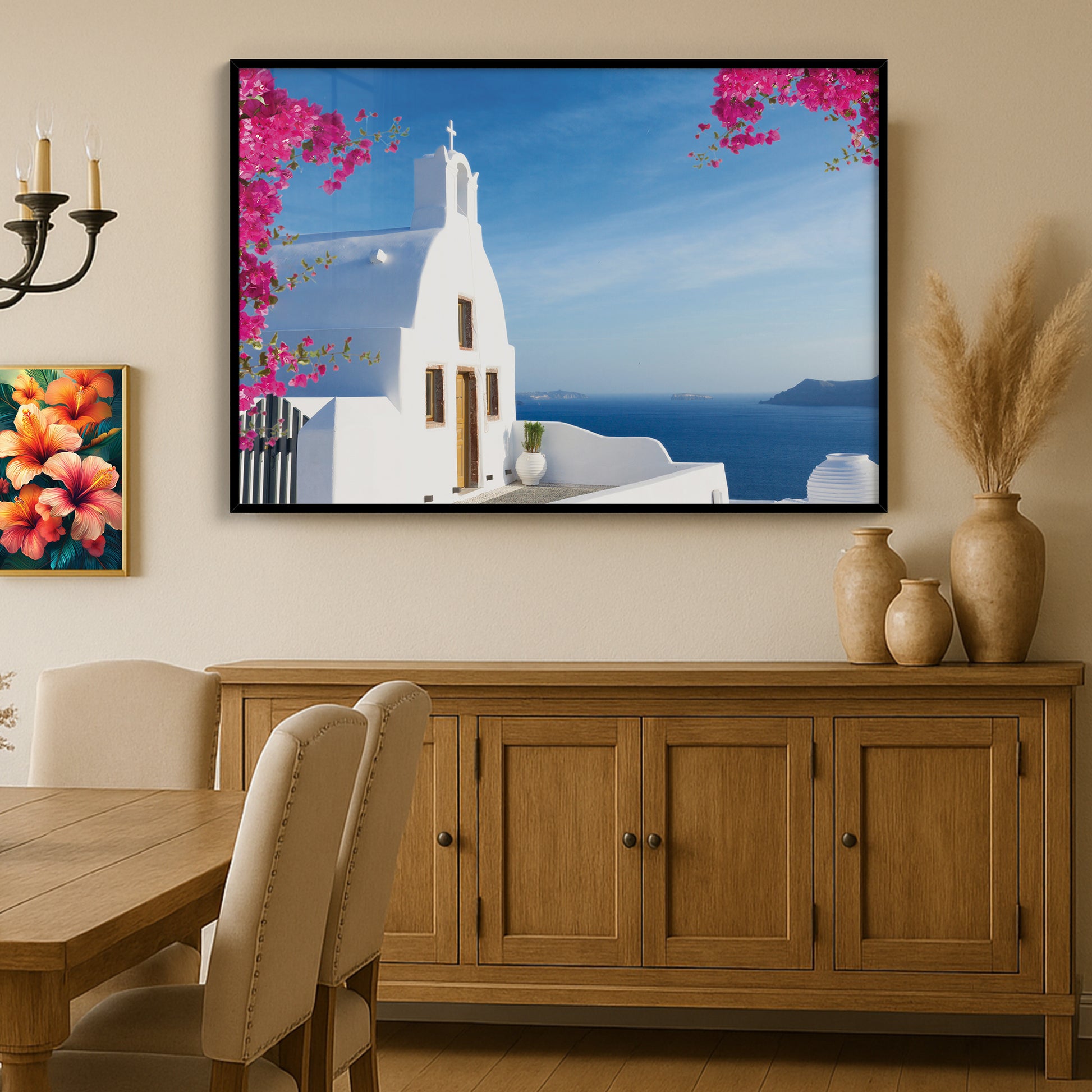 This elegant image features a pristine white chapel perched high above the Aegean Sea, framed by blooming bougainvillea. With its soft architecture, blue sky, and endless ocean horizon, this scene reflects the serenity and spirituality of Greek island living.