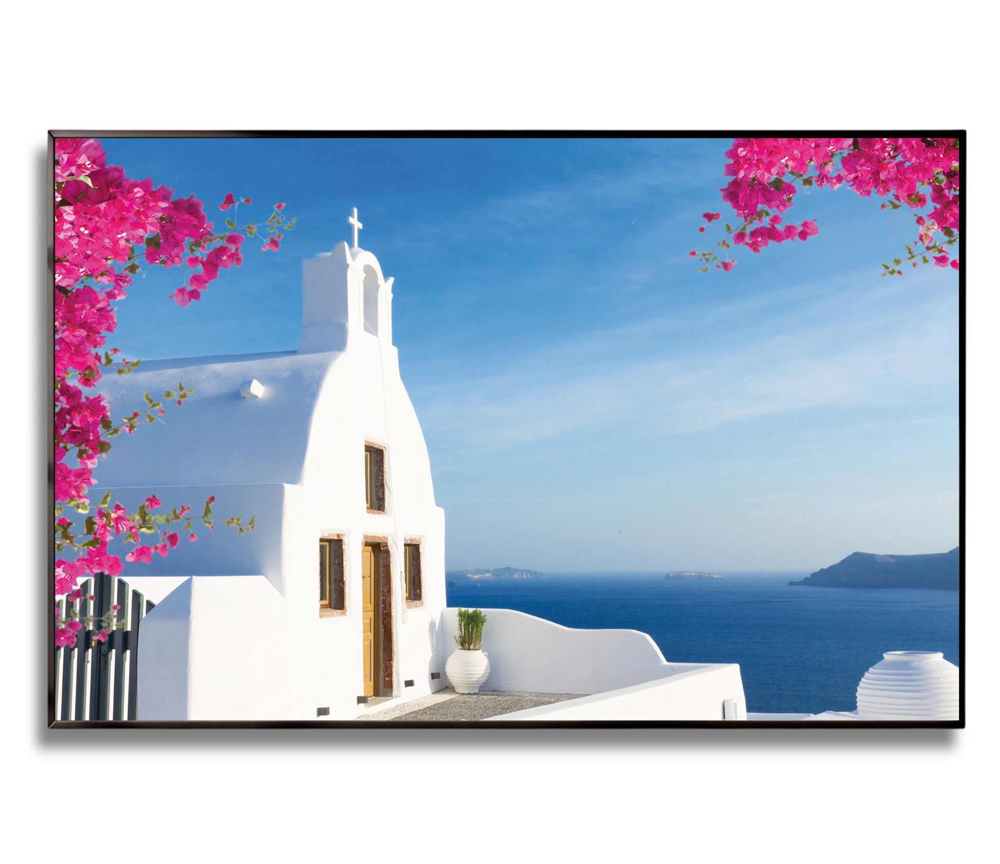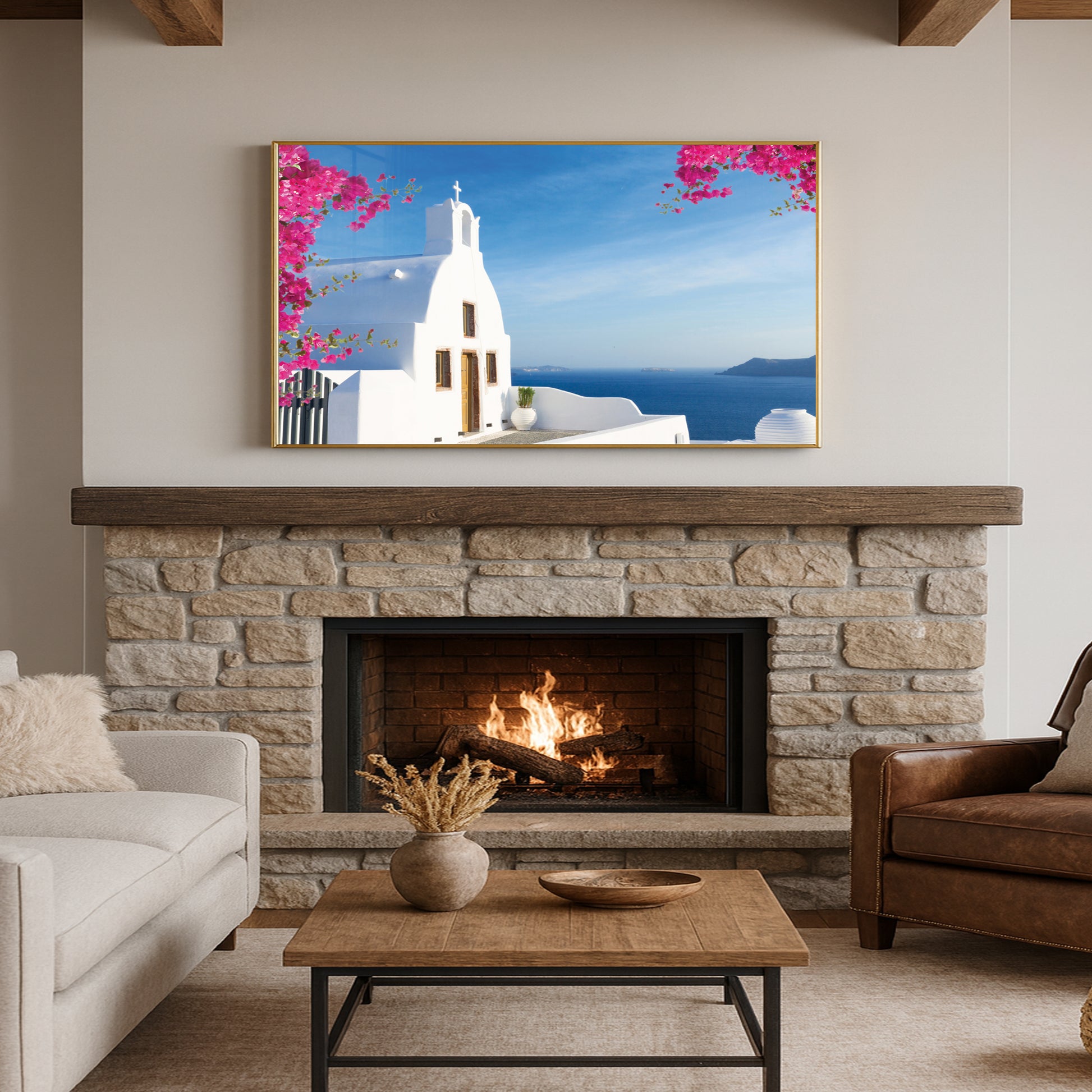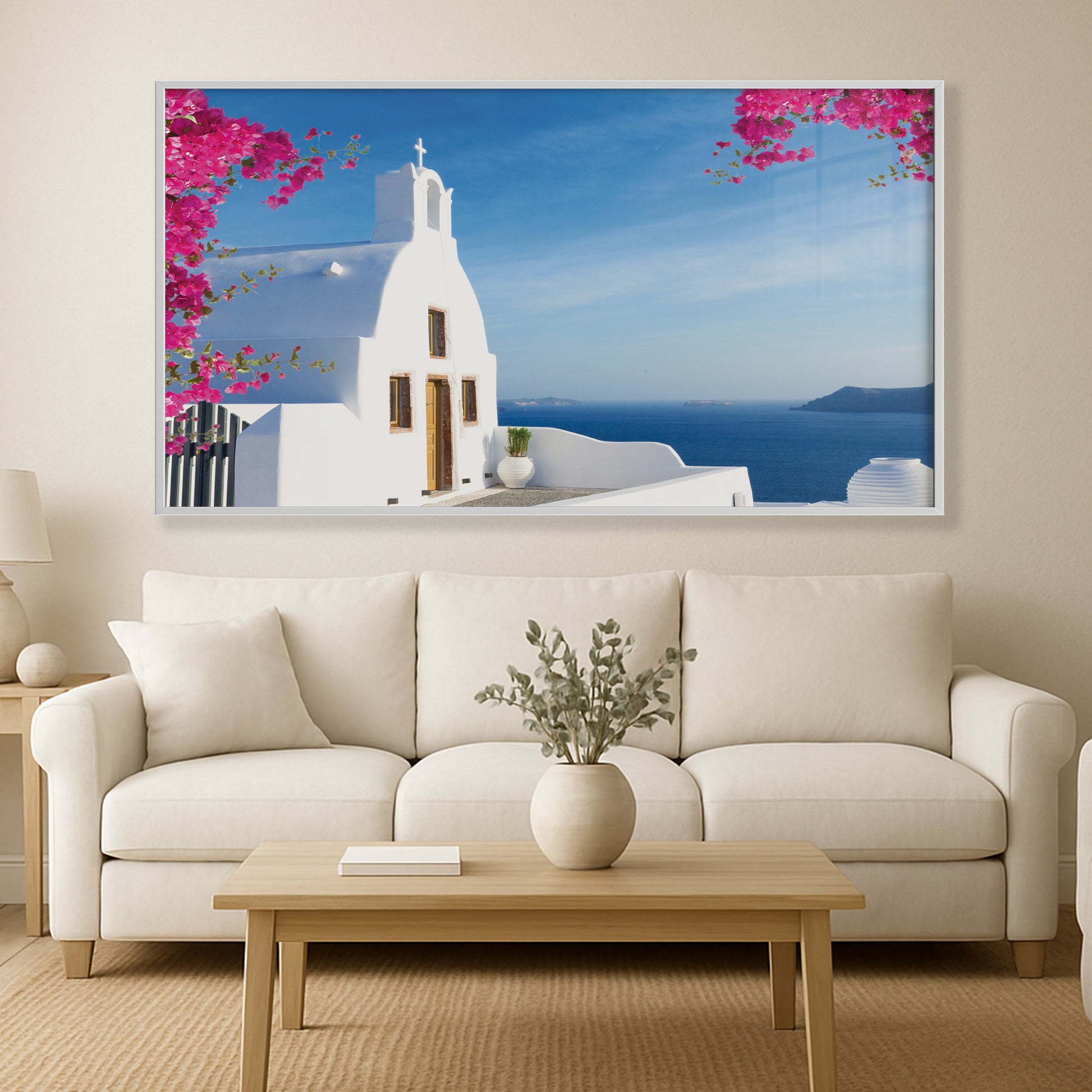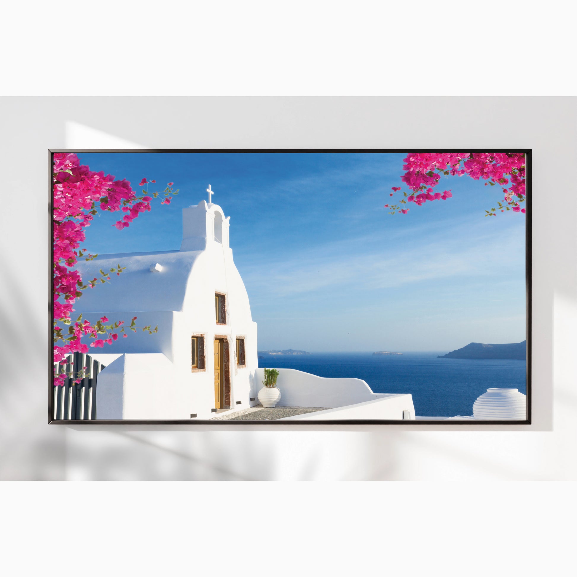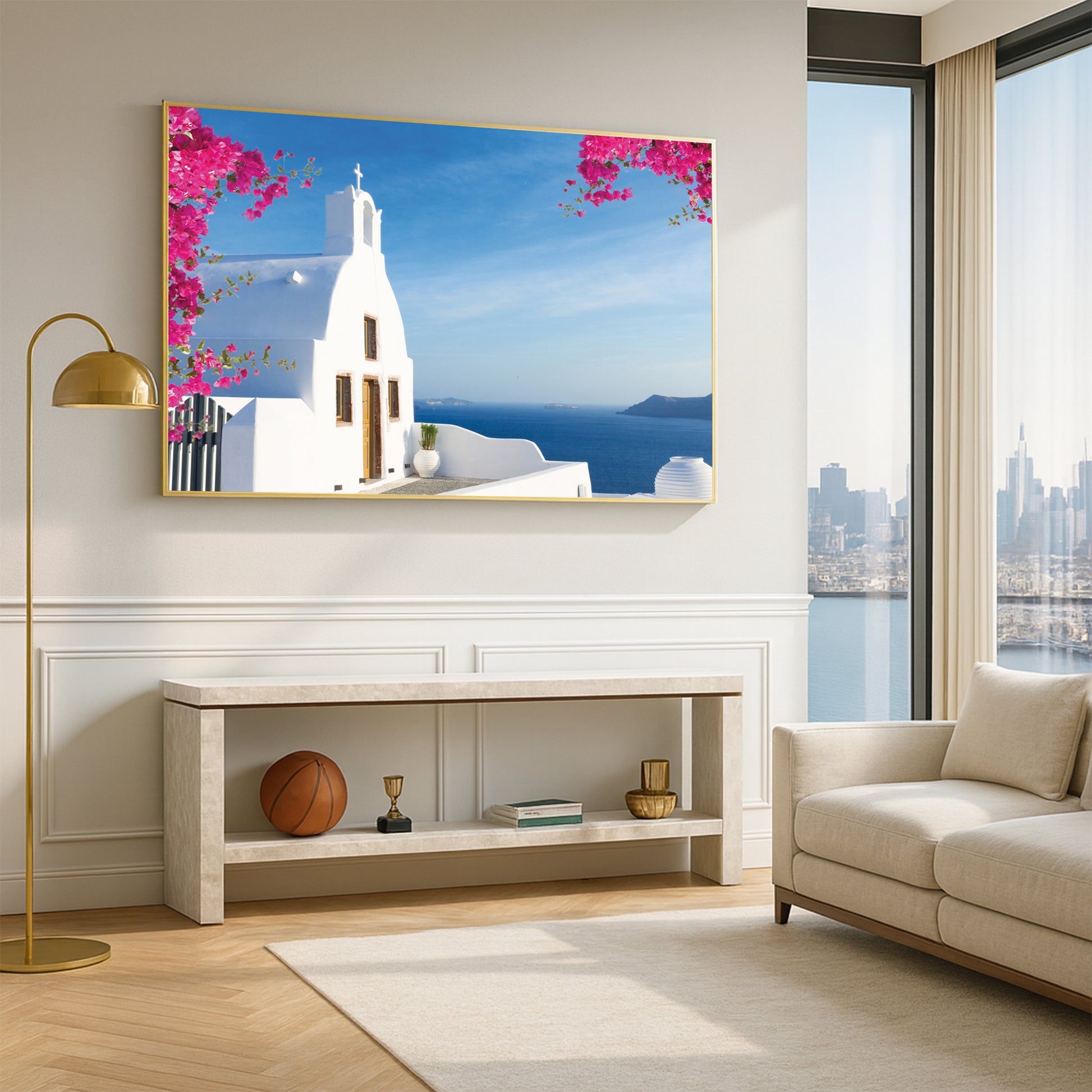 This elegant image features a pristine white chapel perched high above the Aegean Sea, framed by blooming bougainvillea. With its soft architecture, blue sky, and endless ocean horizon, this scene reflects the serenity and spirituality of Greek island living.