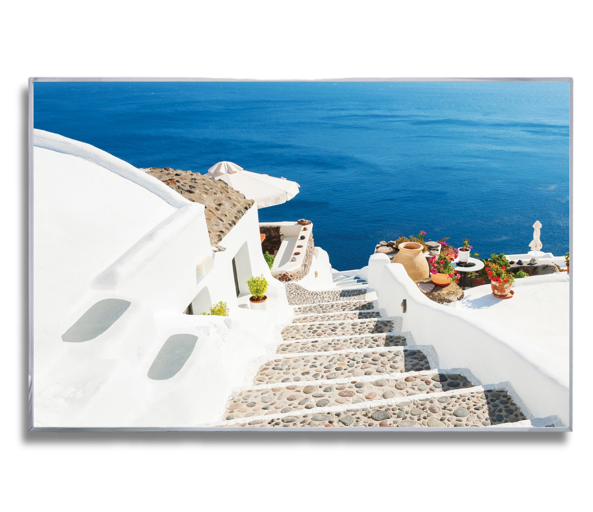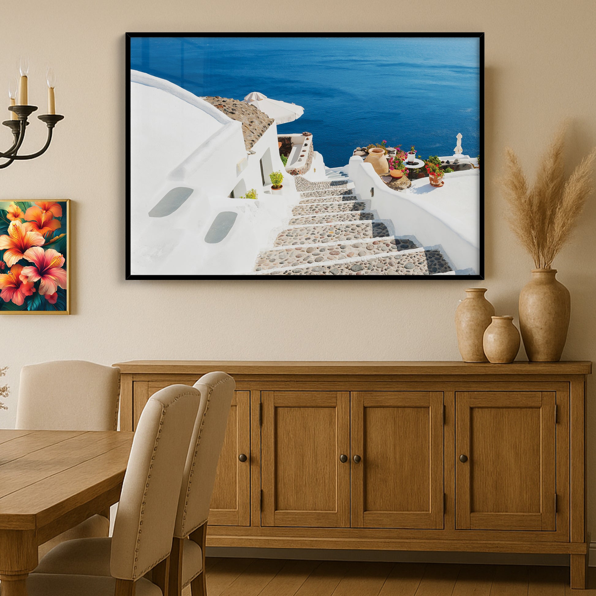 Take a scenic stroll down Santorini’s iconic cliffside stairs with this luxurious wall art. Showcasing traditional whitewashed homes and terracotta pots against a crystal blue sea, this image captures the soul of Greek island beauty.