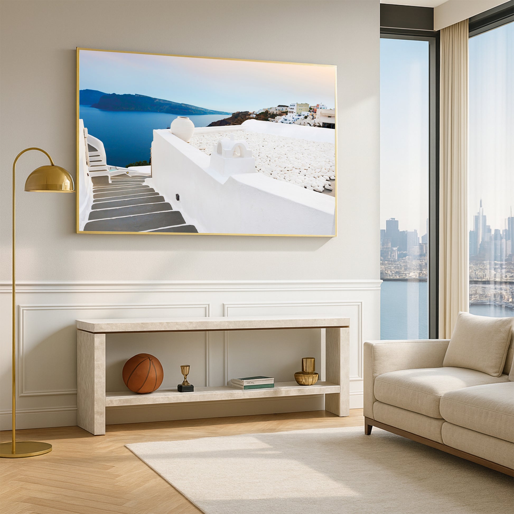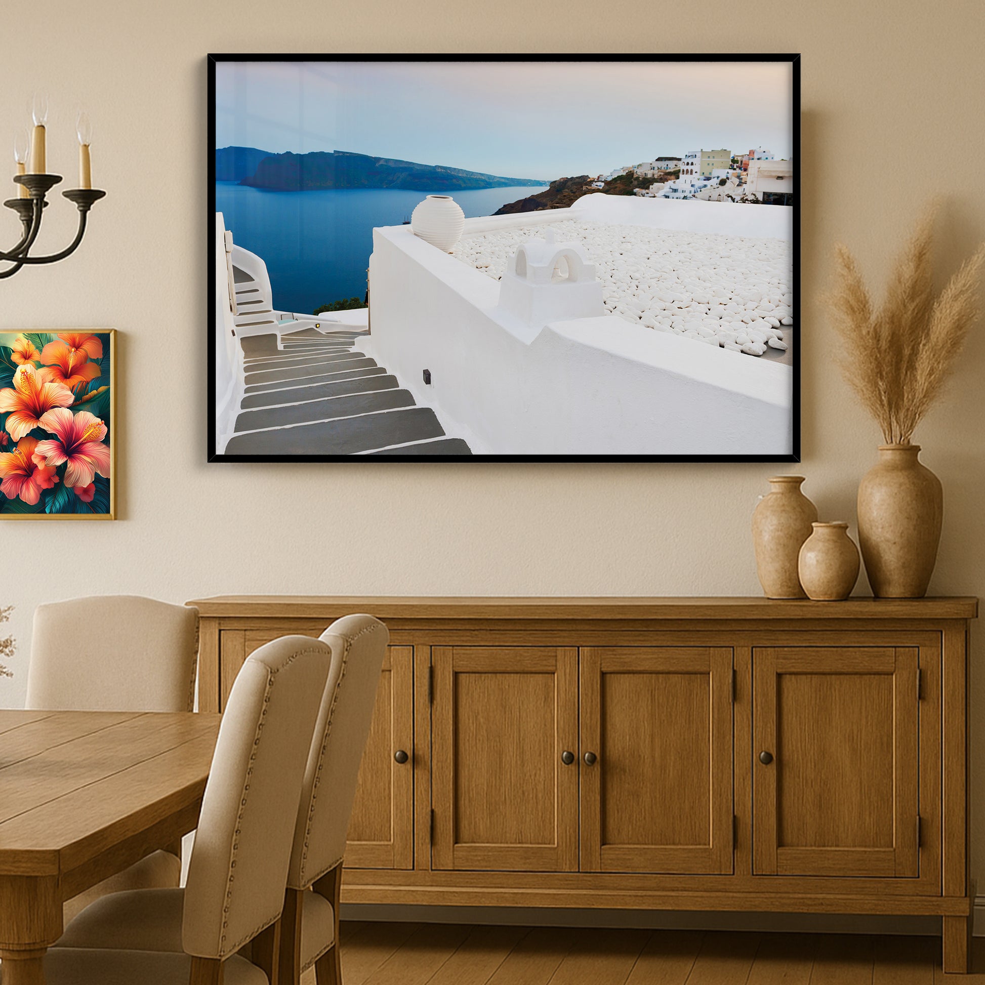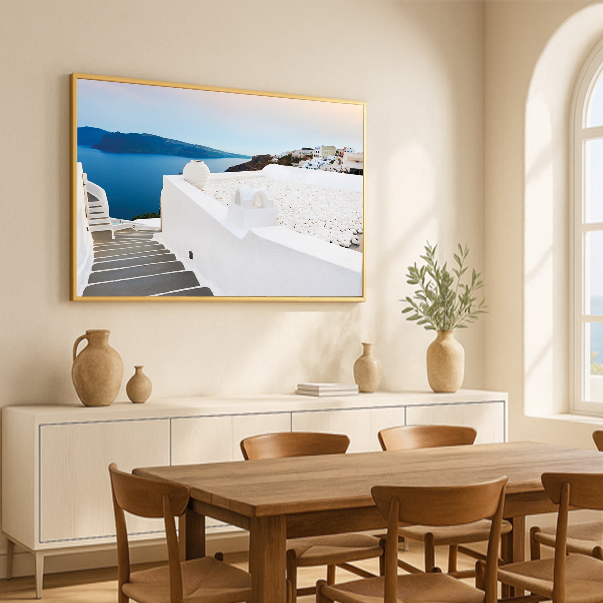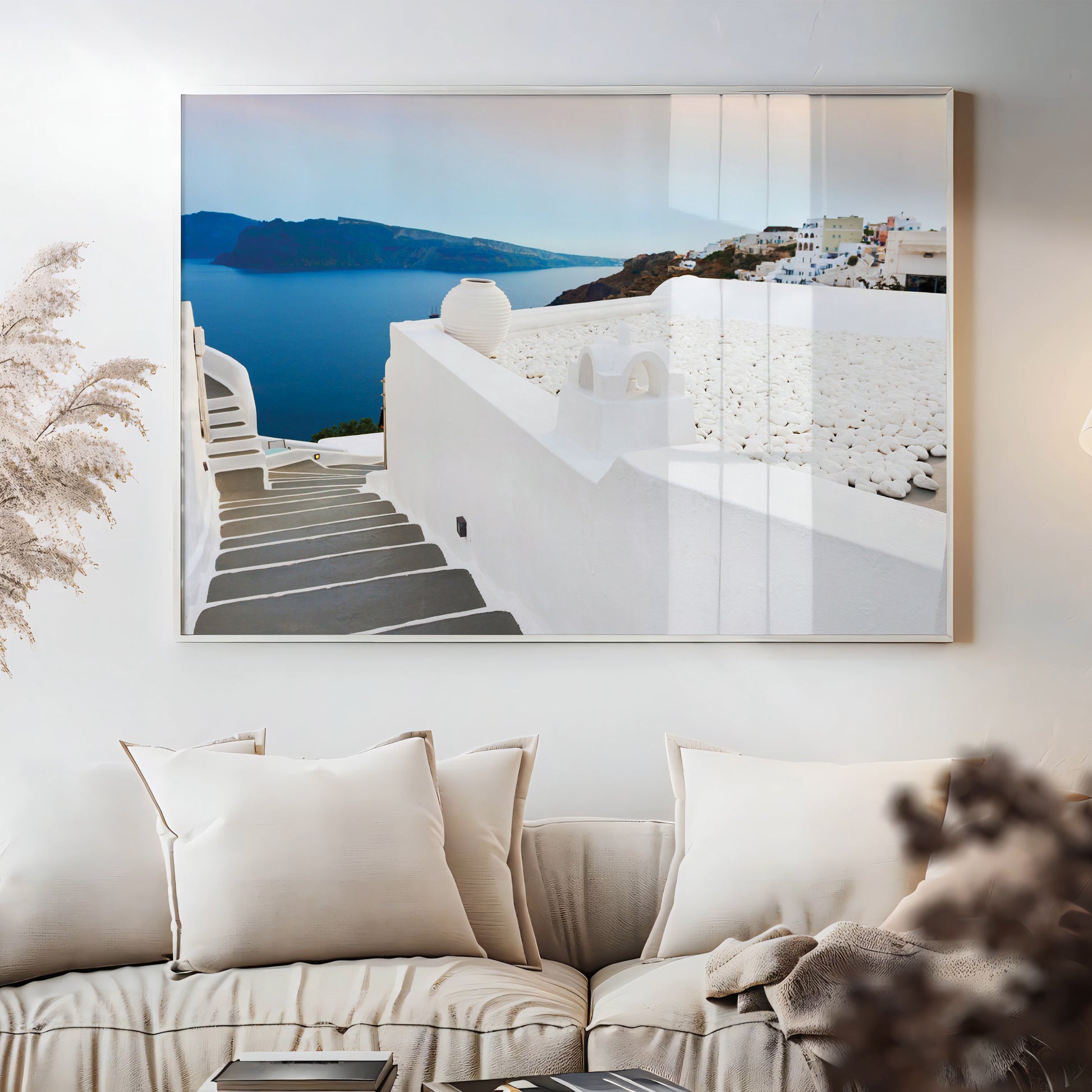 Embrace peaceful minimalism with this wall art of Santorini’s soft, curved stairs descending alongside a cliff with sweeping Aegean Sea views. White stones and traditional architecture evoke harmony and timeless elegance.