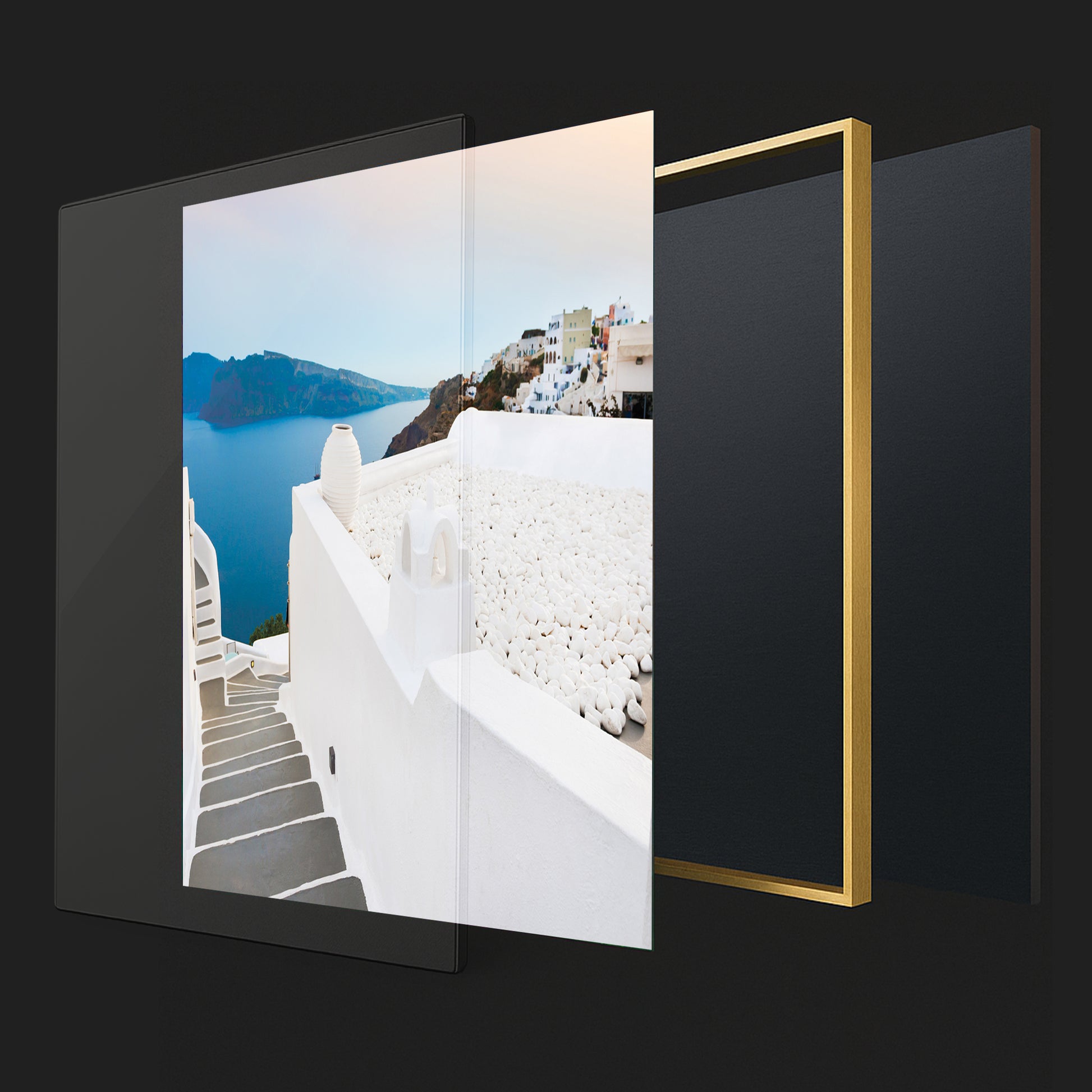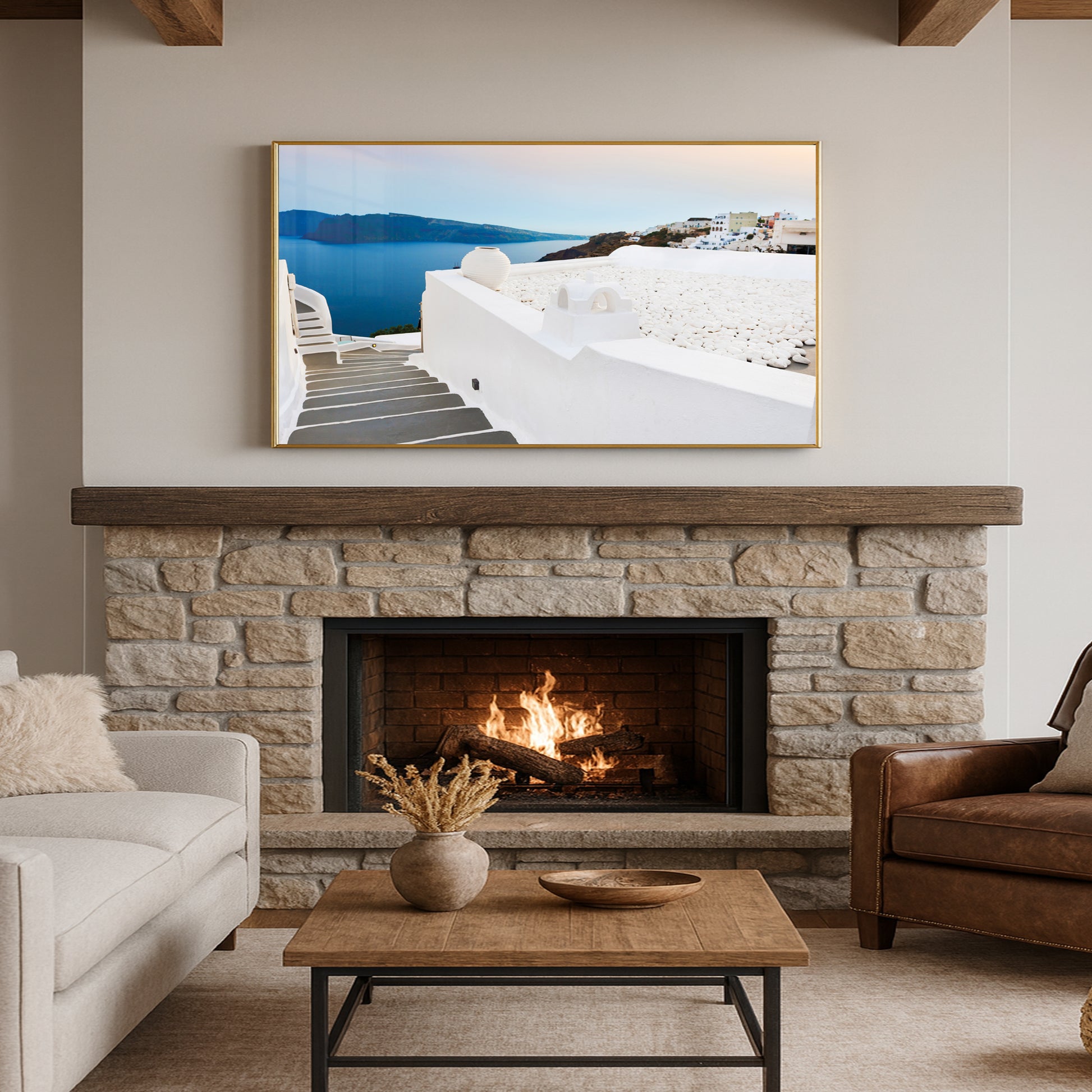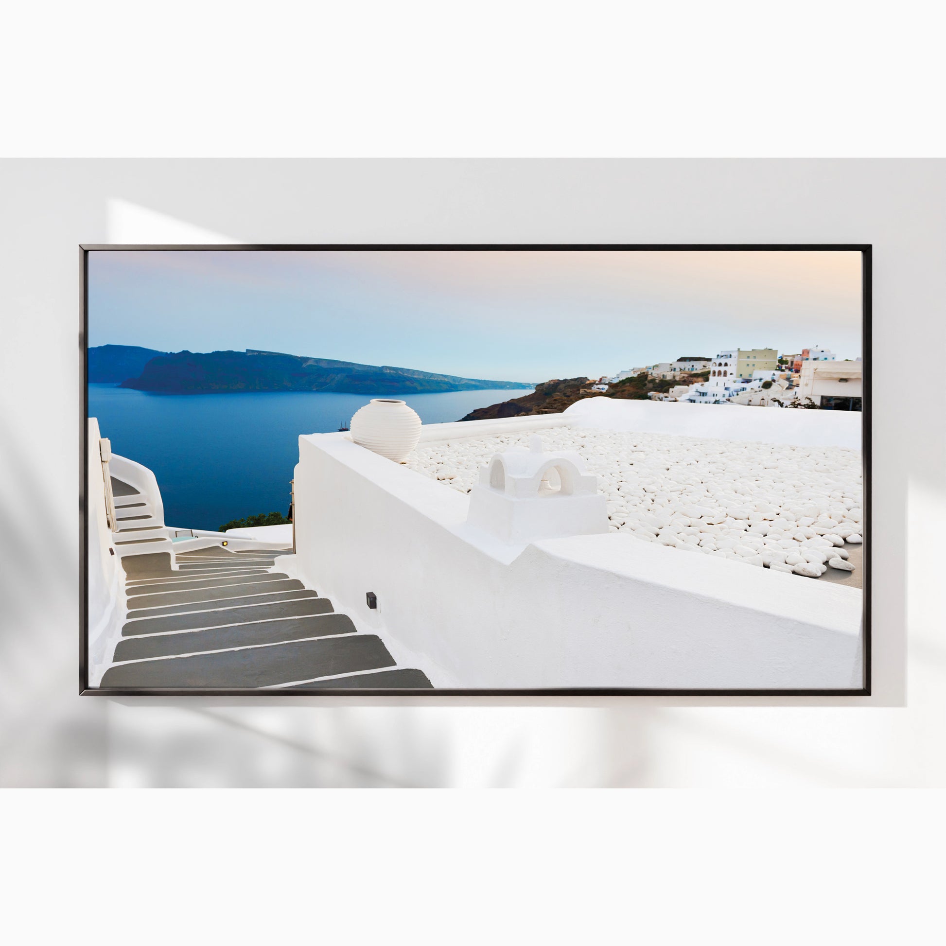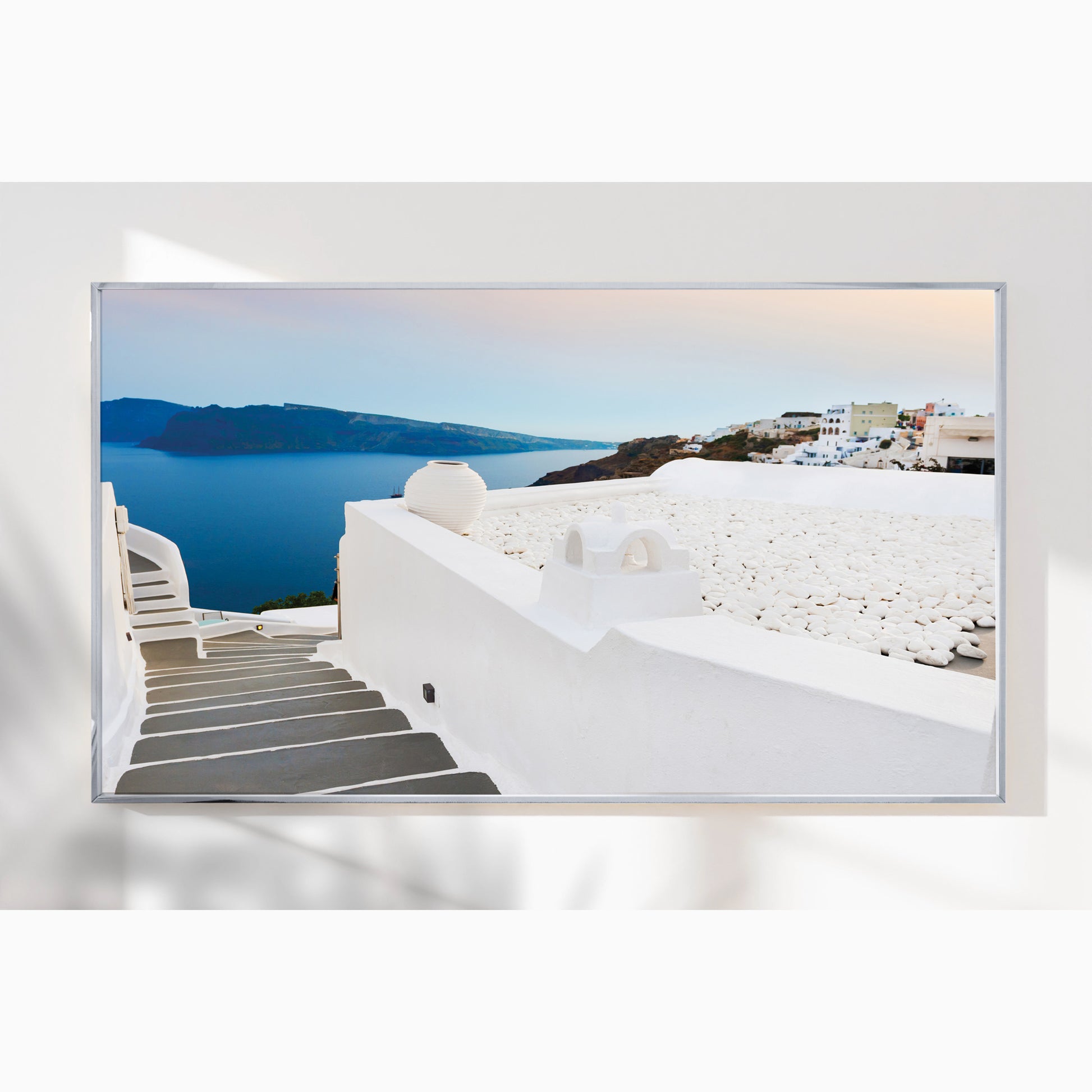 Embrace peaceful minimalism with this wall art of Santorini’s soft, curved stairs descending alongside a cliff with sweeping Aegean Sea views. White stones and traditional architecture evoke harmony and timeless elegance.