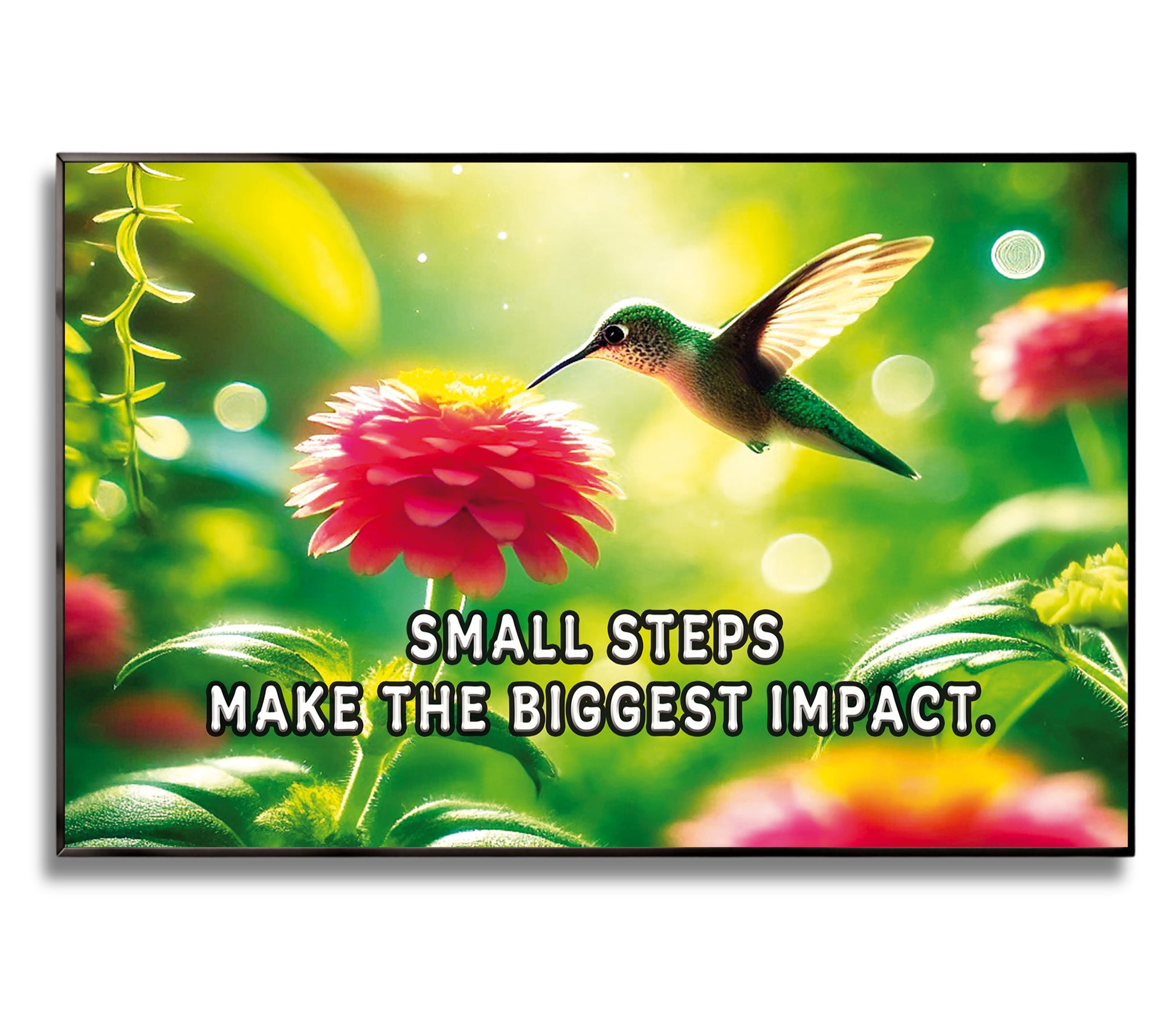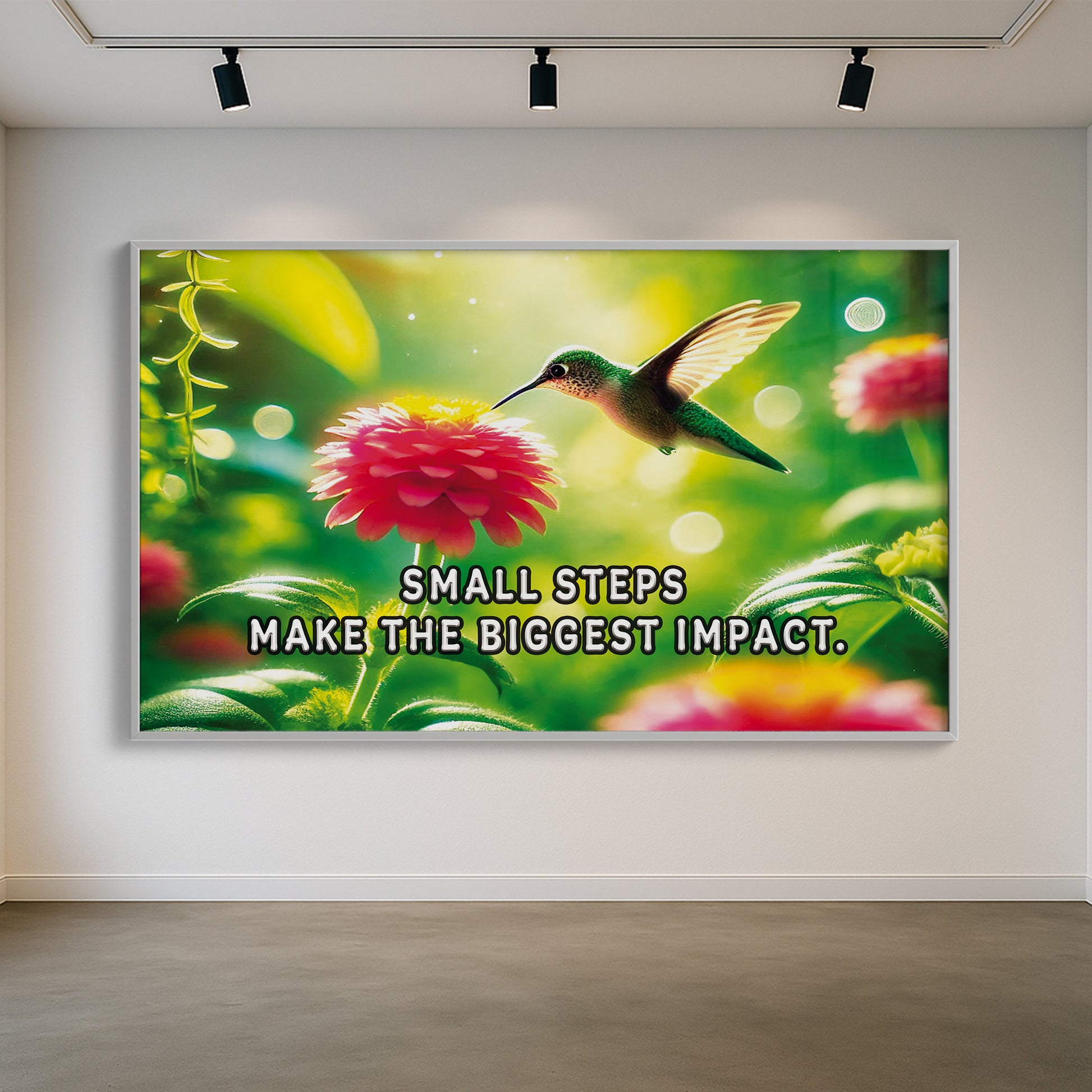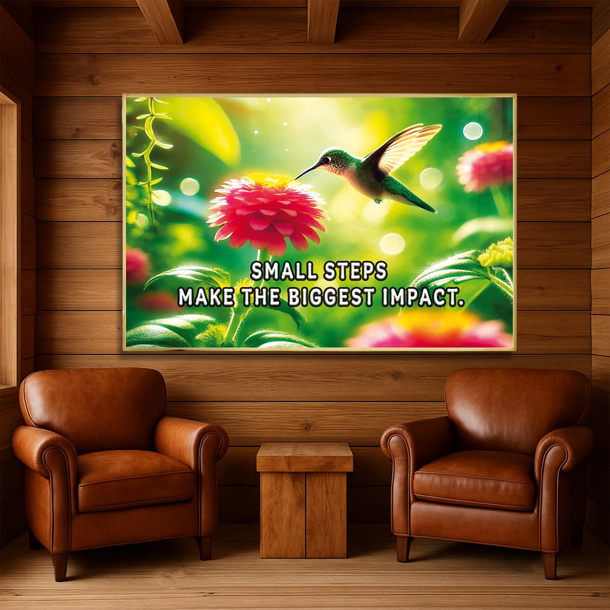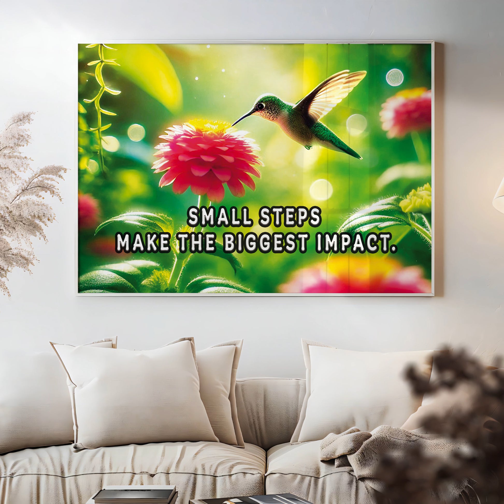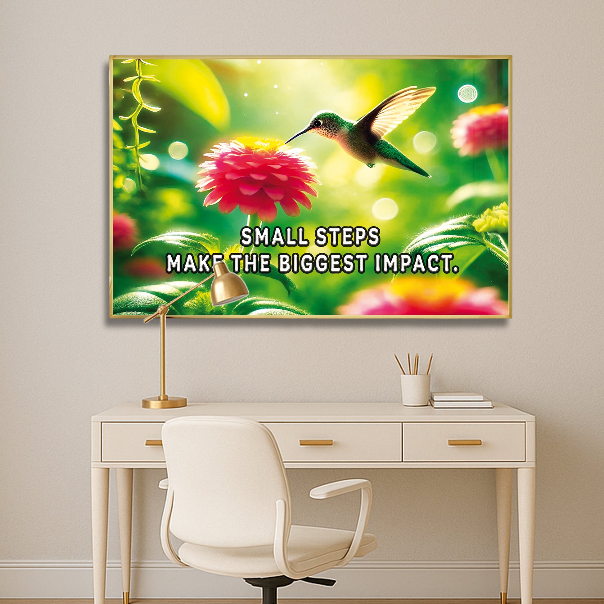 Infuse your space with the magic of nature and progress through this radiant scene of a hummingbird gently sipping from a vibrant pink bloom. Surrounded by glowing greens and soft light, the art whispers encouragement with the phrase “Small steps make the biggest impact.” Perfect for nurseries, offices, or cozy corners where growth is nurtured.