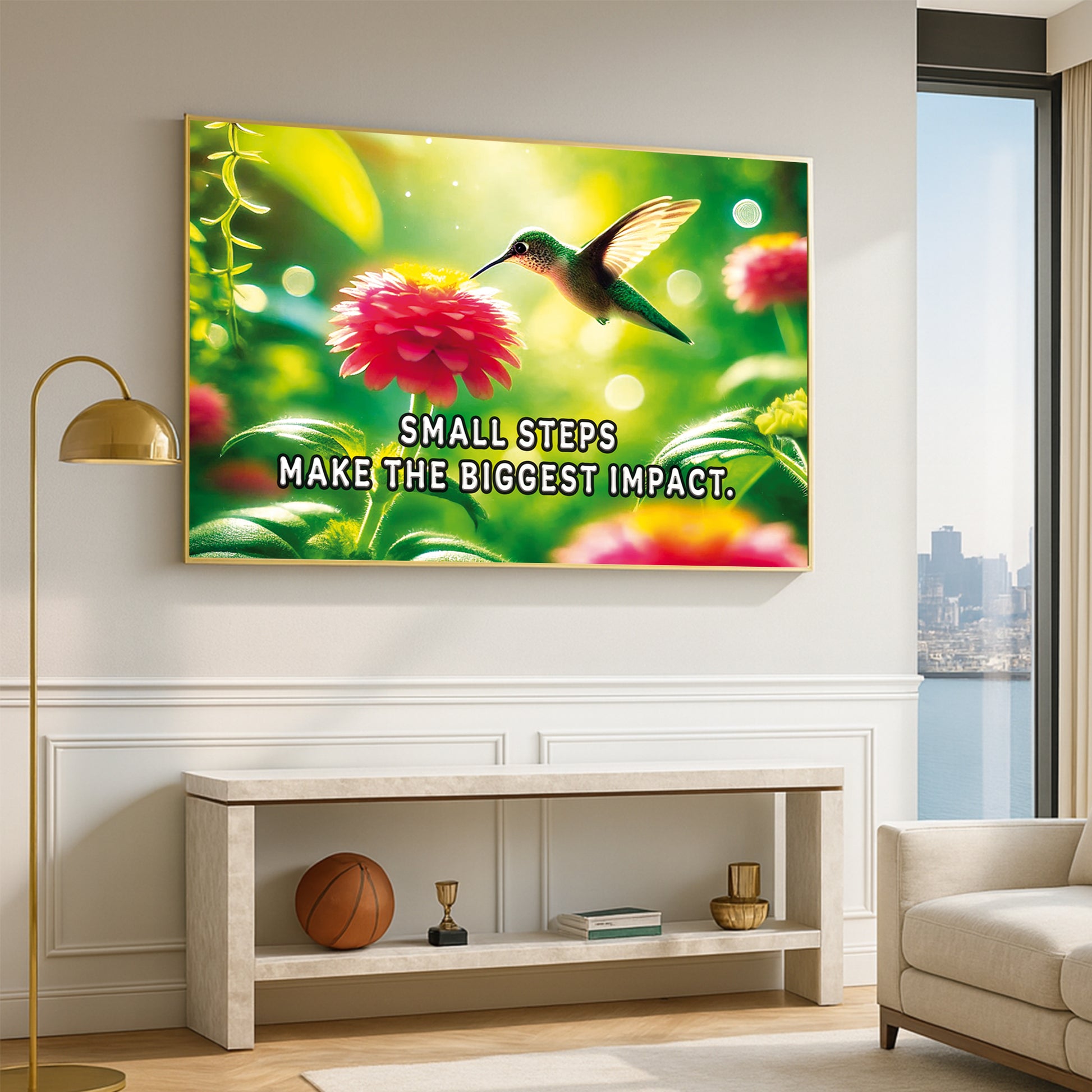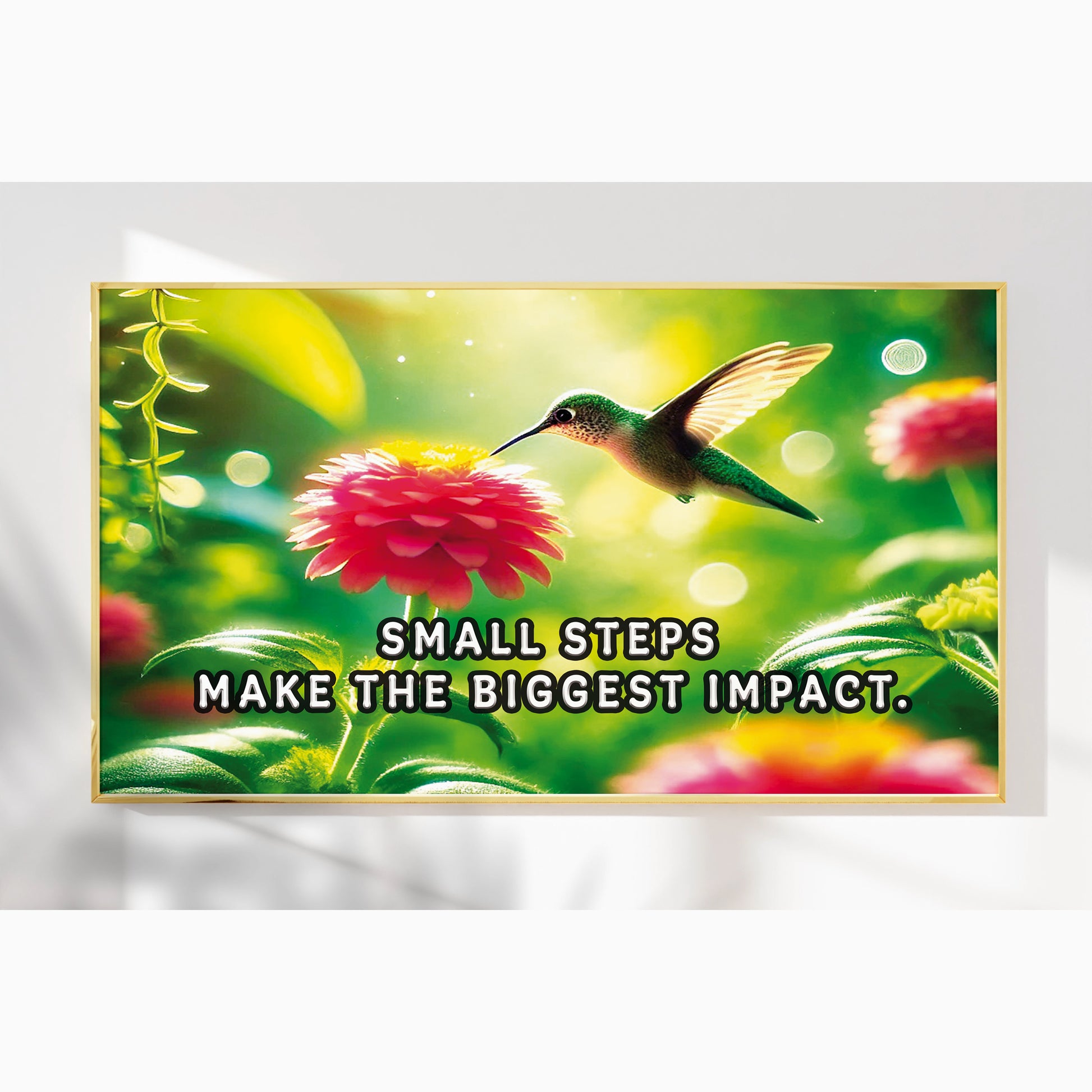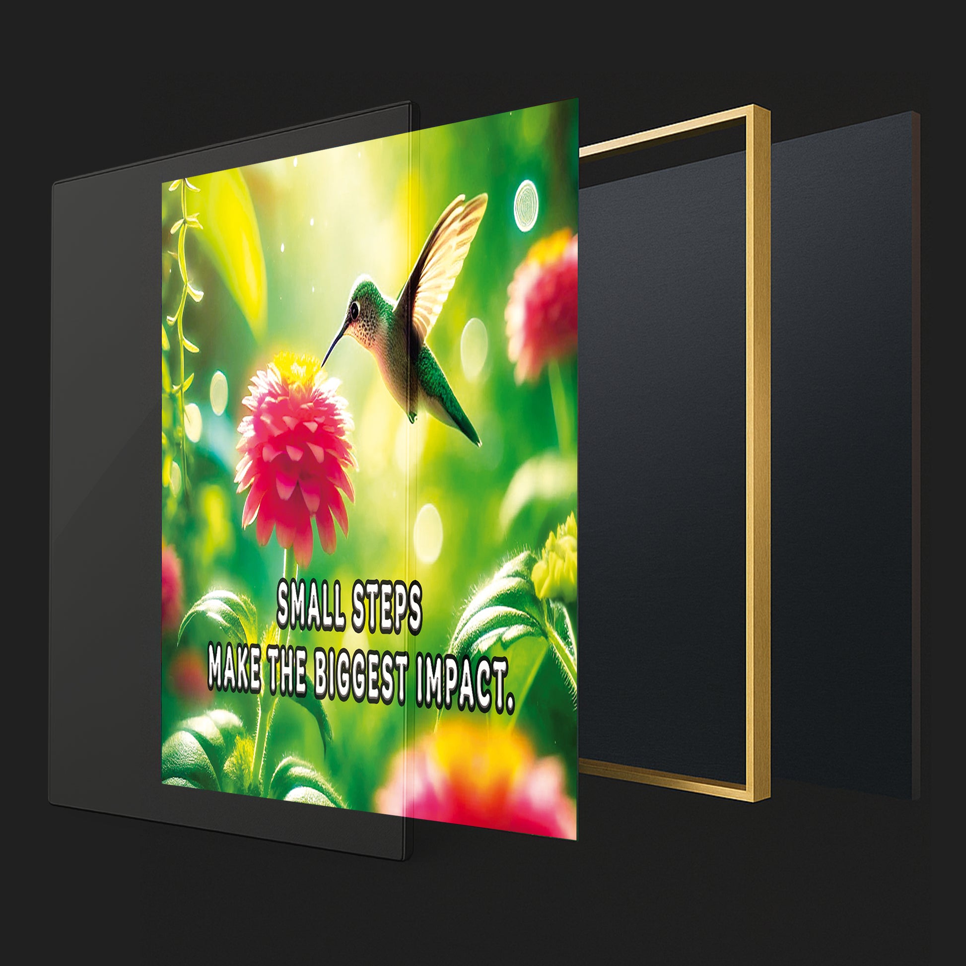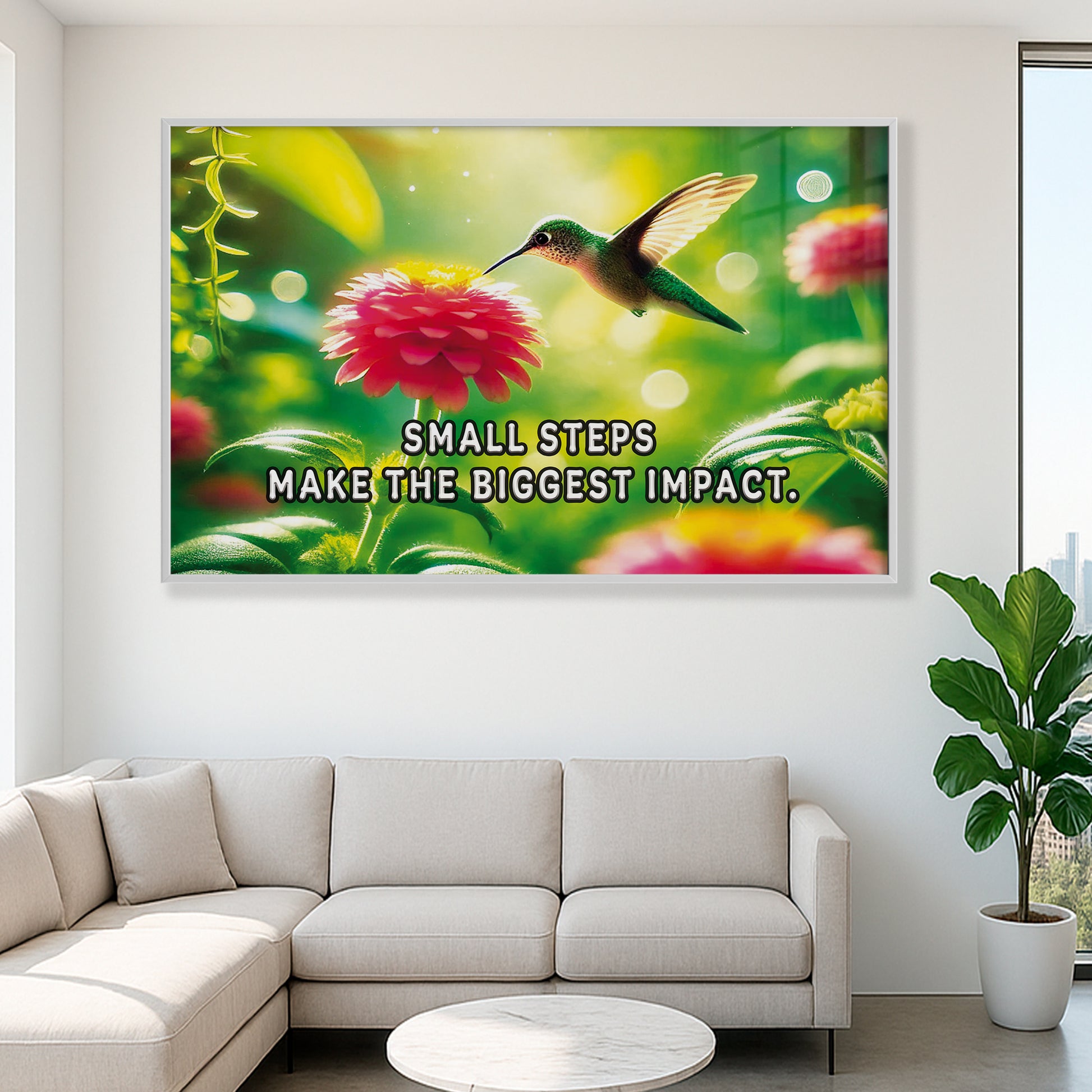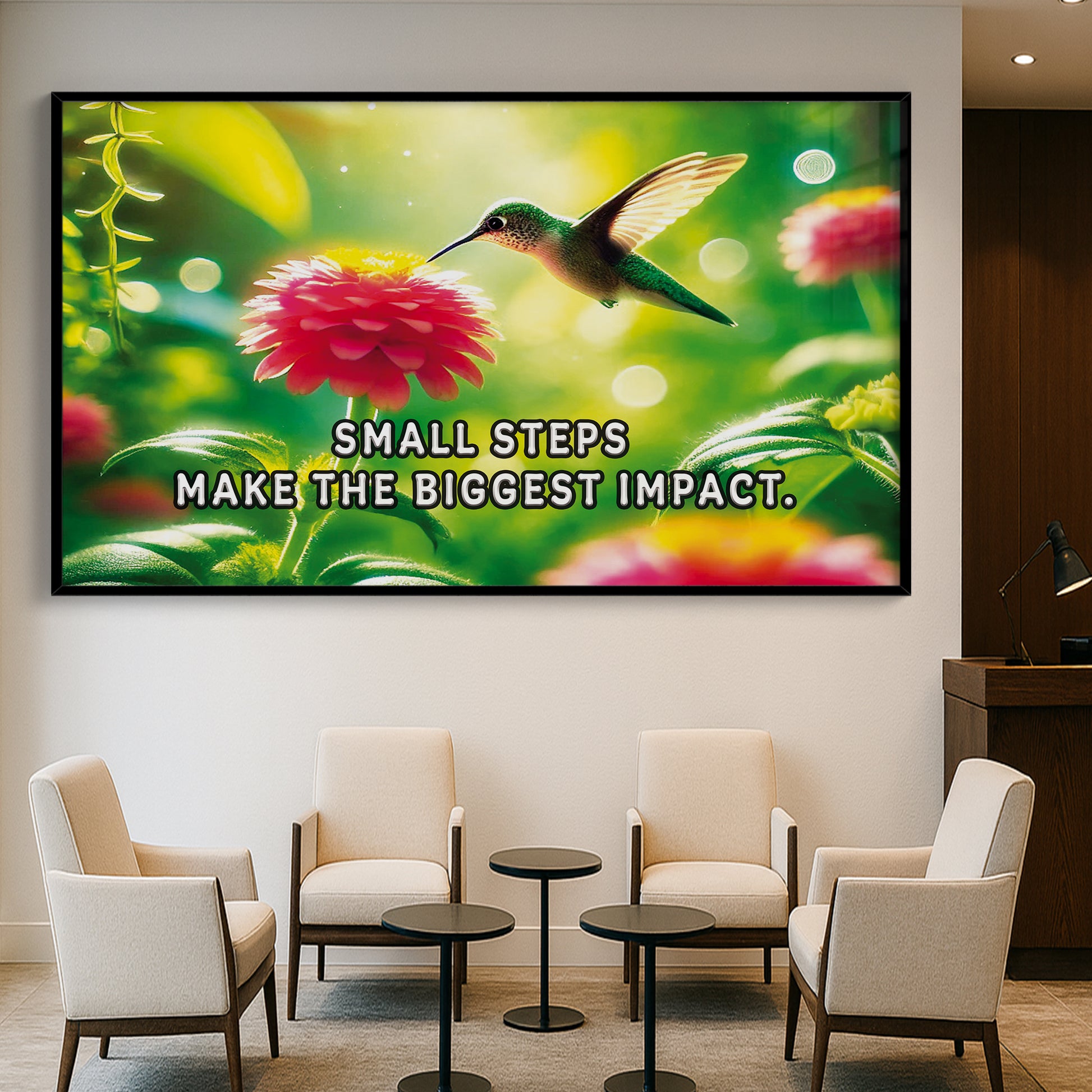 Infuse your space with the magic of nature and progress through this radiant scene of a hummingbird gently sipping from a vibrant pink bloom. Surrounded by glowing greens and soft light, the art whispers encouragement with the phrase “Small steps make the biggest impact.” Perfect for nurseries, offices, or cozy corners where growth is nurtured.