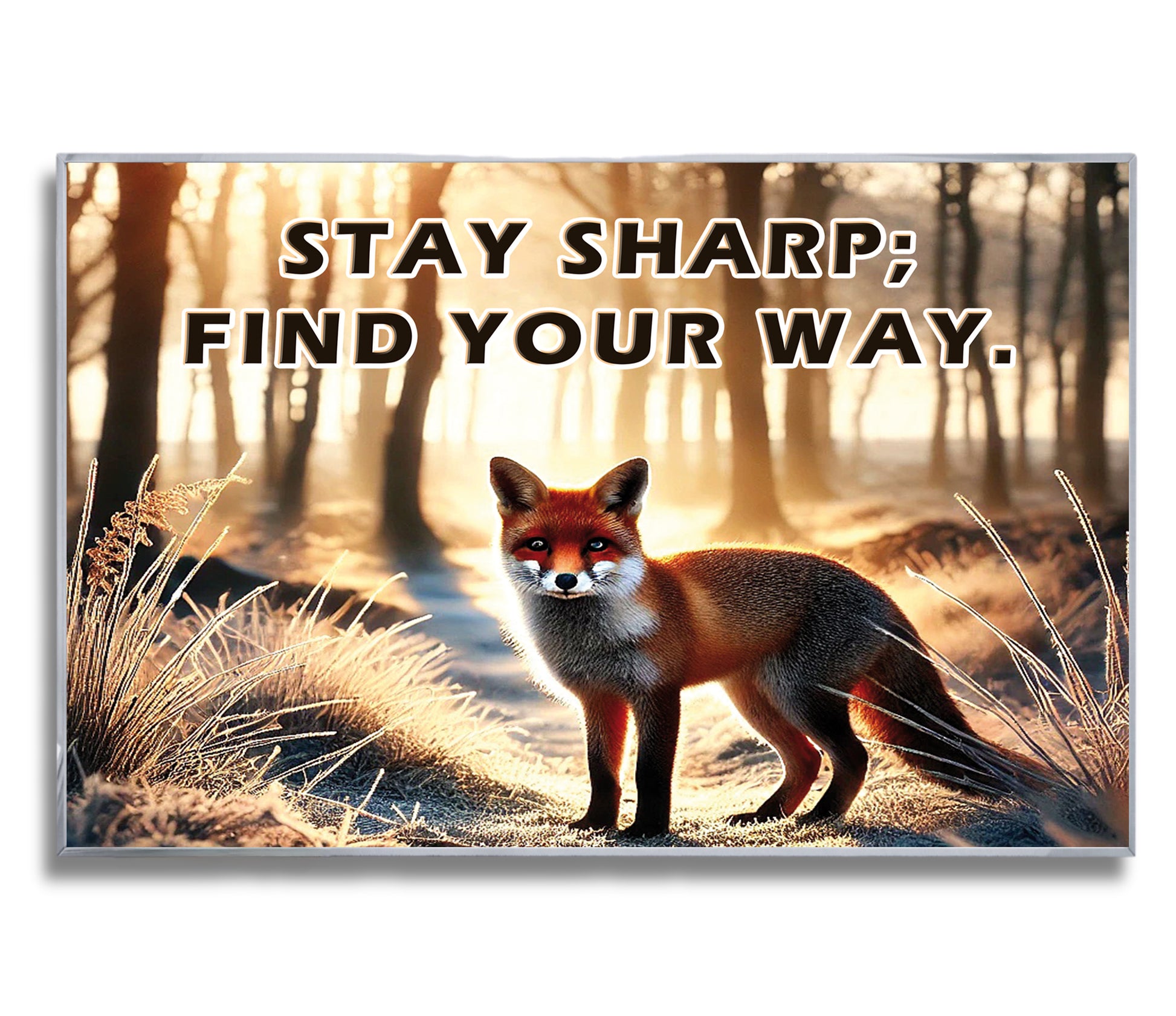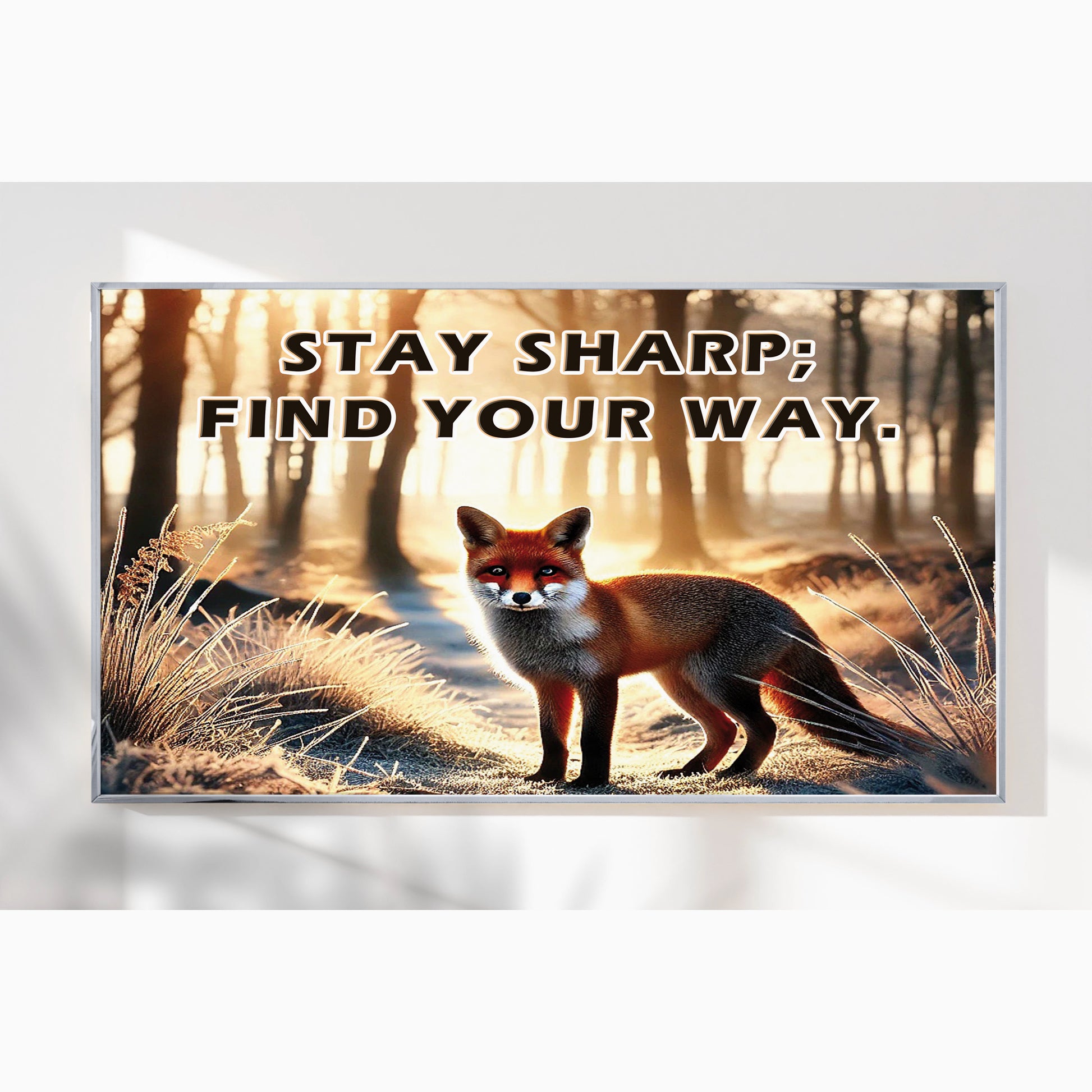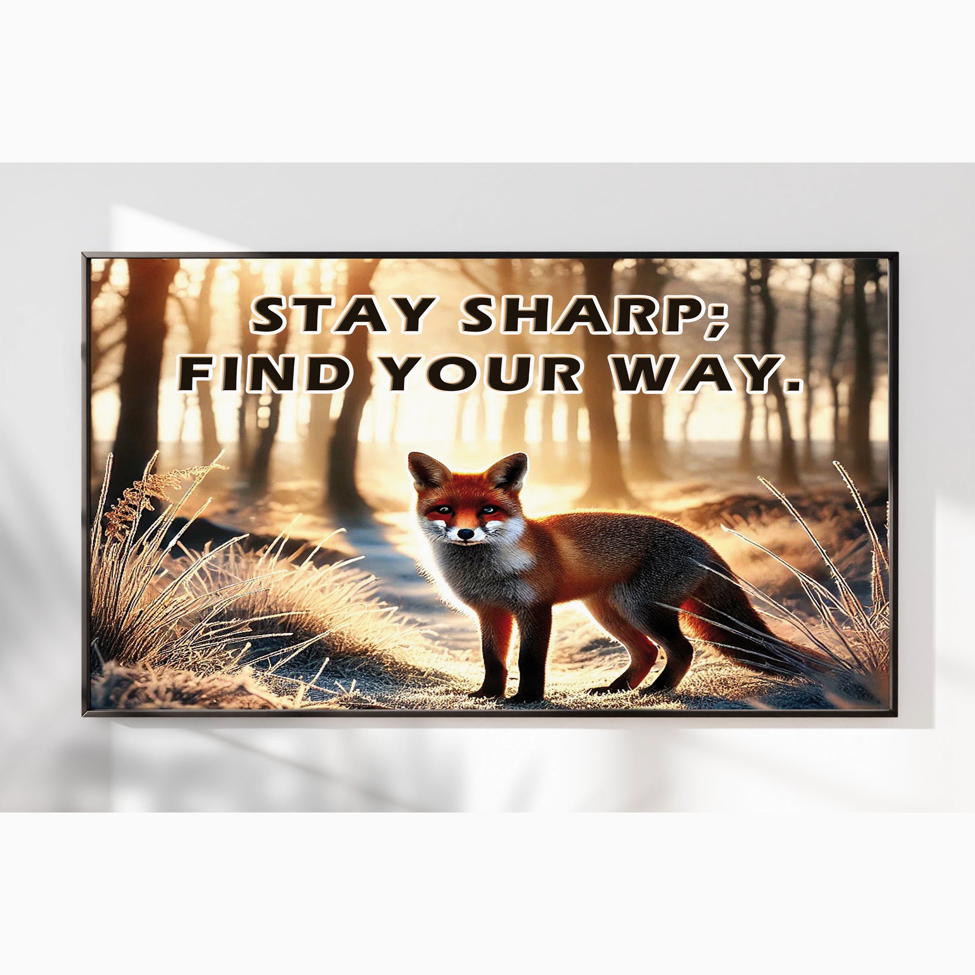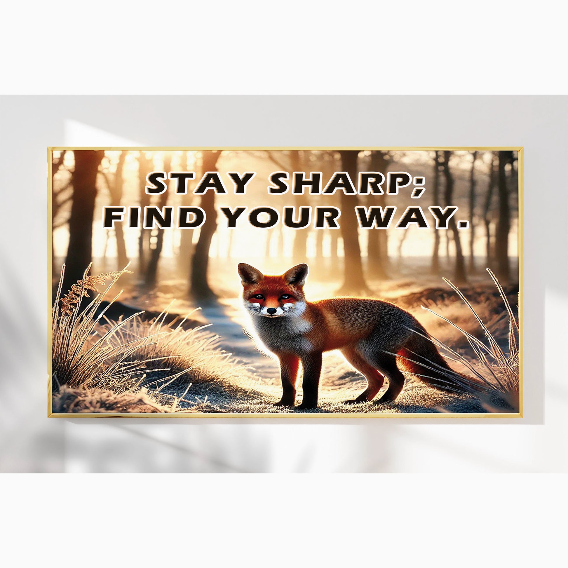 This striking fox artwork captures a moment of stillness and sharp intuition in a forest morning glow. With the empowering quote “Stay sharp; find your way”, it becomes a symbol of independence, intelligence, and self-guidance.