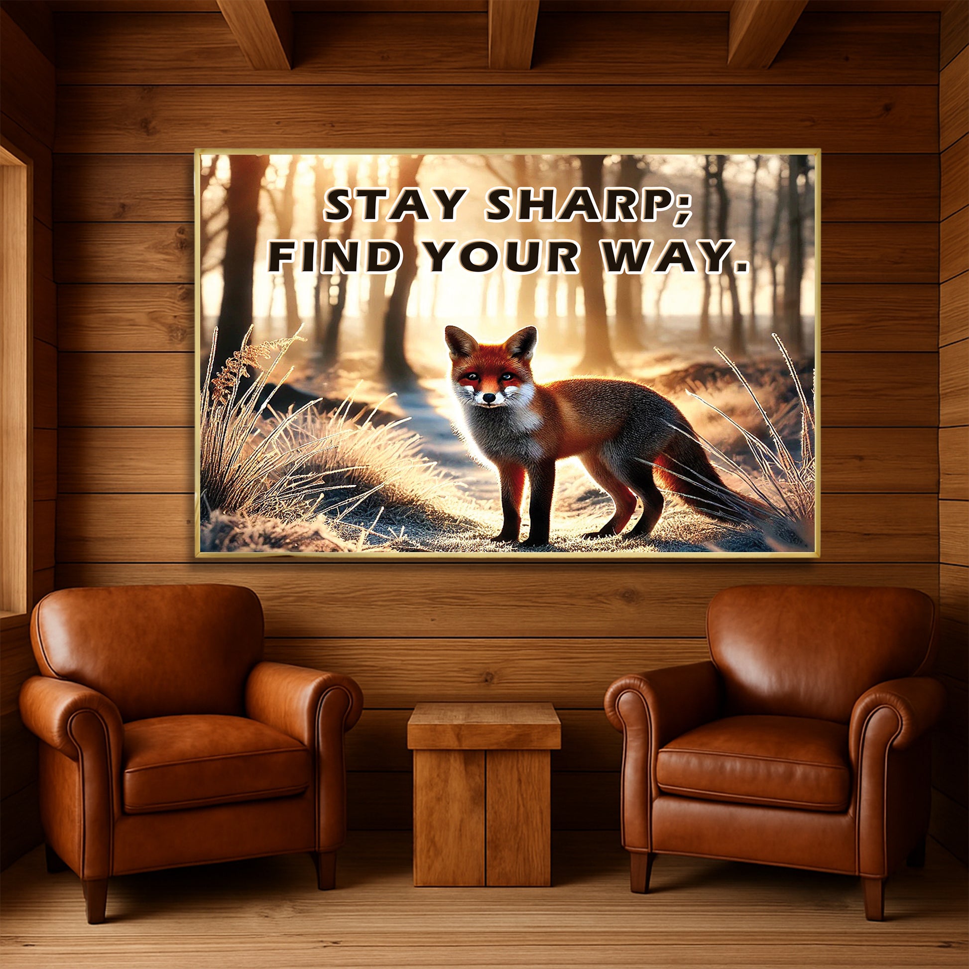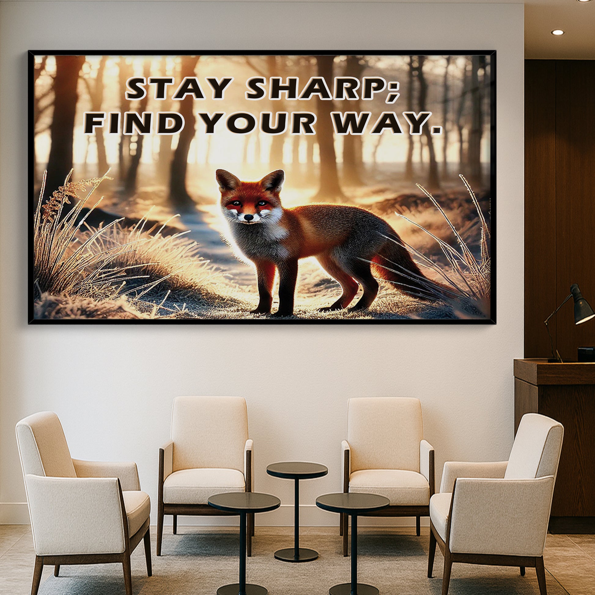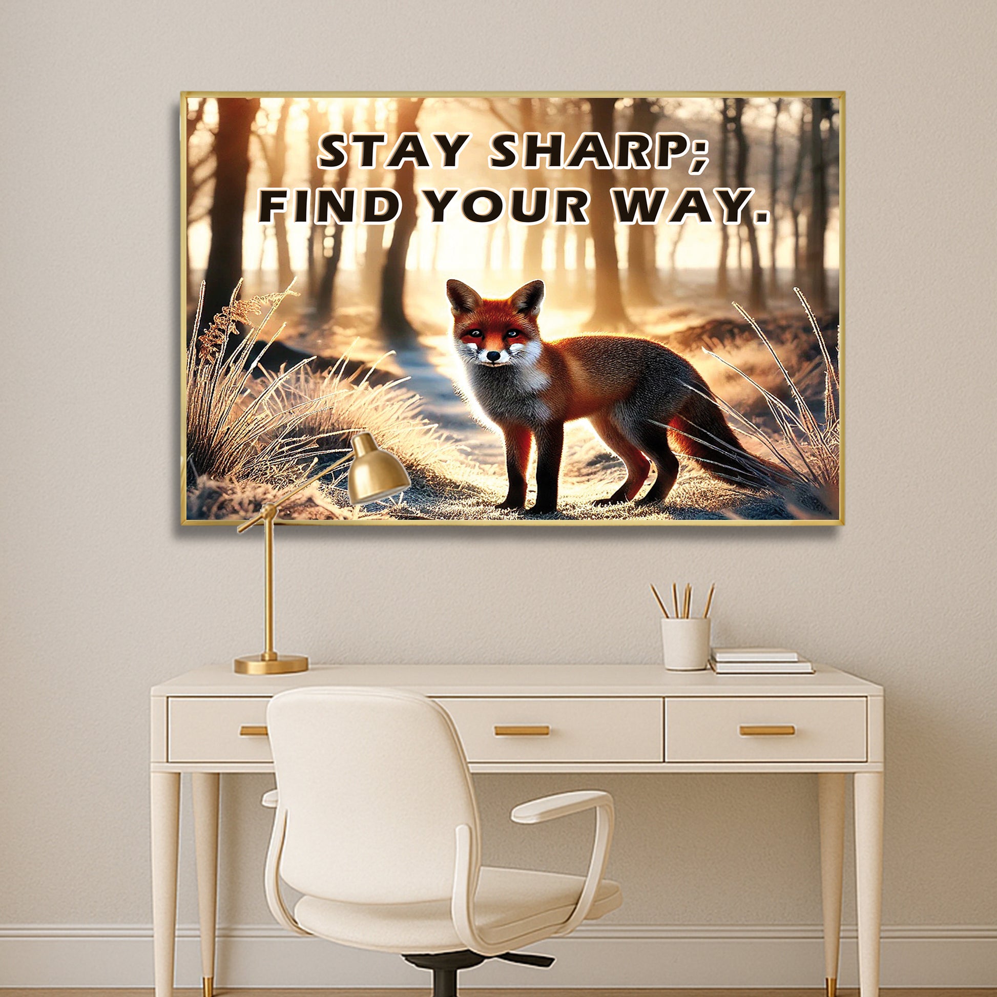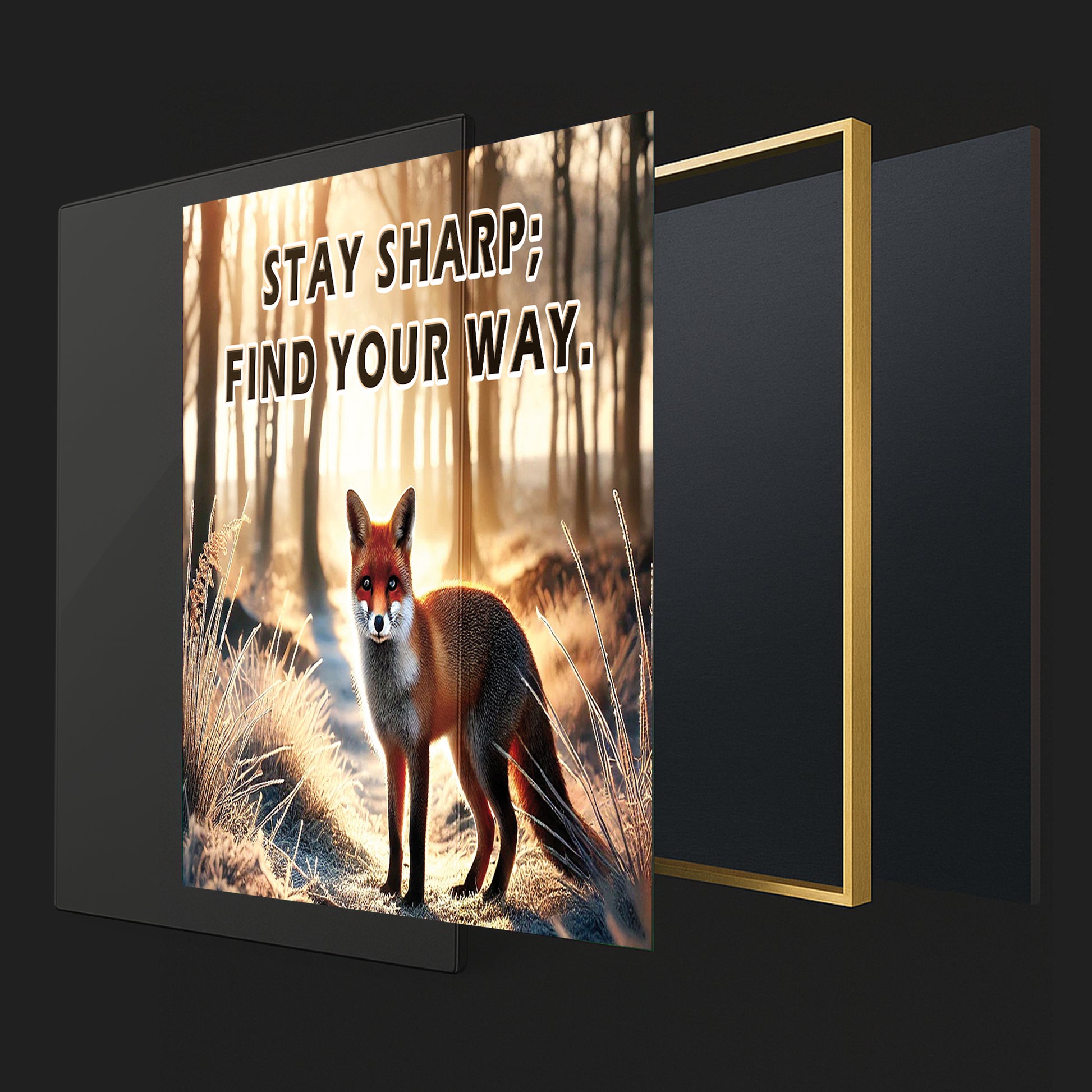 This striking fox artwork captures a moment of stillness and sharp intuition in a forest morning glow. With the empowering quote “Stay sharp; find your way”, it becomes a symbol of independence, intelligence, and self-guidance.