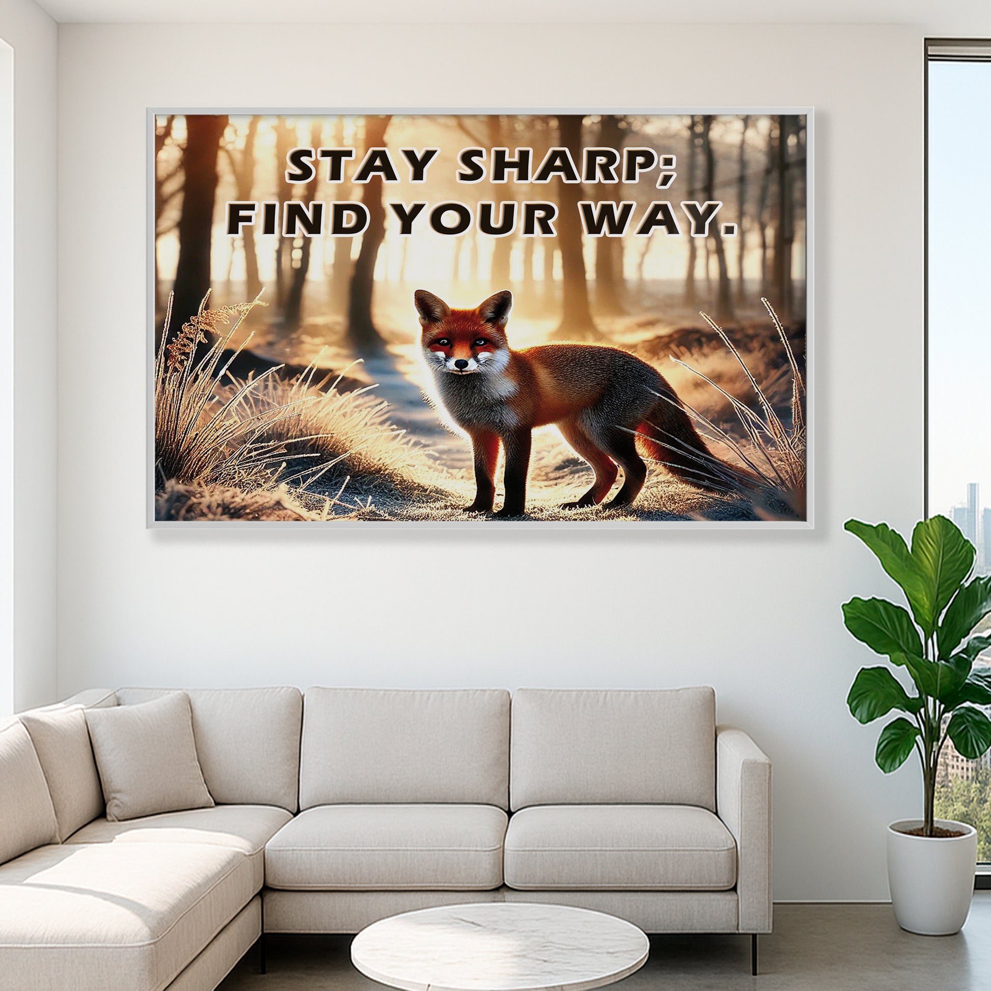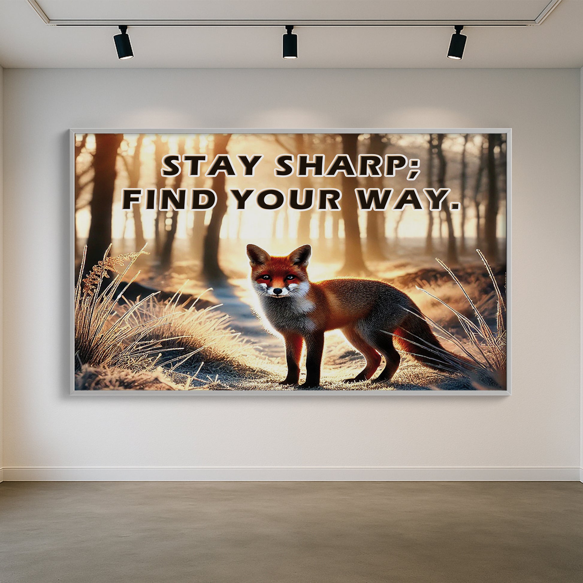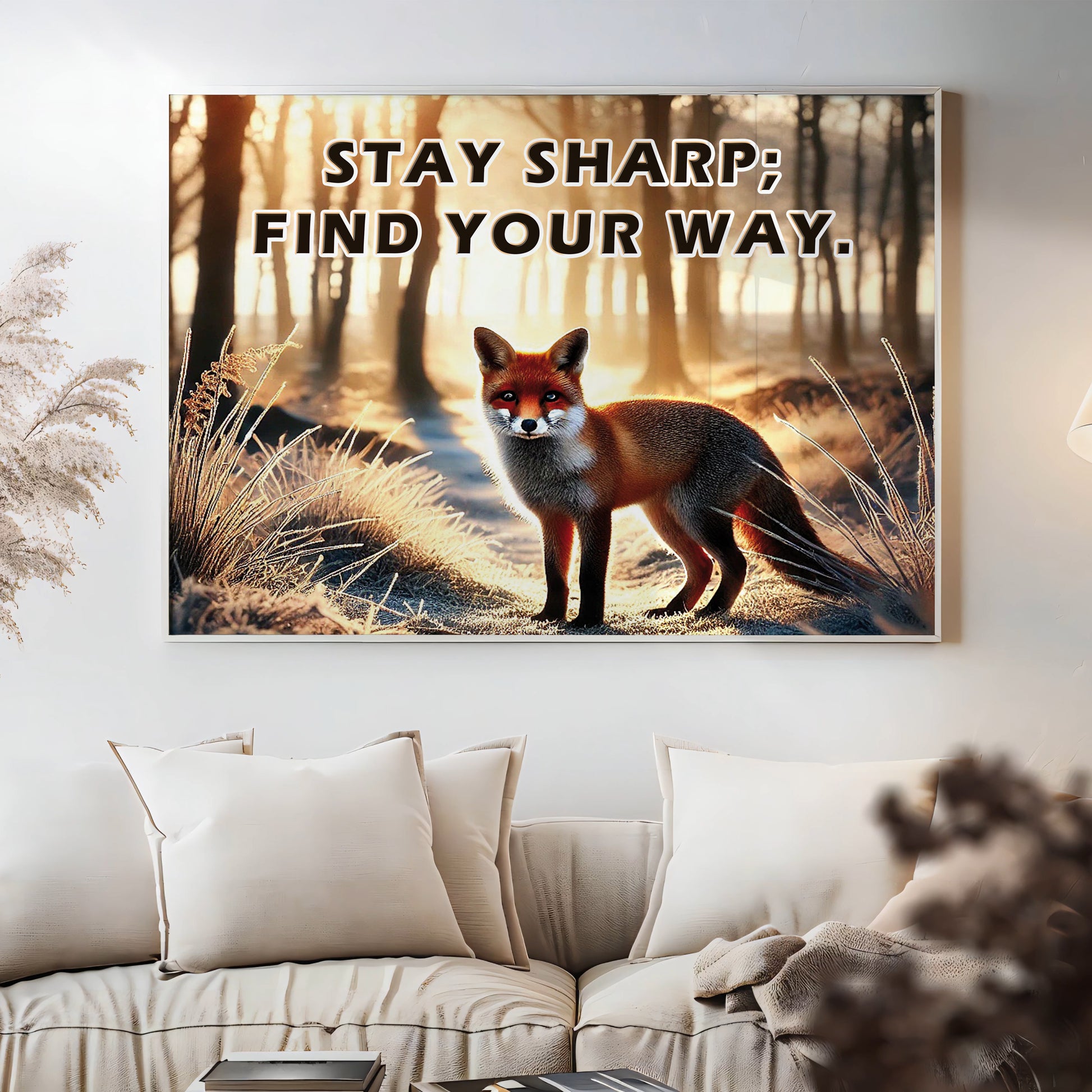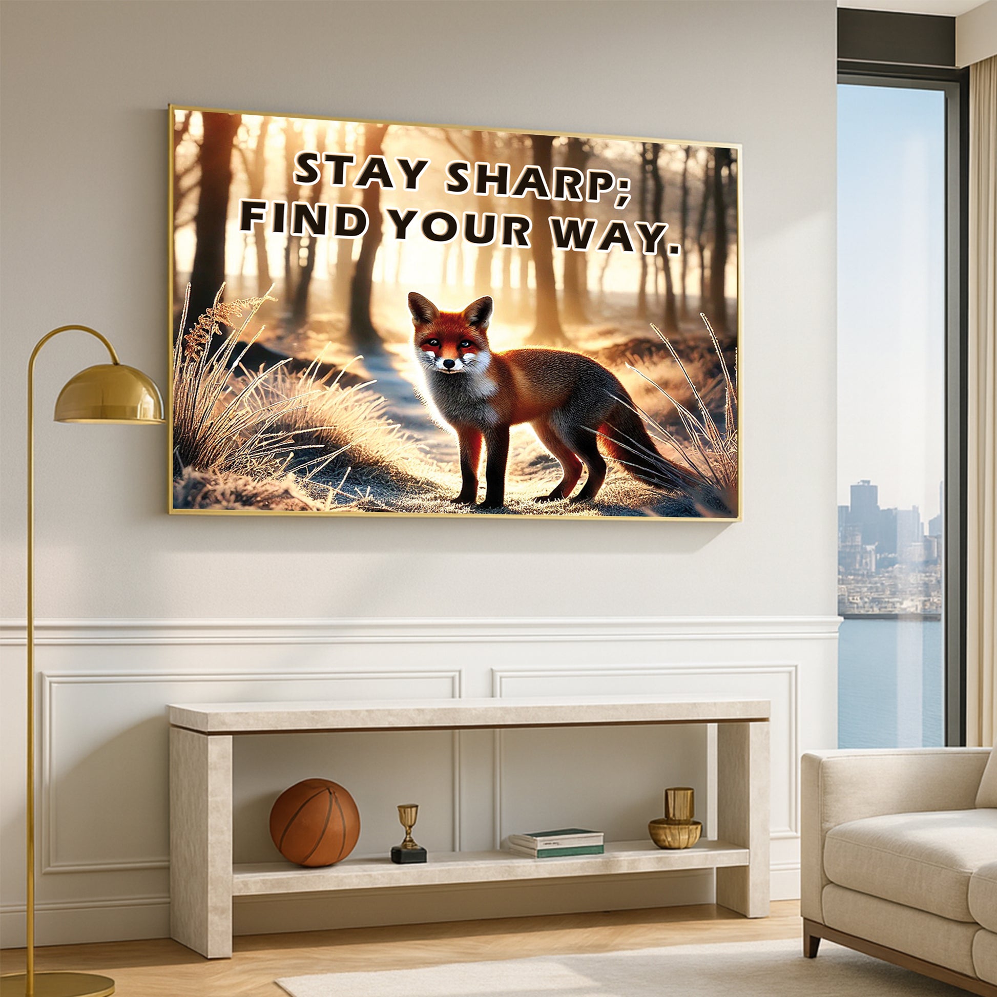 This striking fox artwork captures a moment of stillness and sharp intuition in a forest morning glow. With the empowering quote “Stay sharp; find your way”, it becomes a symbol of independence, intelligence, and self-guidance.