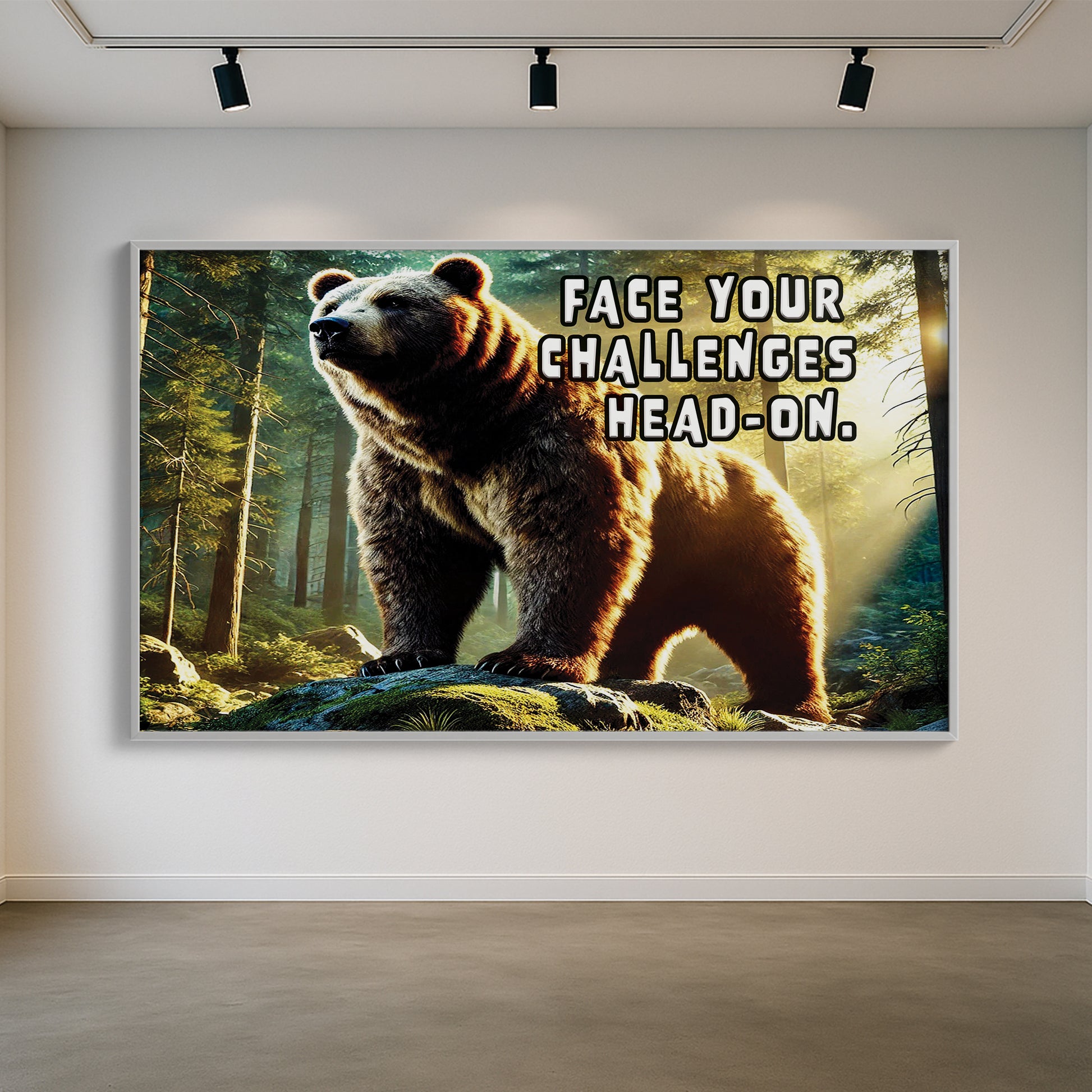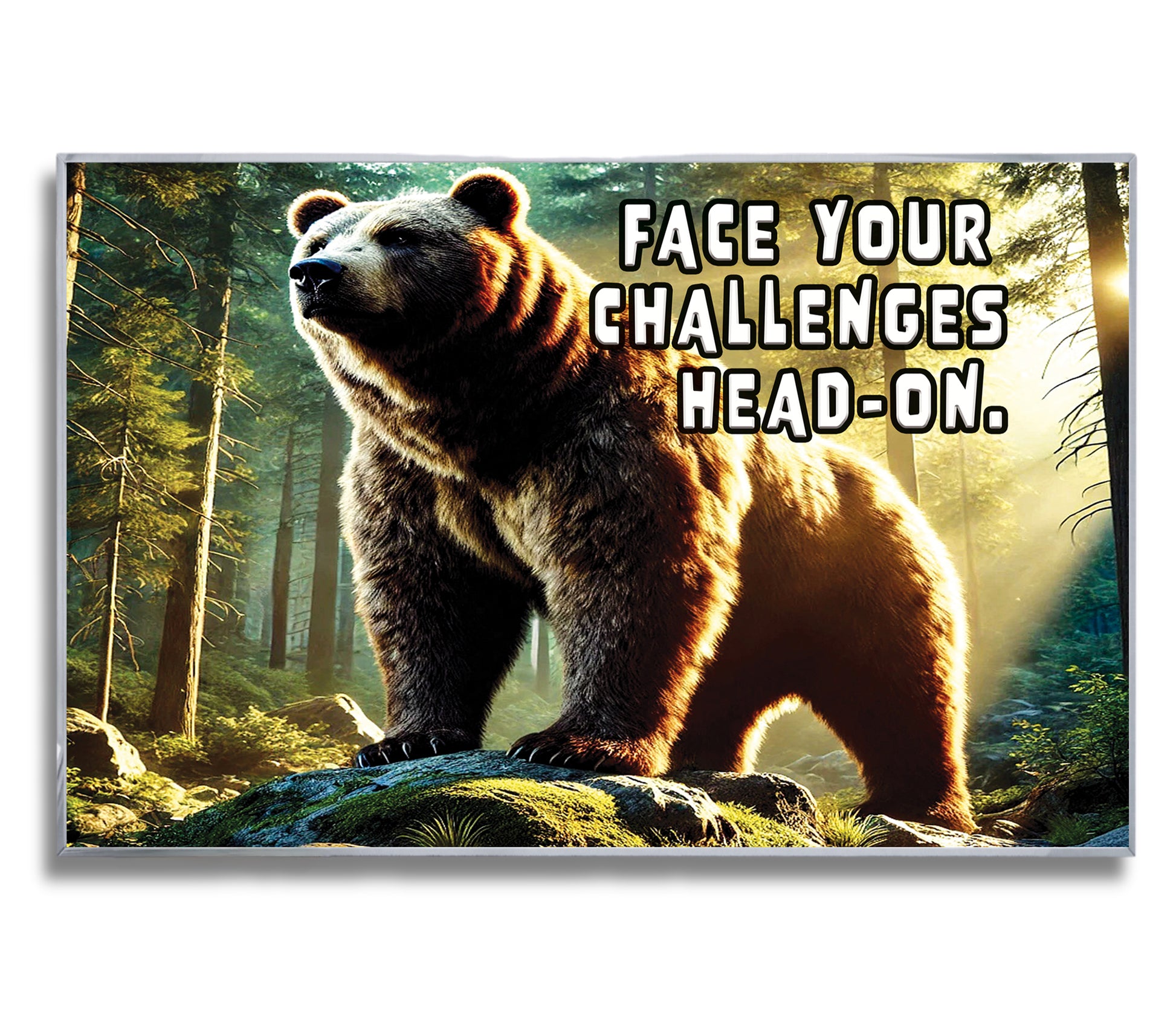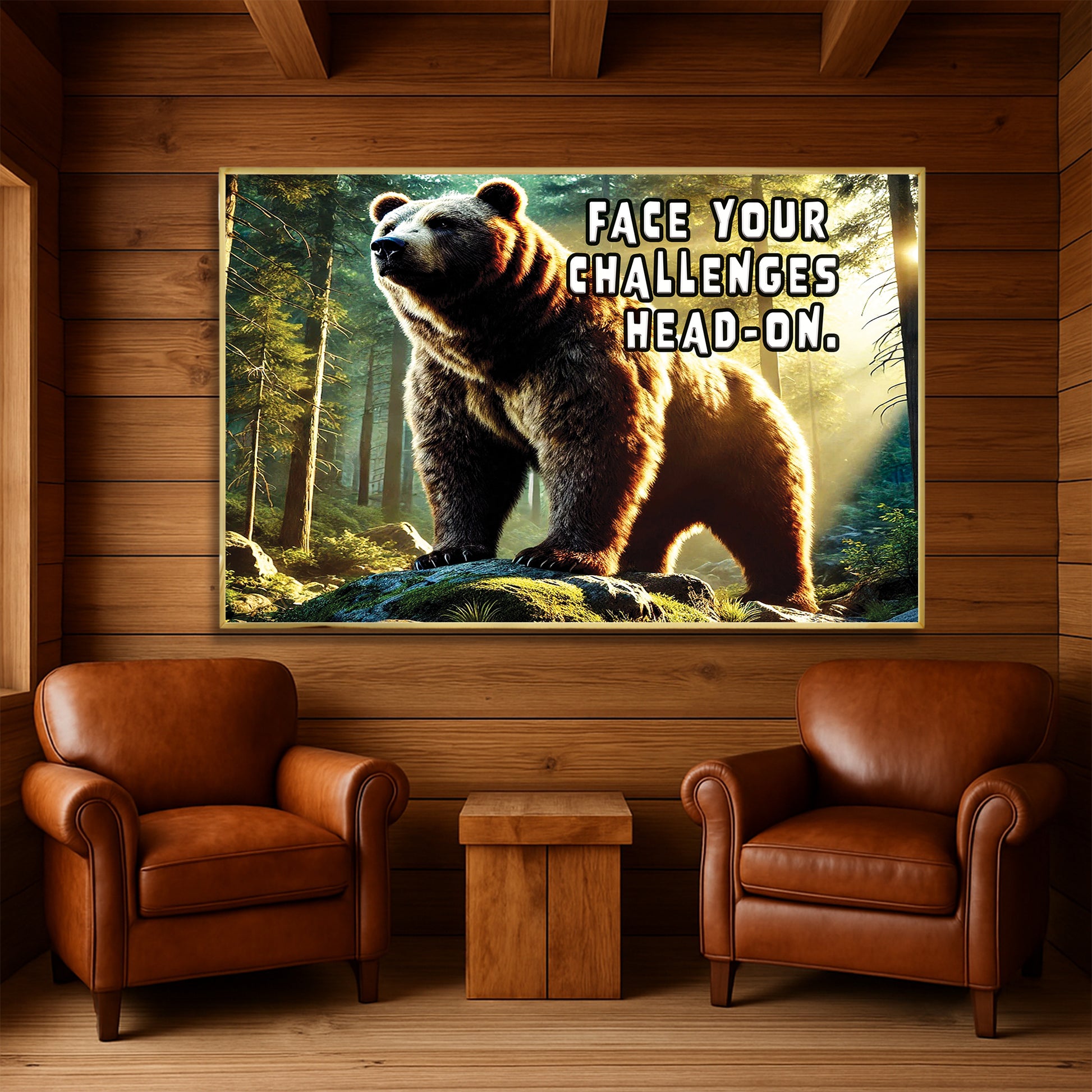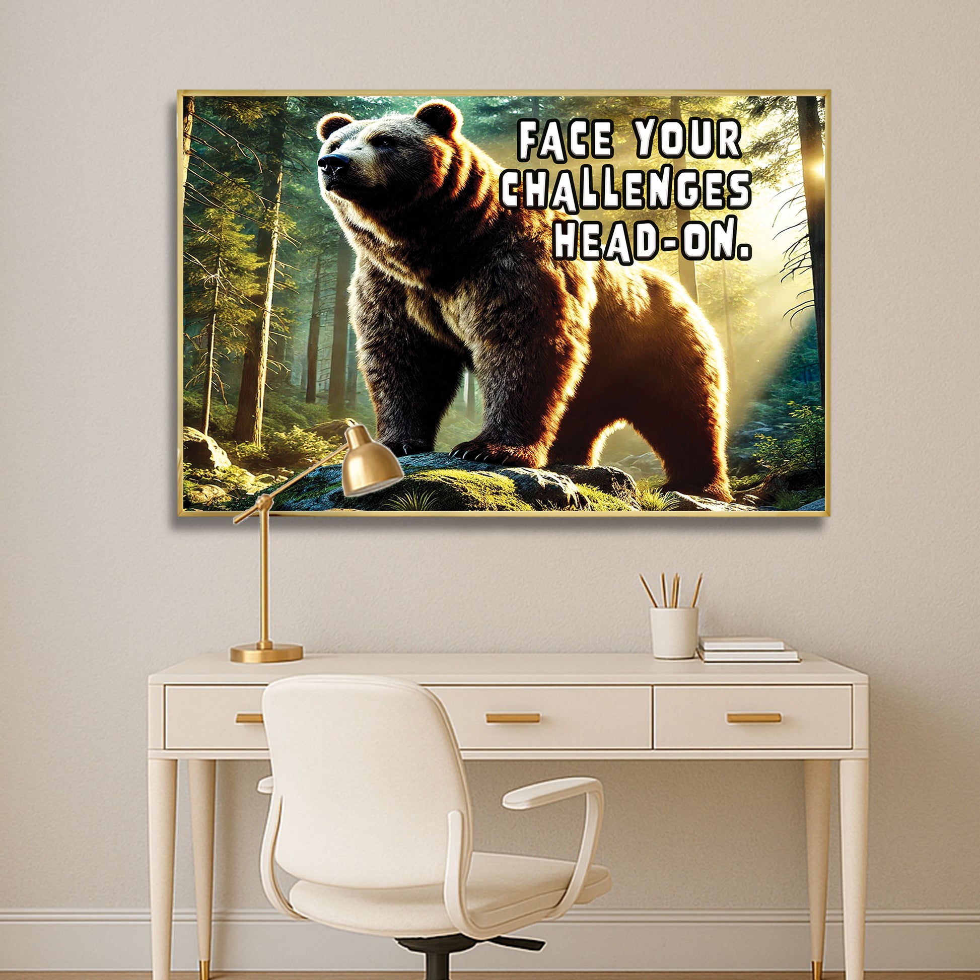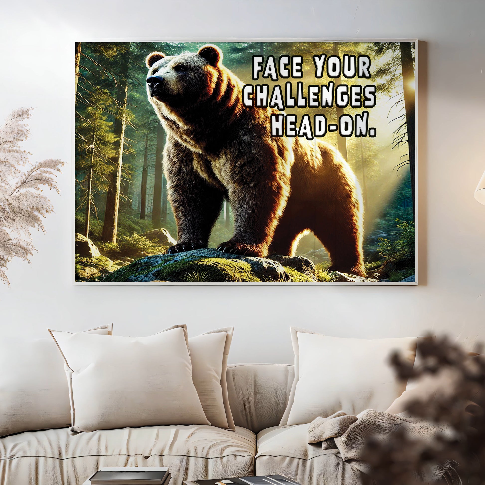 Stand tall with this commanding bear wall art set deep in the forest. Featuring the quote “Face your challenges head-on,” this piece is a daily reminder of resilience and courage. The high-definition print highlights every powerful detail in a bold finish.
