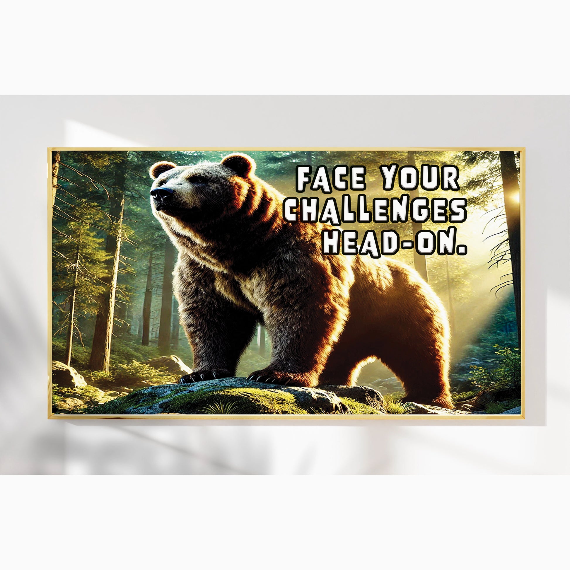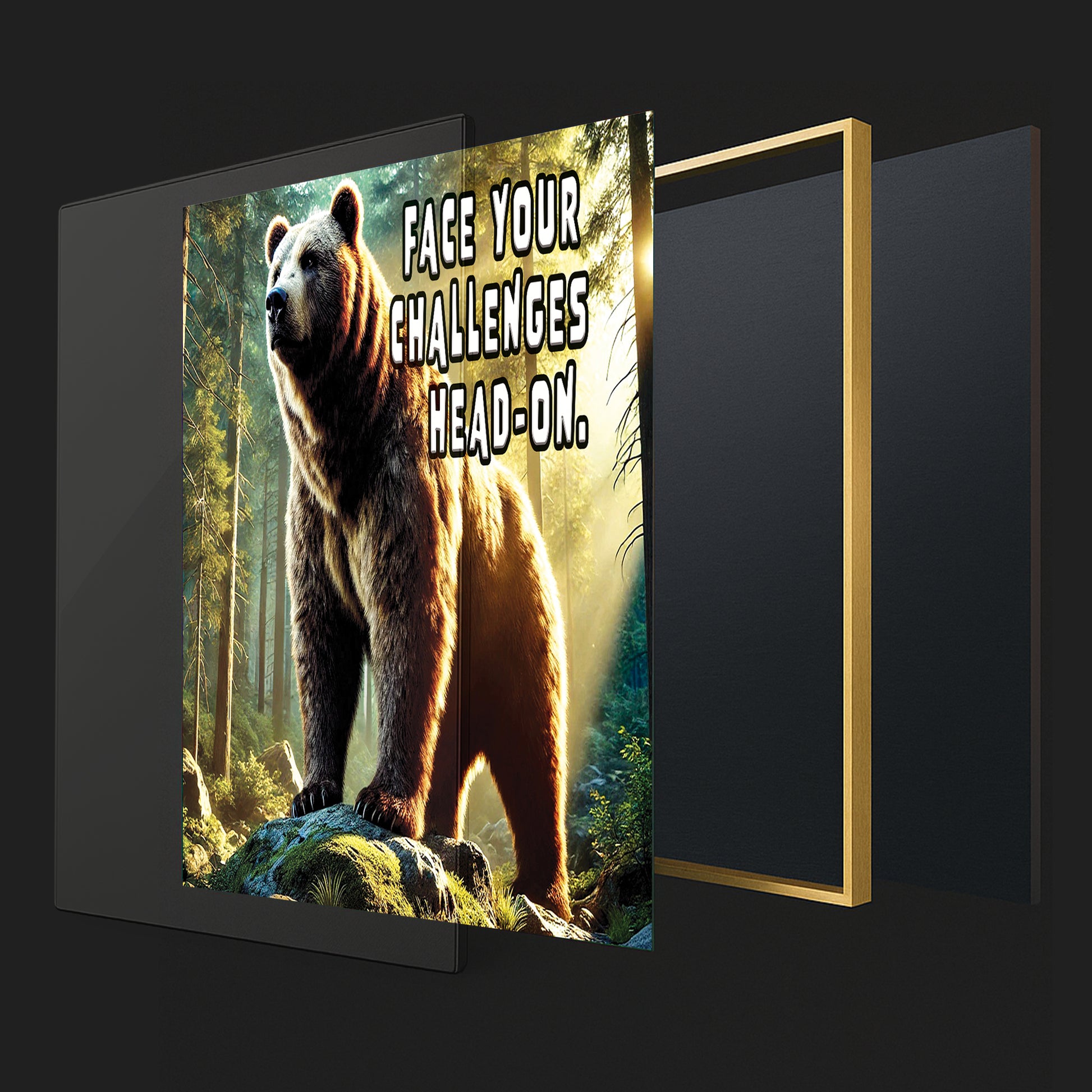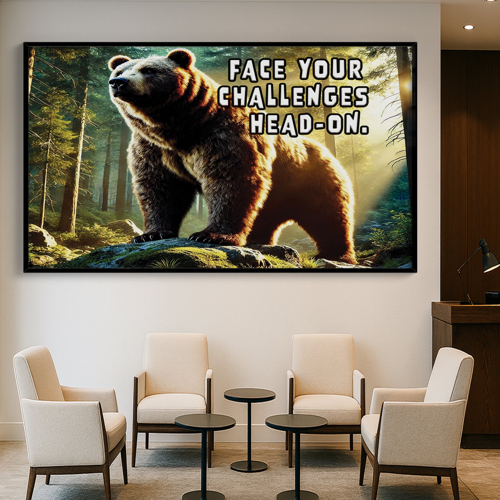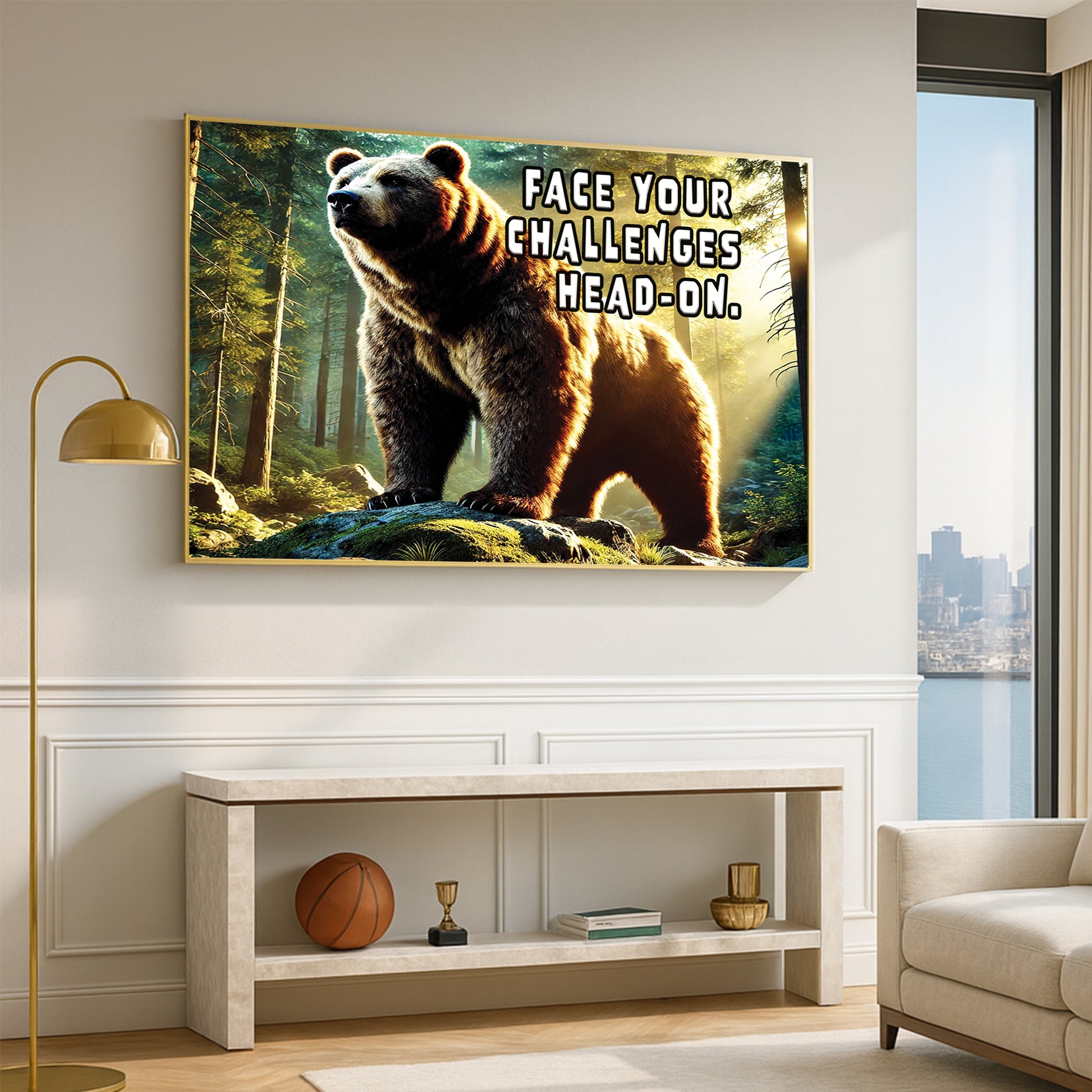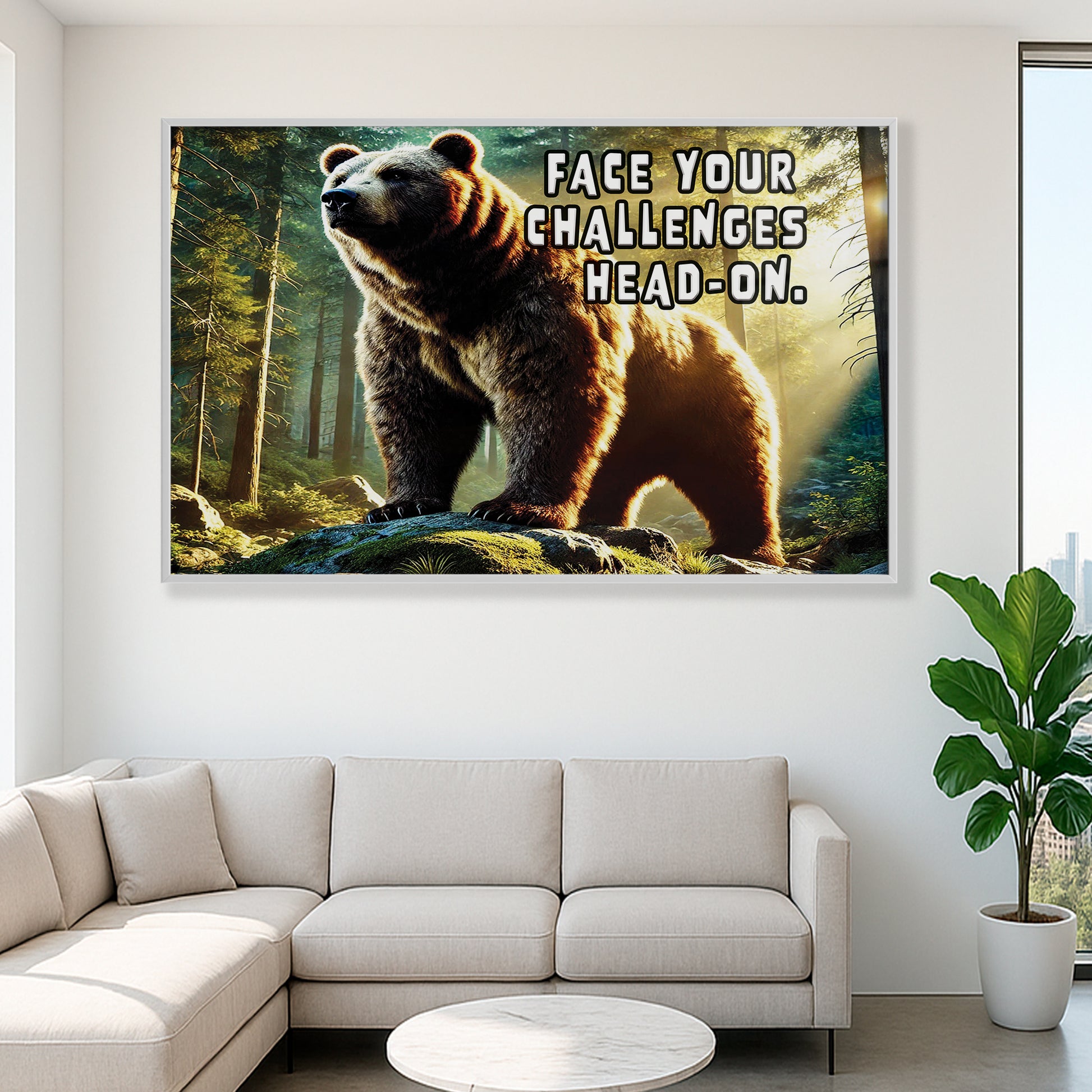 Stand tall with this commanding bear wall art set deep in the forest. Featuring the quote “Face your challenges head-on,” this piece is a daily reminder of resilience and courage. The high-definition print highlights every powerful detail in a bold finish.