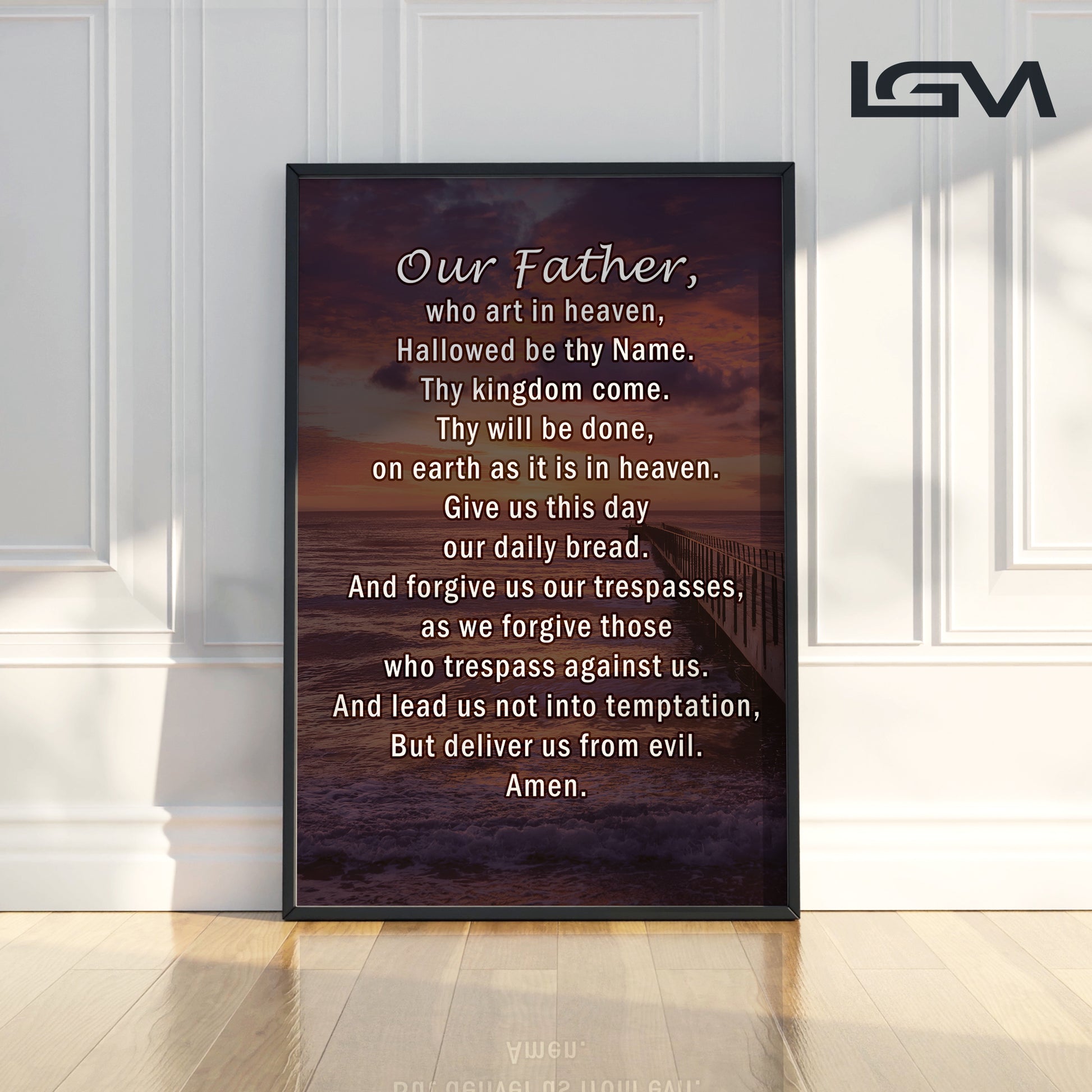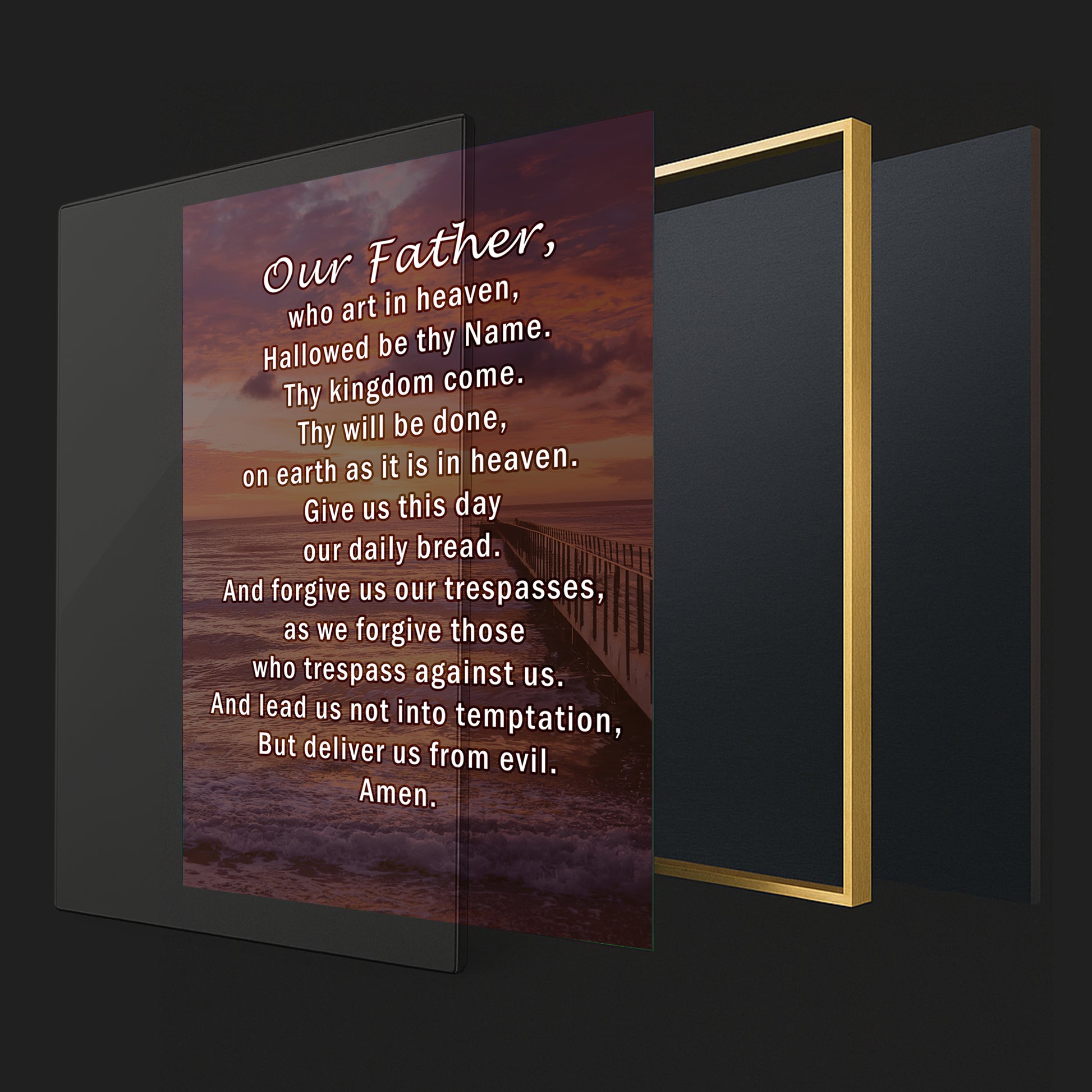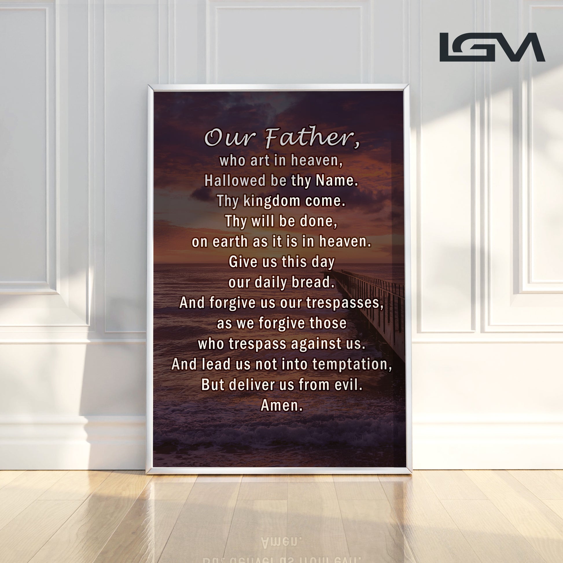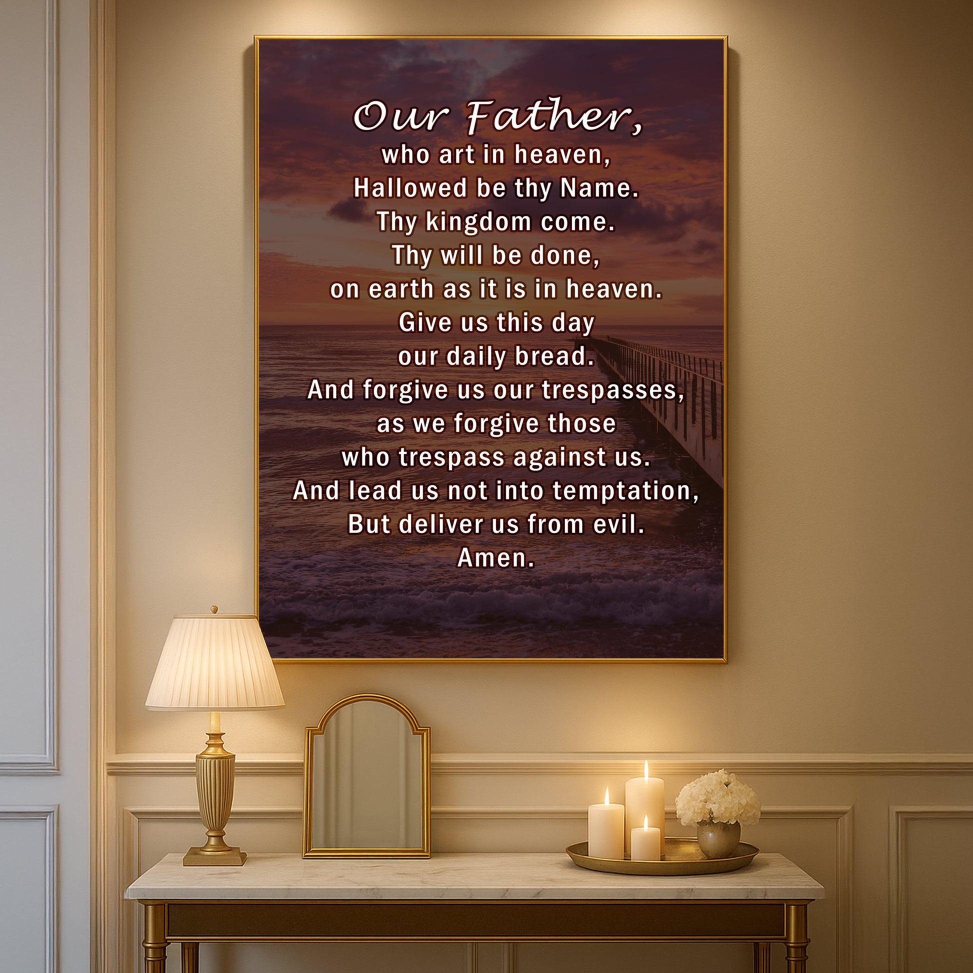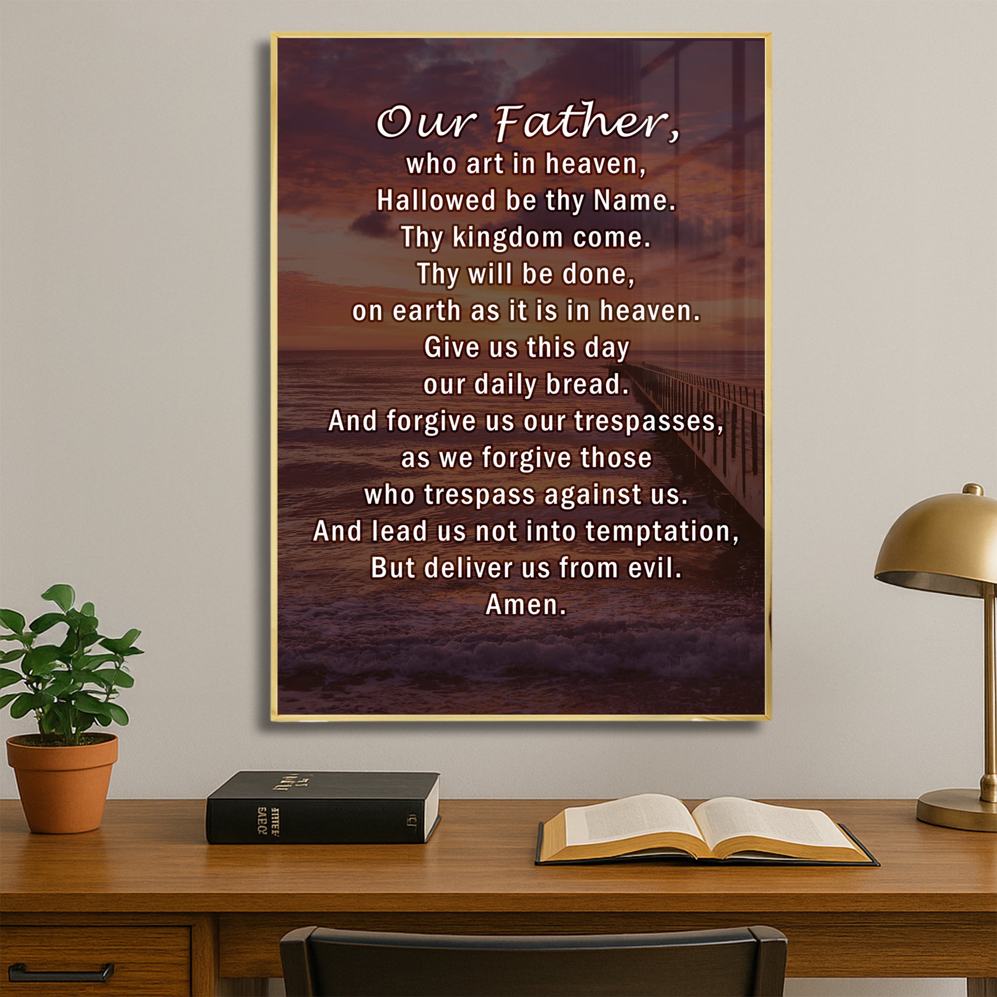 Bring the foundation of Christian faith into your home with this Lord’s Prayer Wall Art. Featuring the beloved Our Father prayer over a serene ocean sunset, this artwork captures reverence, peace, and devotion. Ideal for meditation, daily prayer, or as a meaningful reminder of faith, it’s perfect for churches, Christian homes, or sacred spaces. Expertly framed in durable metal, this piece offers both elegance and spiritual inspiration.