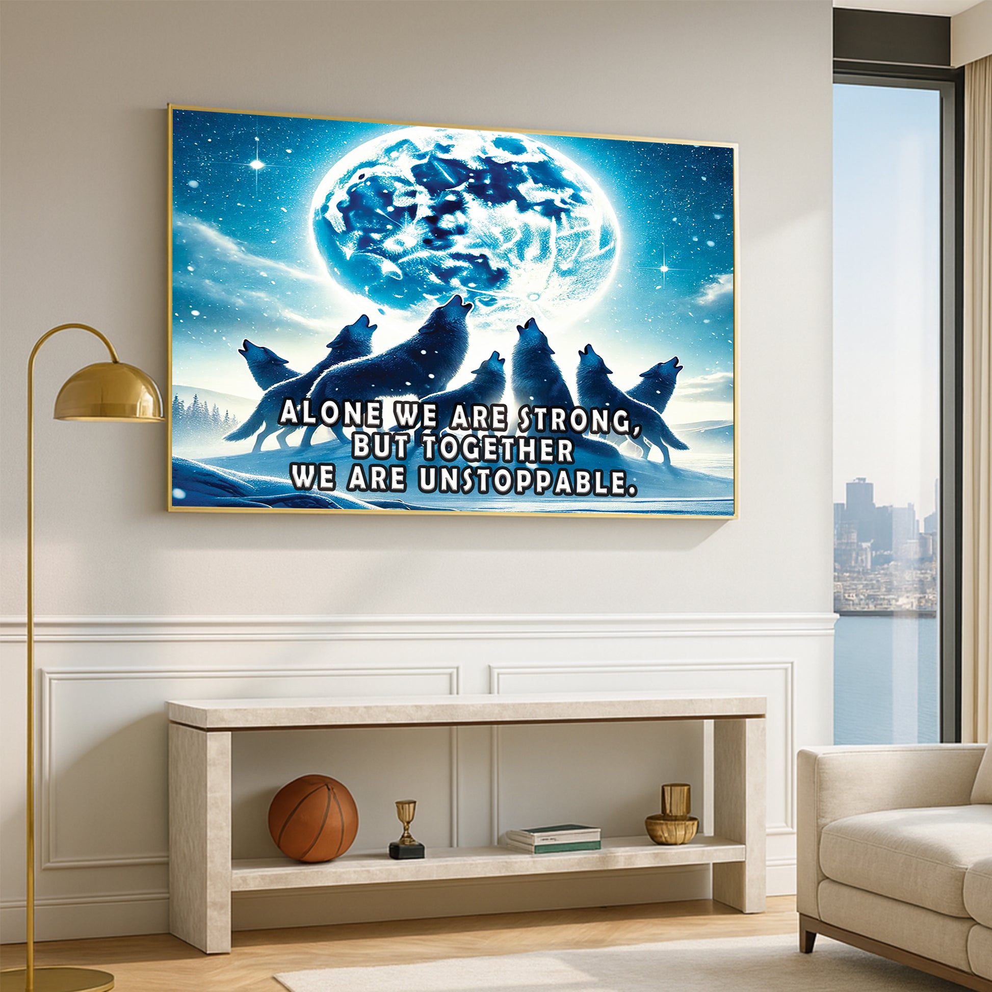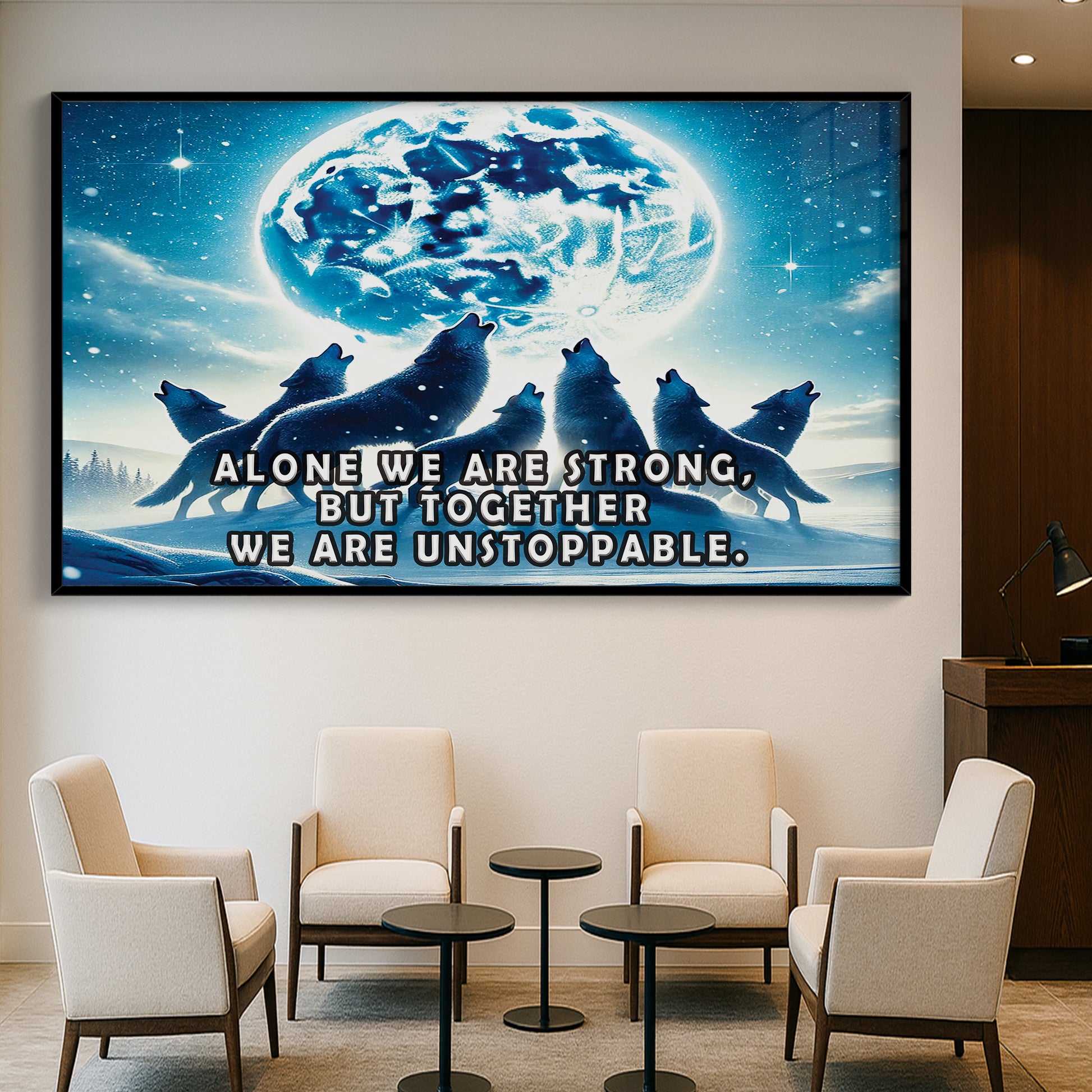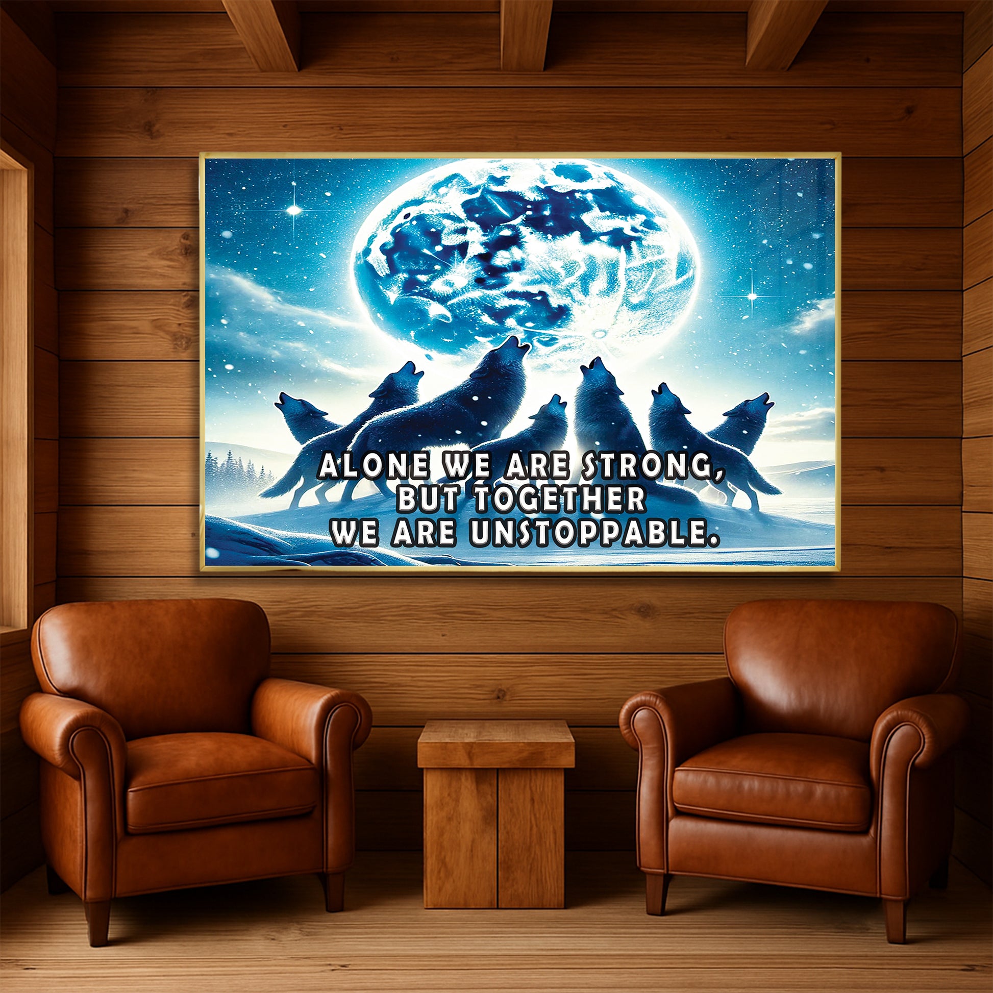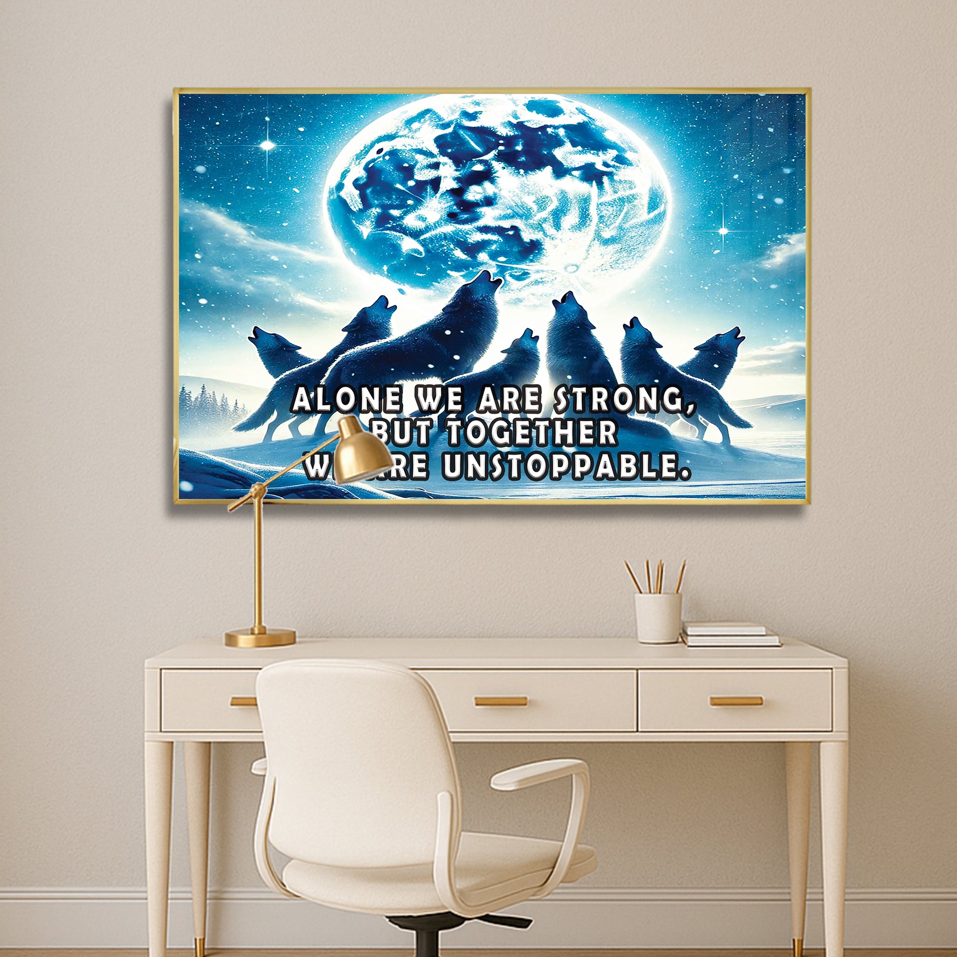 Create a space rooted in strength and unity with this striking artwork of a wolf pack howling beneath a glowing winter moon. The empowering message “Alone we are strong, but together we are unstoppable” stands as a tribute to friendship, family, and teamwork—perfect for living rooms, shared offices, or teen rooms.