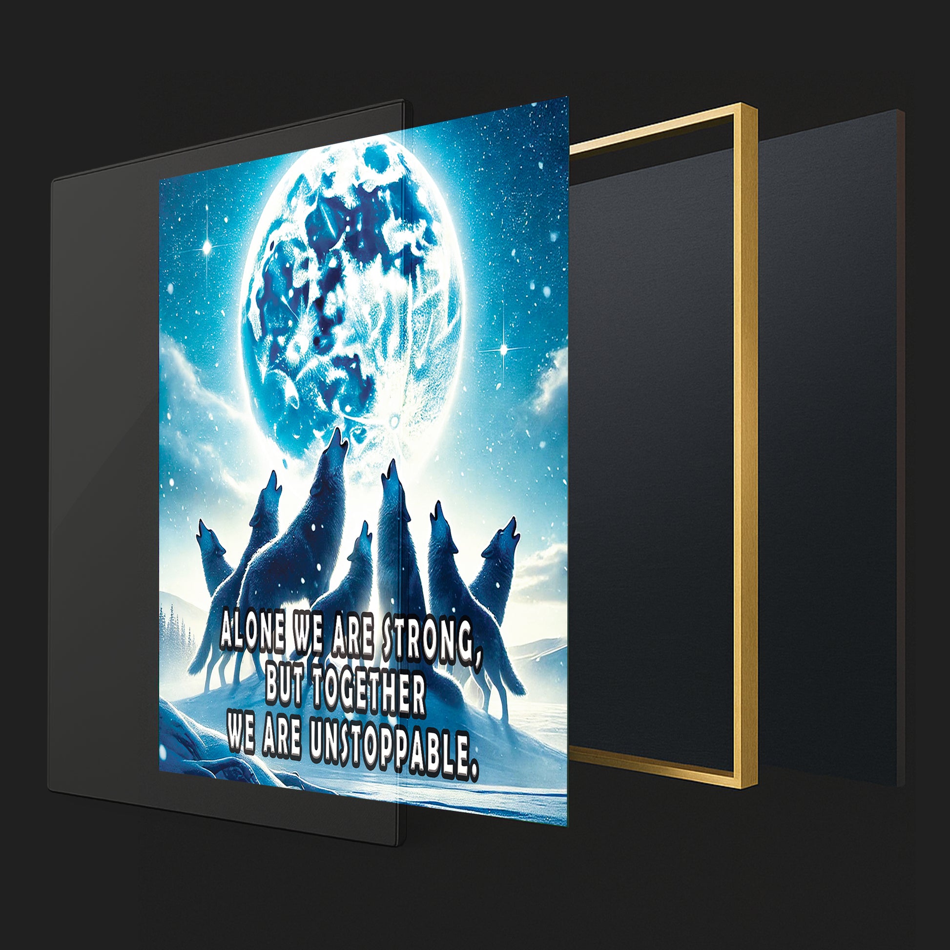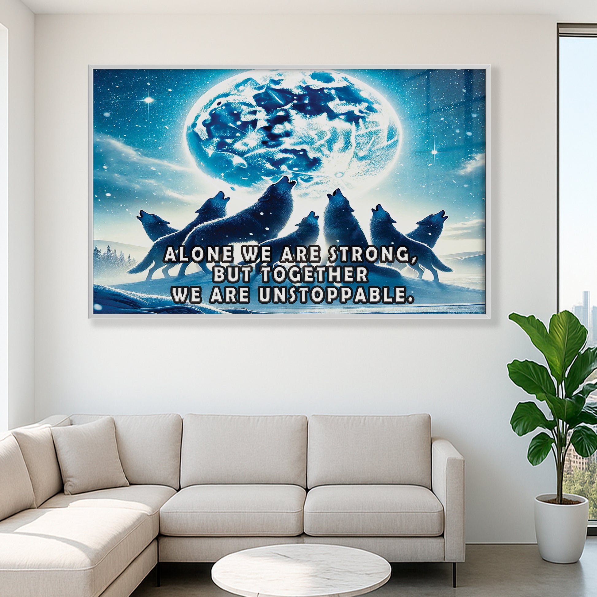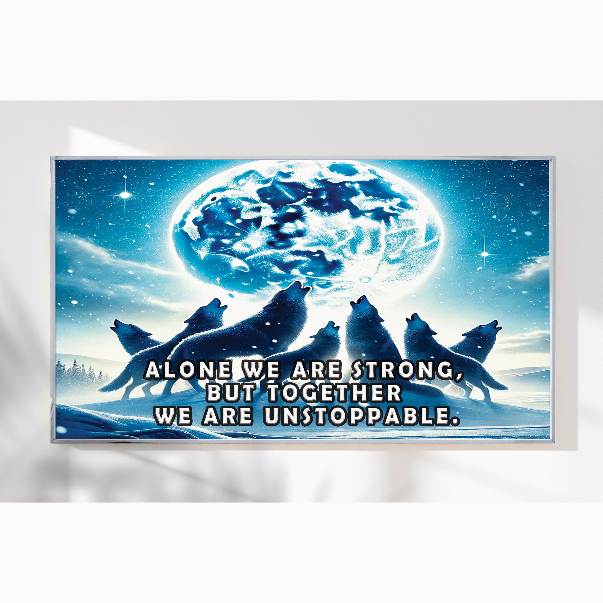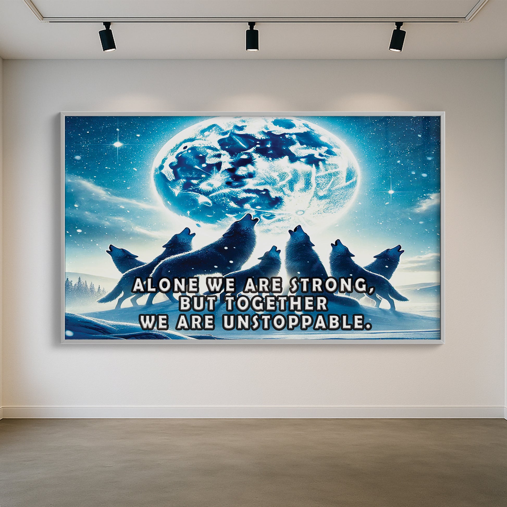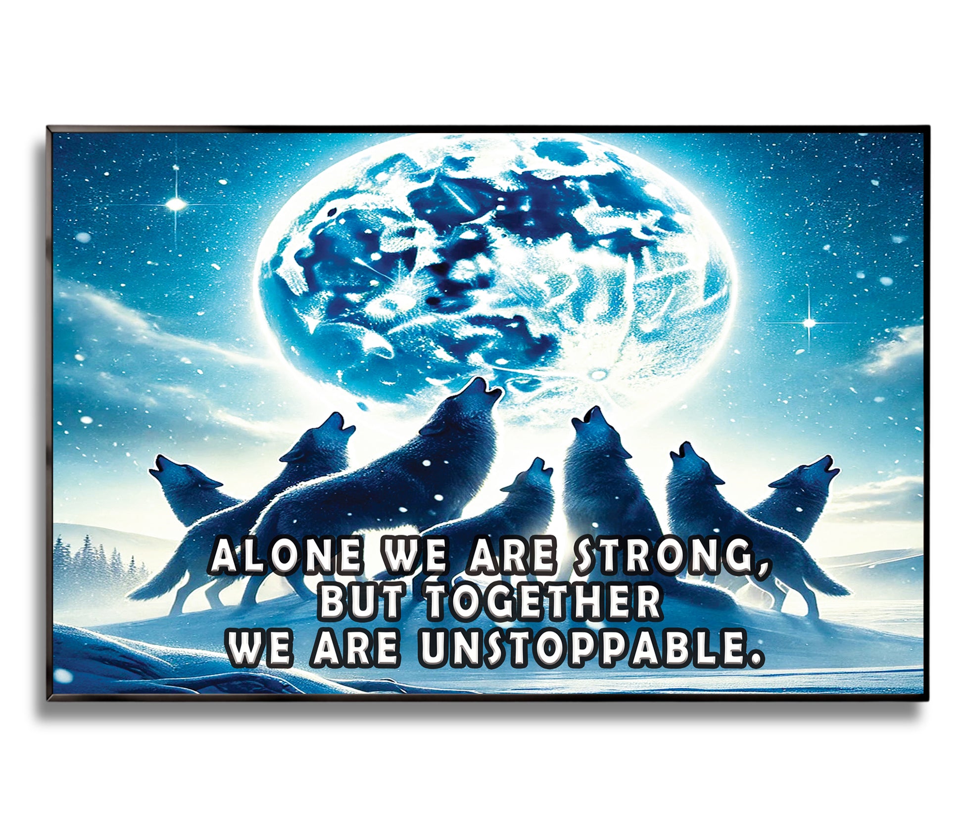 Create a space rooted in strength and unity with this striking artwork of a wolf pack howling beneath a glowing winter moon. The empowering message “Alone we are strong, but together we are unstoppable” stands as a tribute to friendship, family, and teamwork—perfect for living rooms, shared offices, or teen rooms.