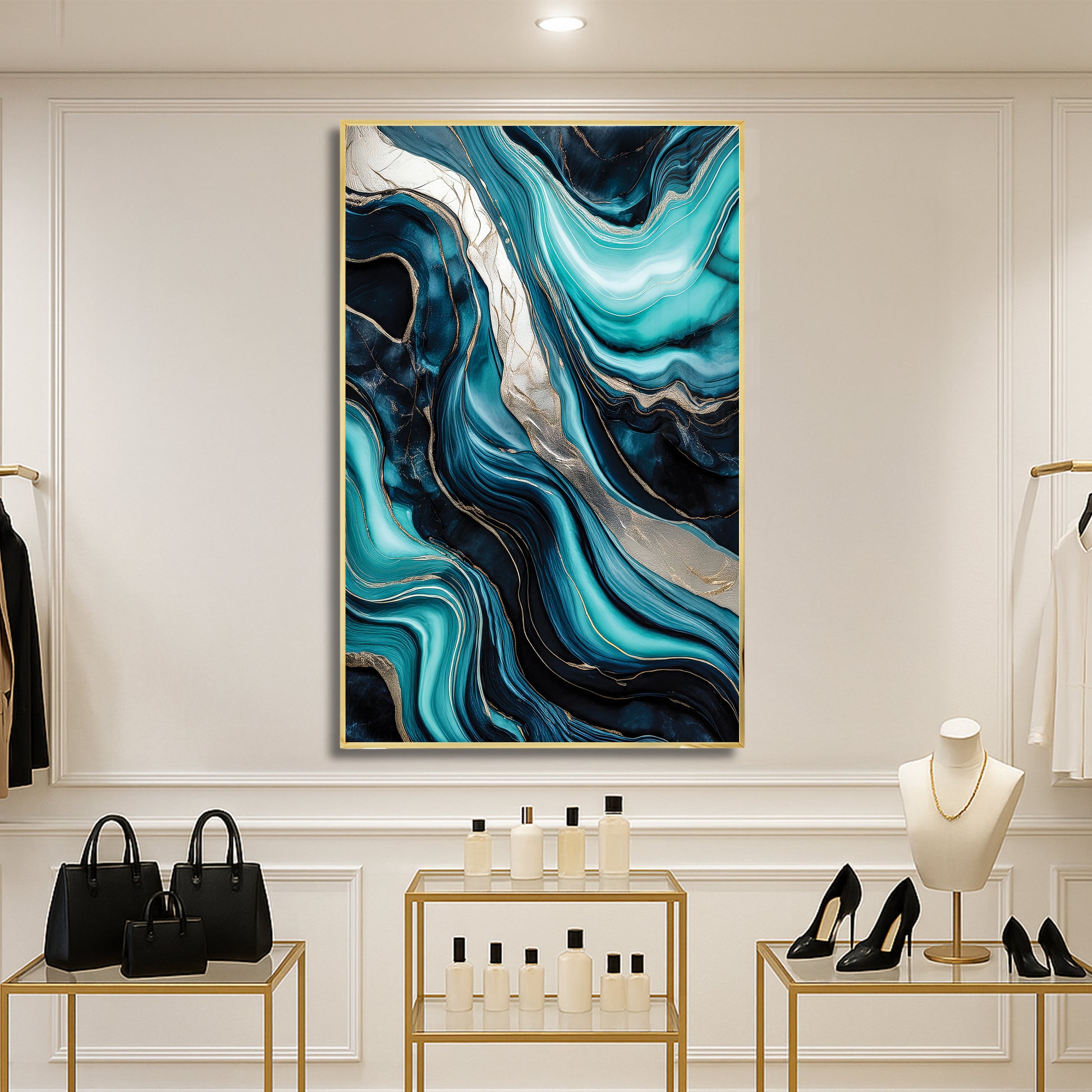 This artwork features flowing turquoise and deep navy marble-like textures, highlighted with shimmering gold accents. The organic swirls evoke elegance, movement, and modern luxury. A striking choice for contemporary interiors, perfect for living rooms, offices, or upscale spaces seeking a bold yet refined centerpiece.