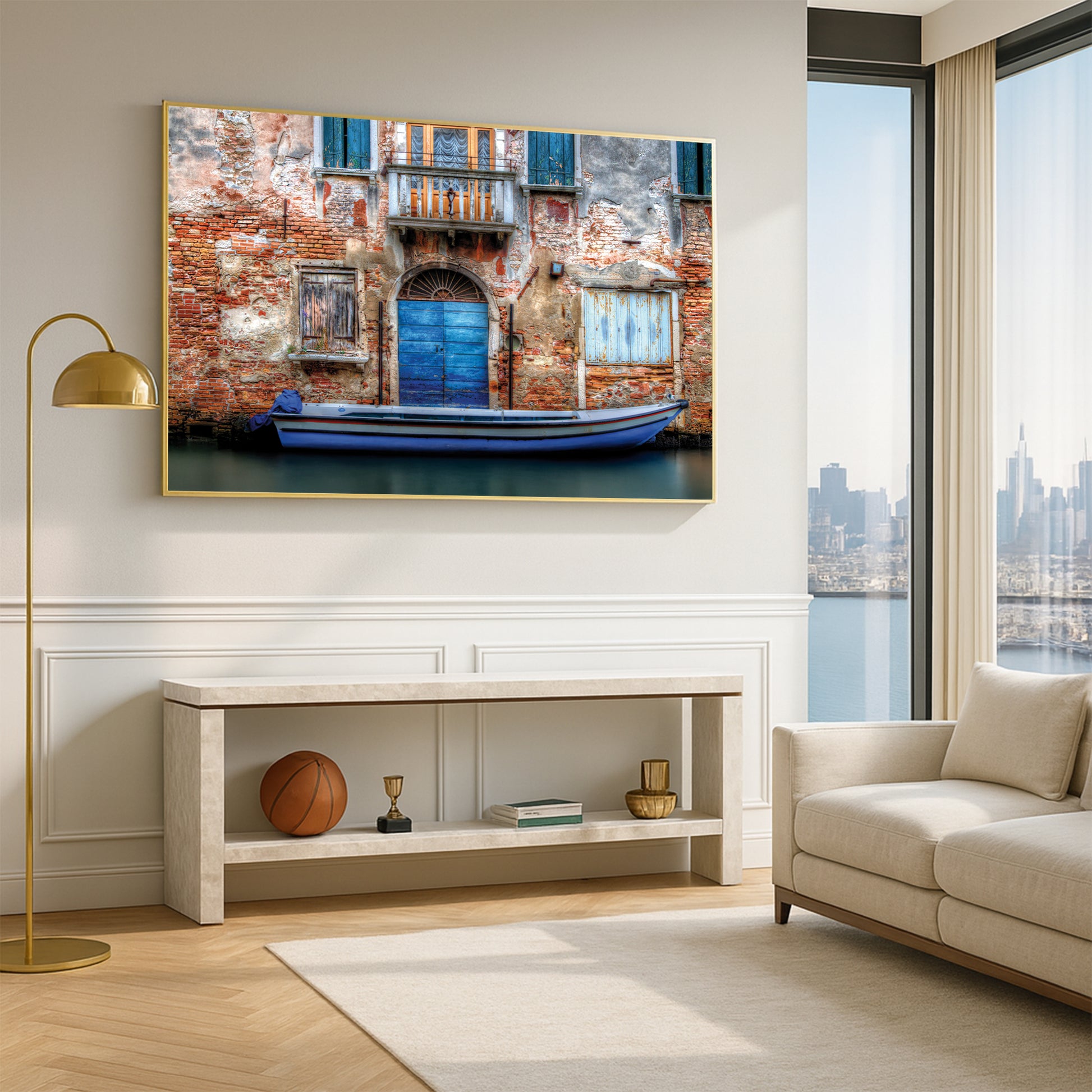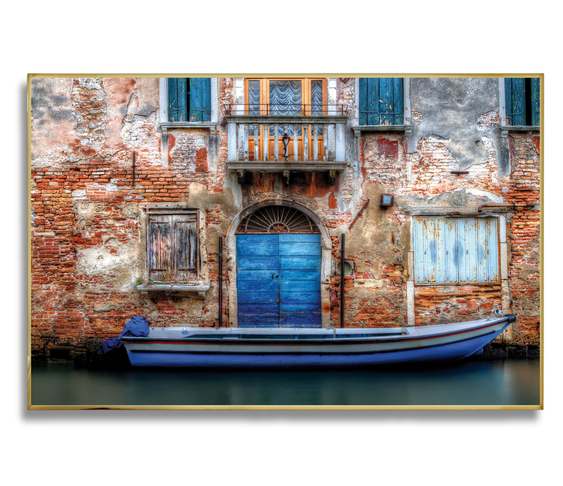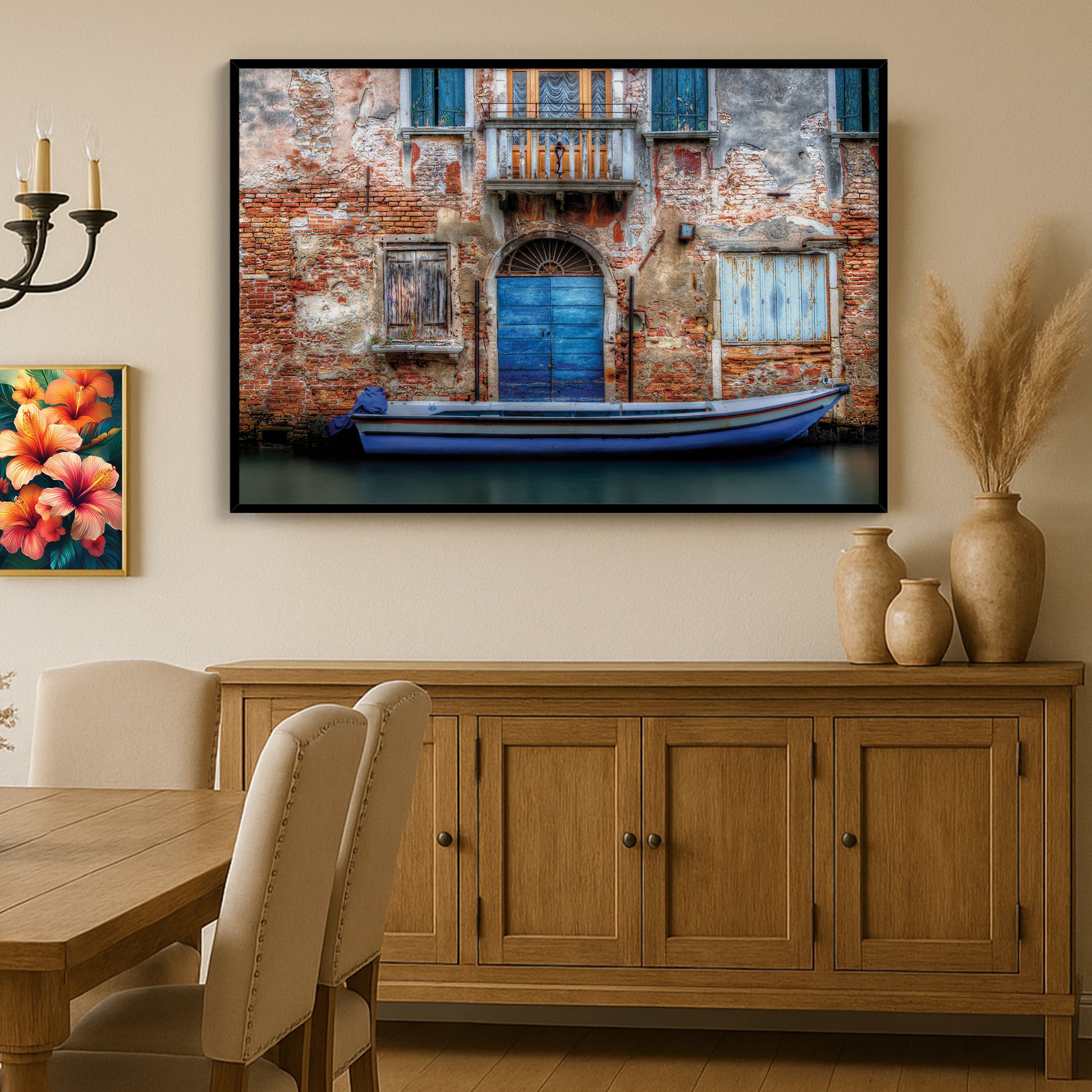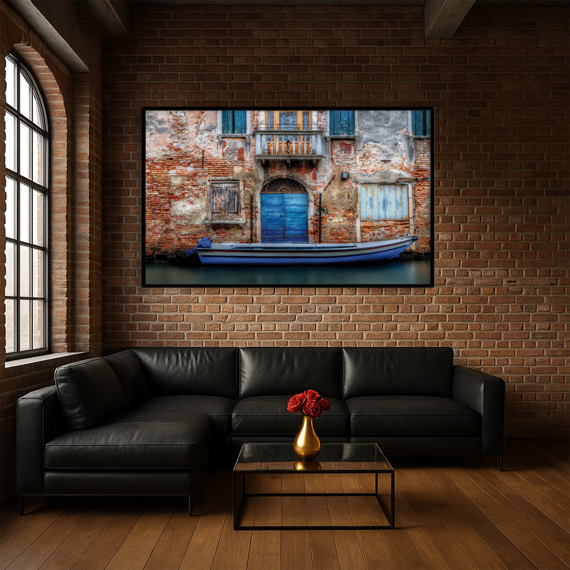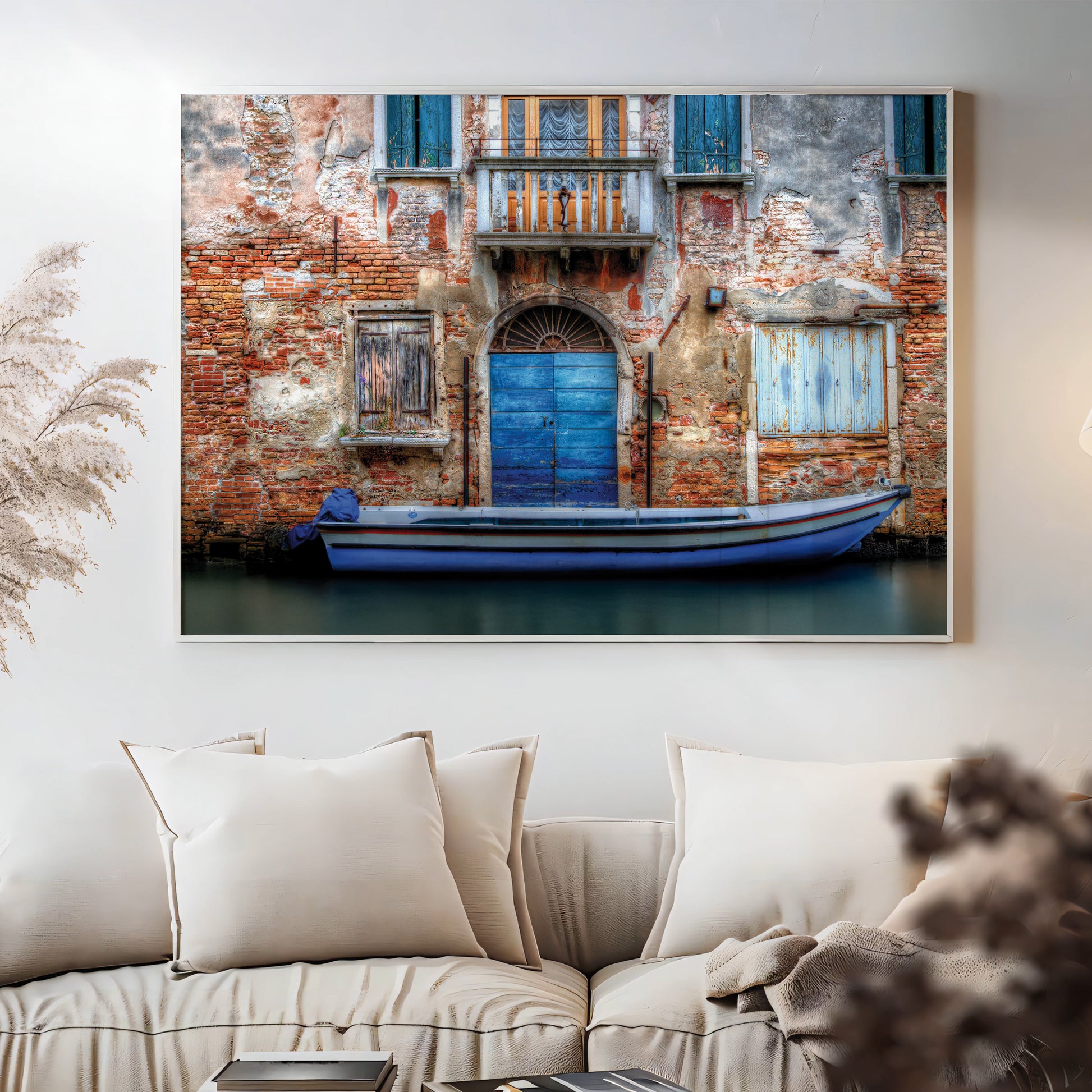Step into a story of age and texture with this vibrant scene of a Venetian canal wall. A weathered blue door anchors the image, surrounded by crumbling brick, faded shutters, and rustic charm. Below, a quiet boat floats on the emerald waters, completing this moody yet colorful portrait of a city rich with history.
