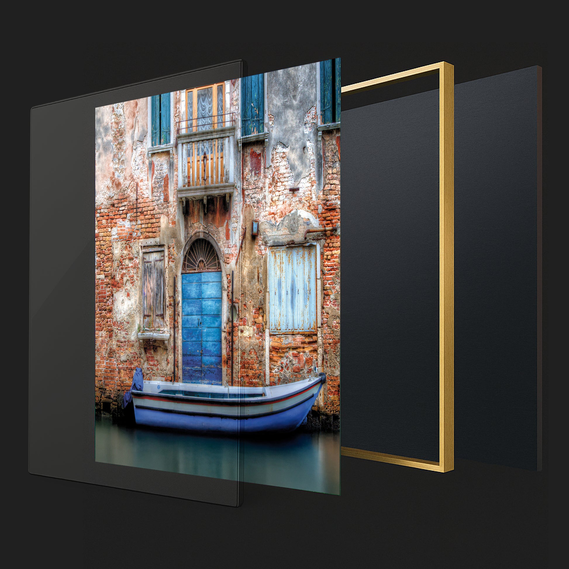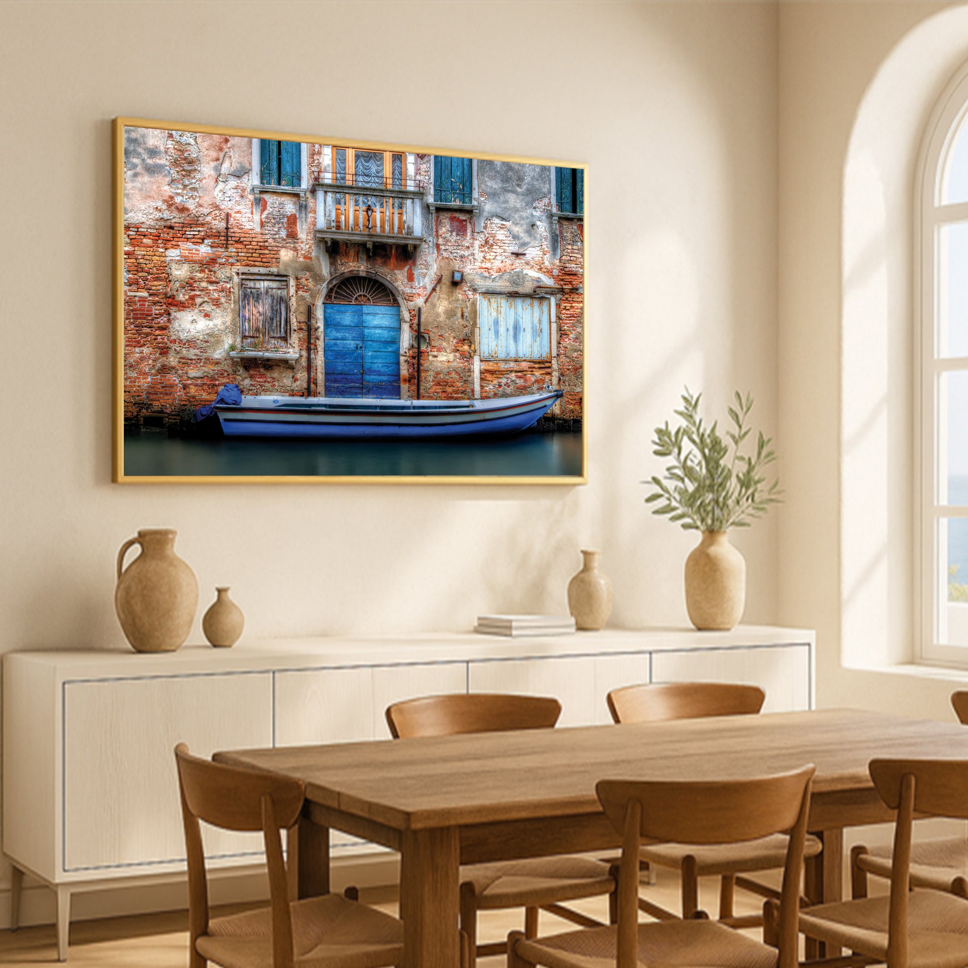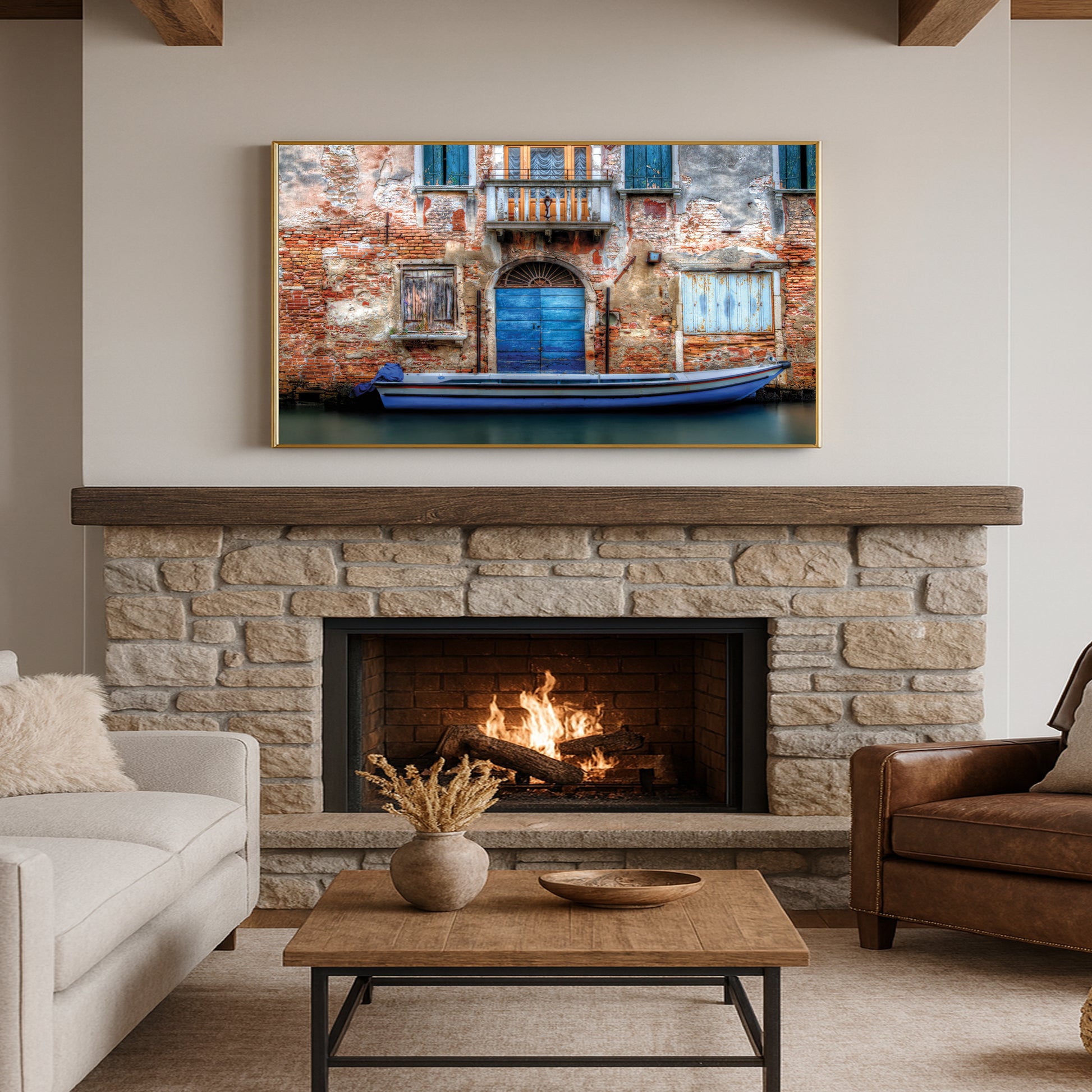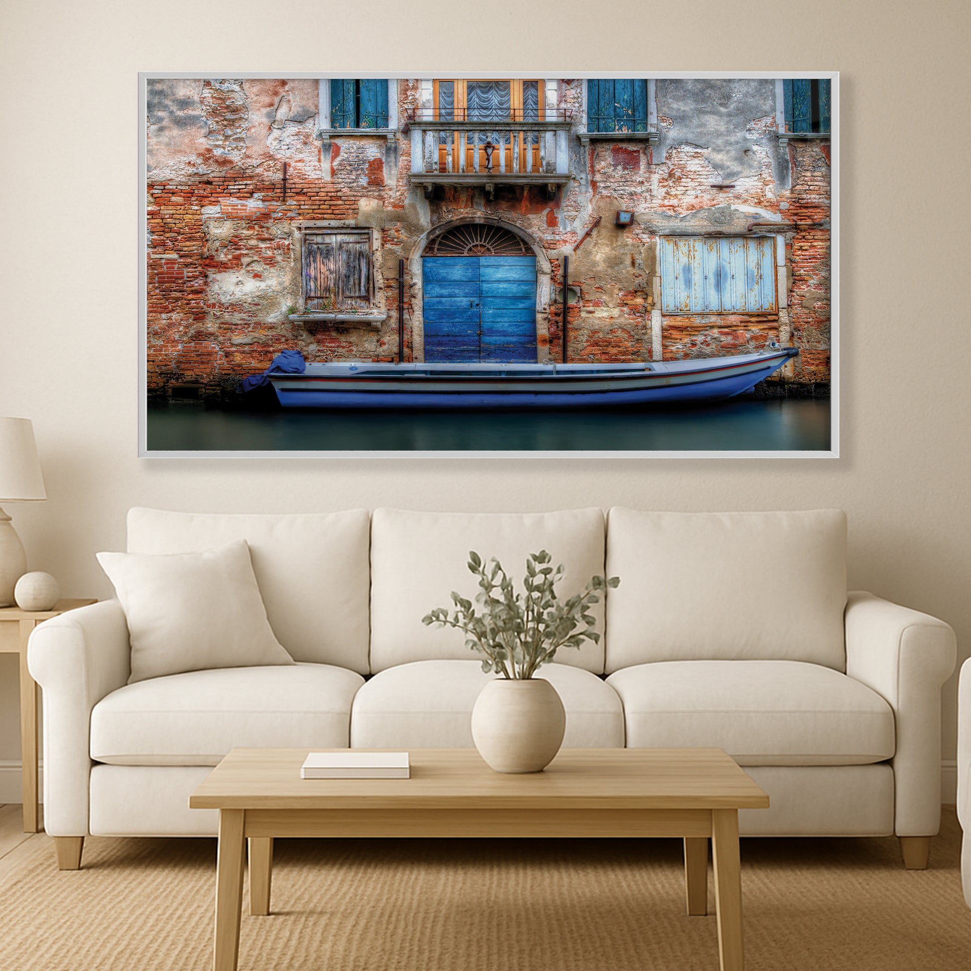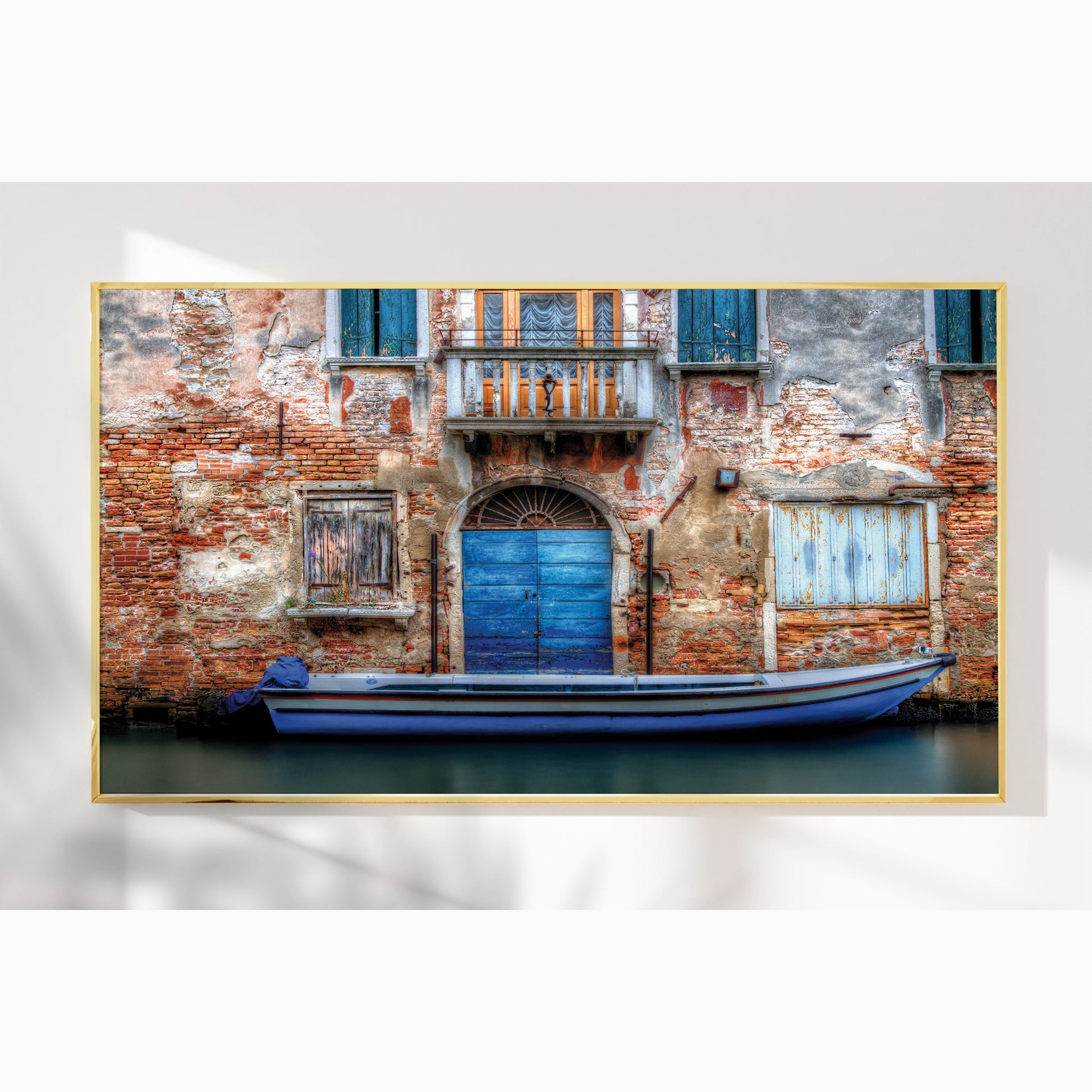 Step into a story of age and texture with this vibrant scene of a Venetian canal wall. A weathered blue door anchors the image, surrounded by crumbling brick, faded shutters, and rustic charm. Below, a quiet boat floats on the emerald waters, completing this moody yet colorful portrait of a city rich with history.