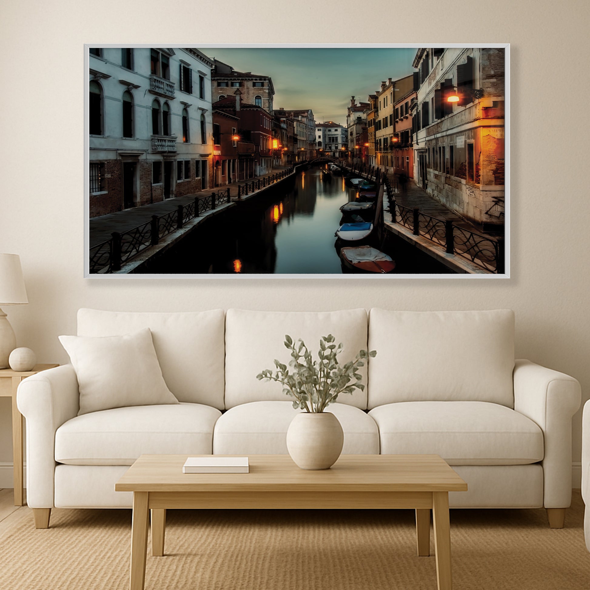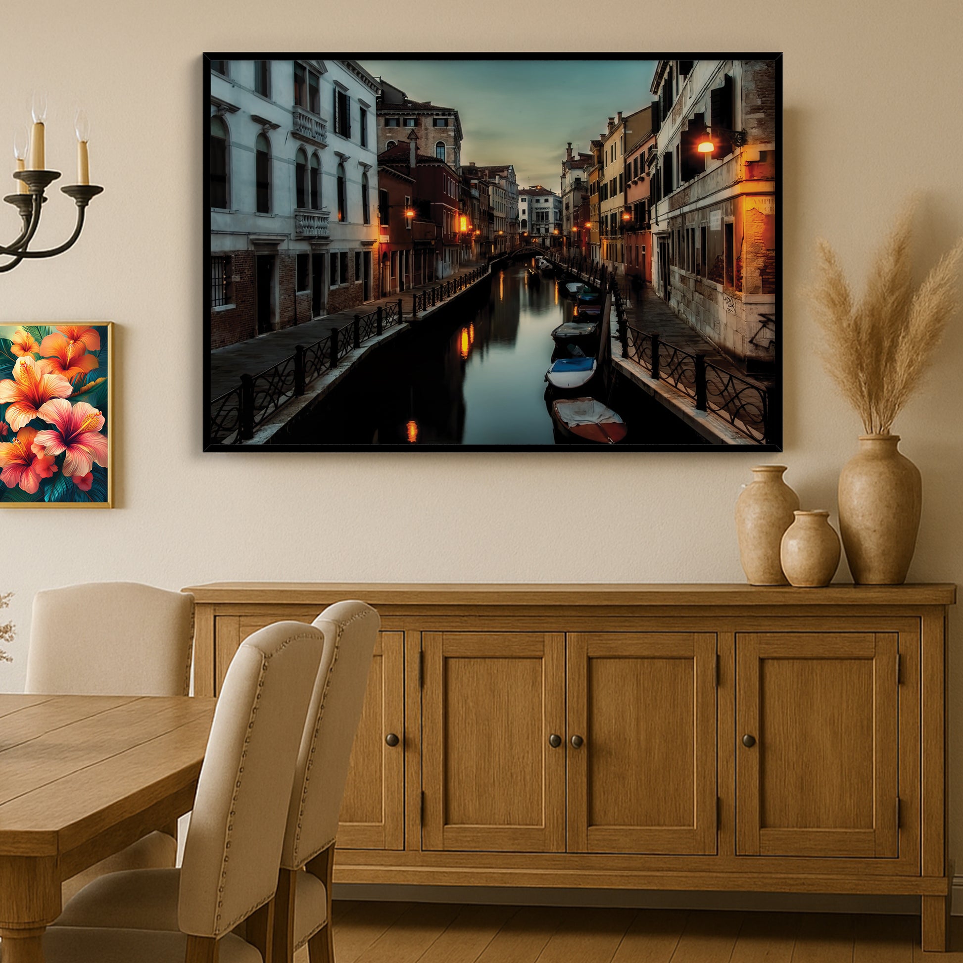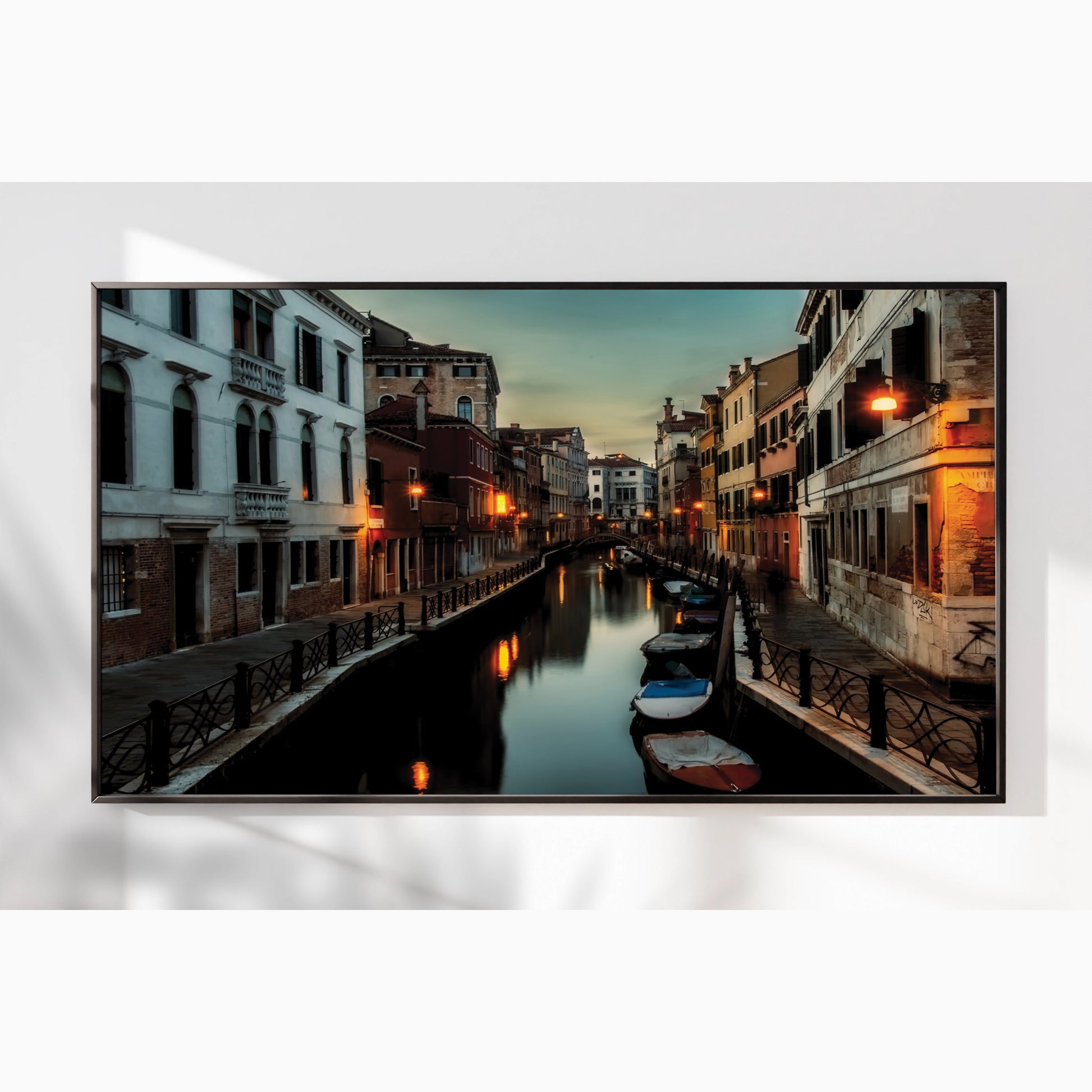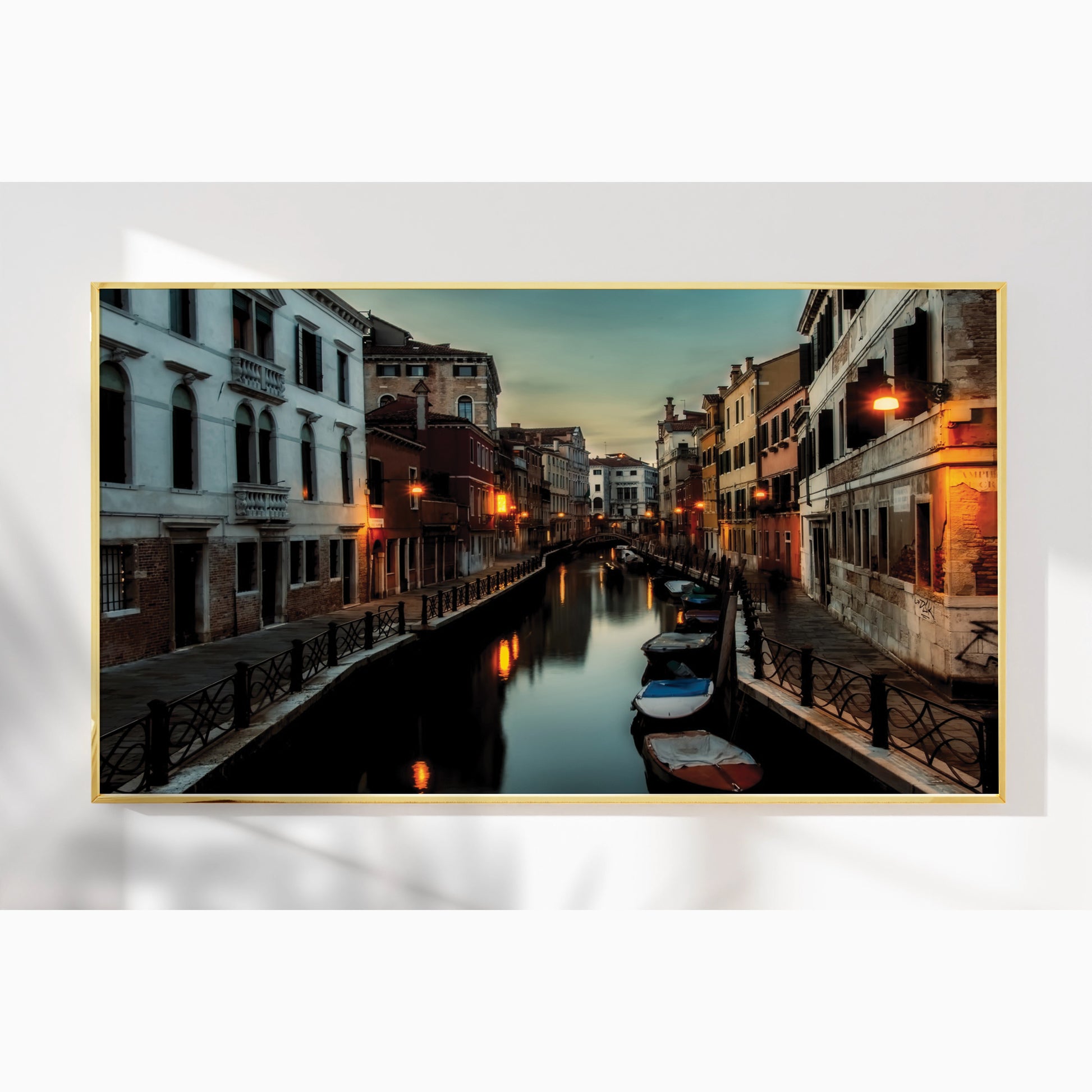 This atmospheric cityscape captures the magic of Venice as dusk settles over its narrow canals. Streetlights shimmer on the water’s surface, while boats rest quietly along the edges of timeworn buildings. The deep twilight tones evoke mystery, romance, and nostalgia all at once.