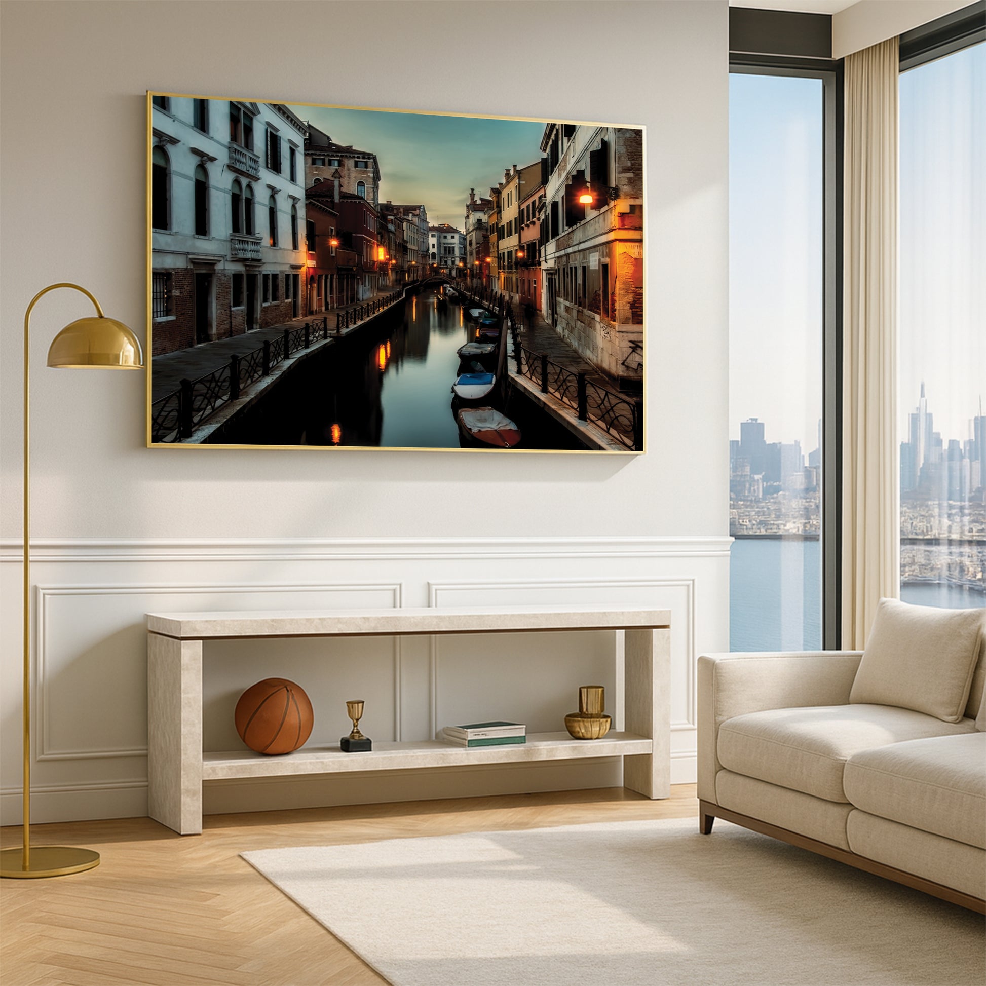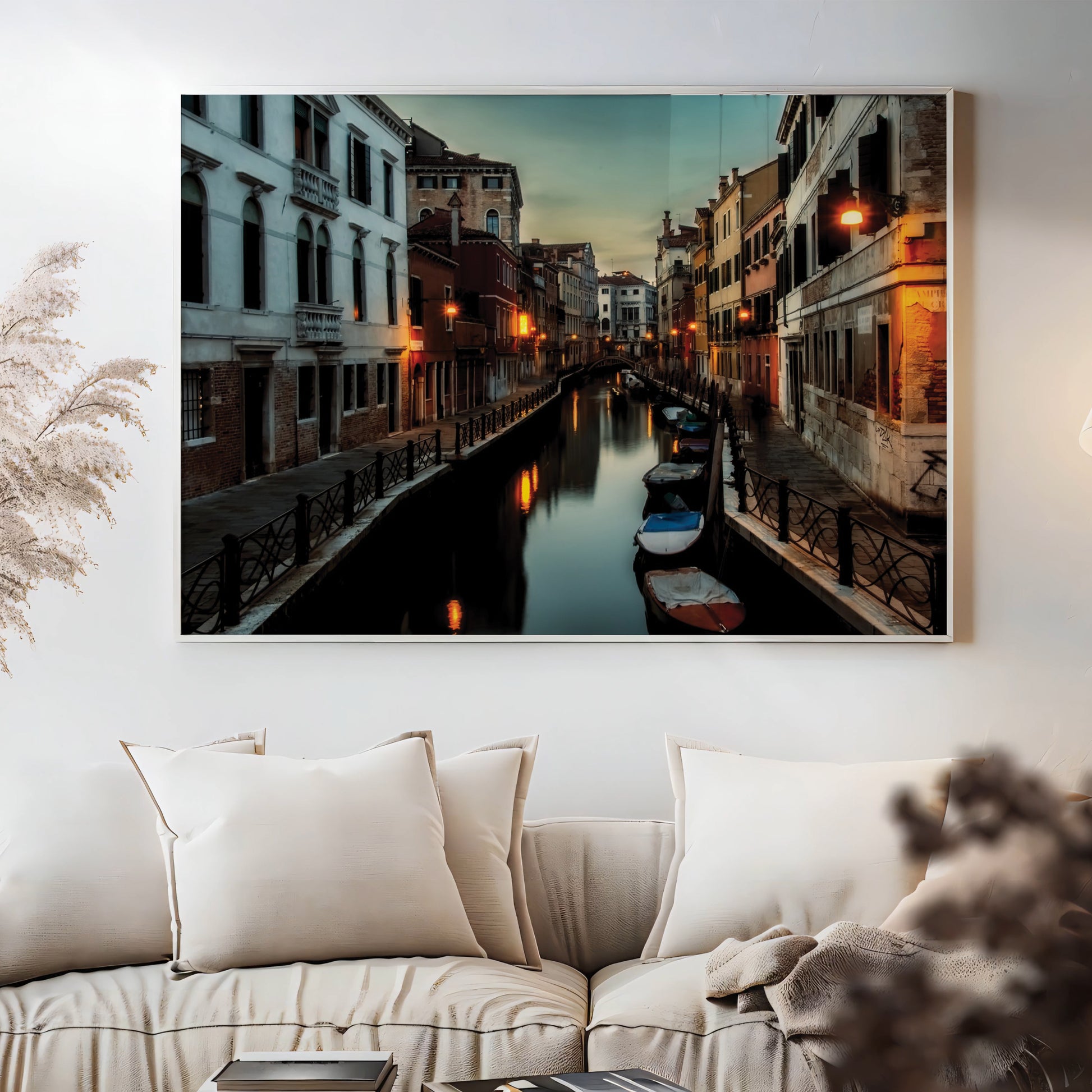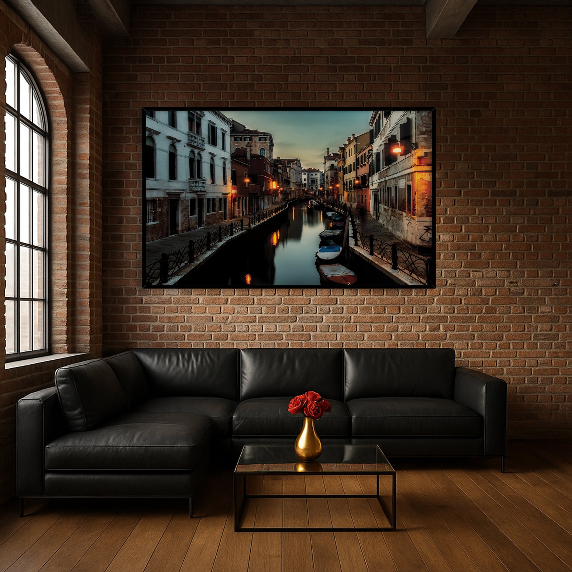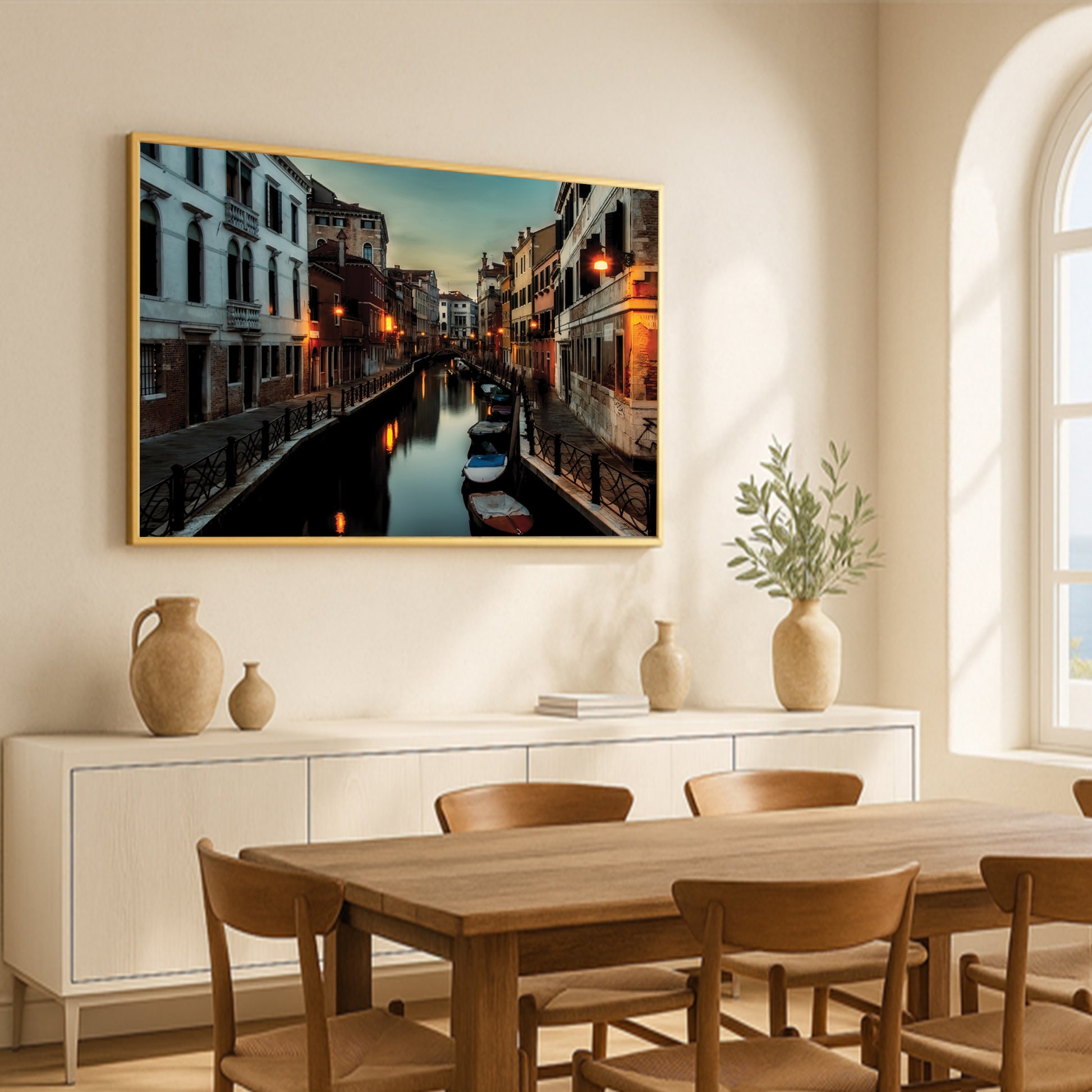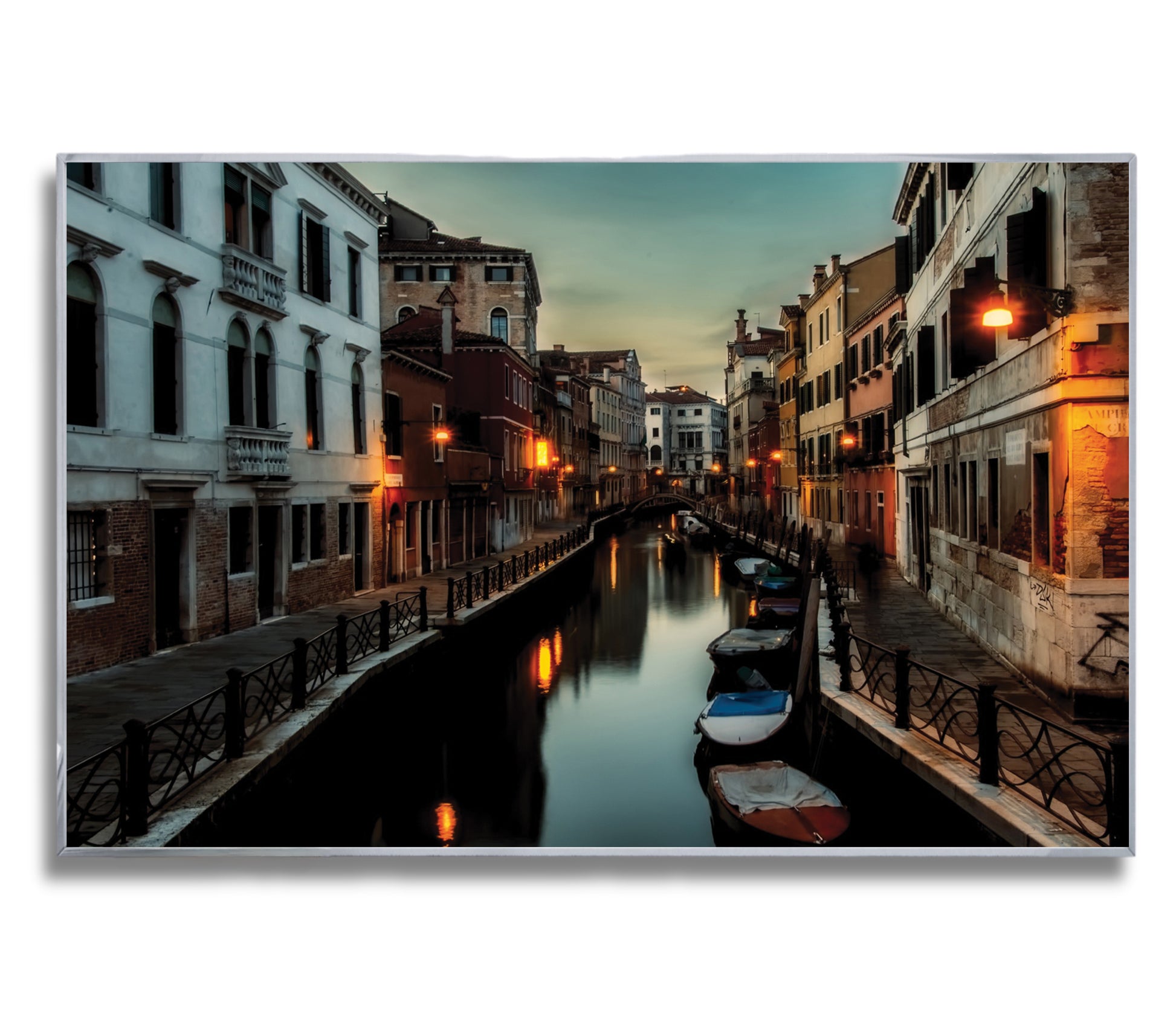 This atmospheric cityscape captures the magic of Venice as dusk settles over its narrow canals. Streetlights shimmer on the water’s surface, while boats rest quietly along the edges of timeworn buildings. The deep twilight tones evoke mystery, romance, and nostalgia all at once.
