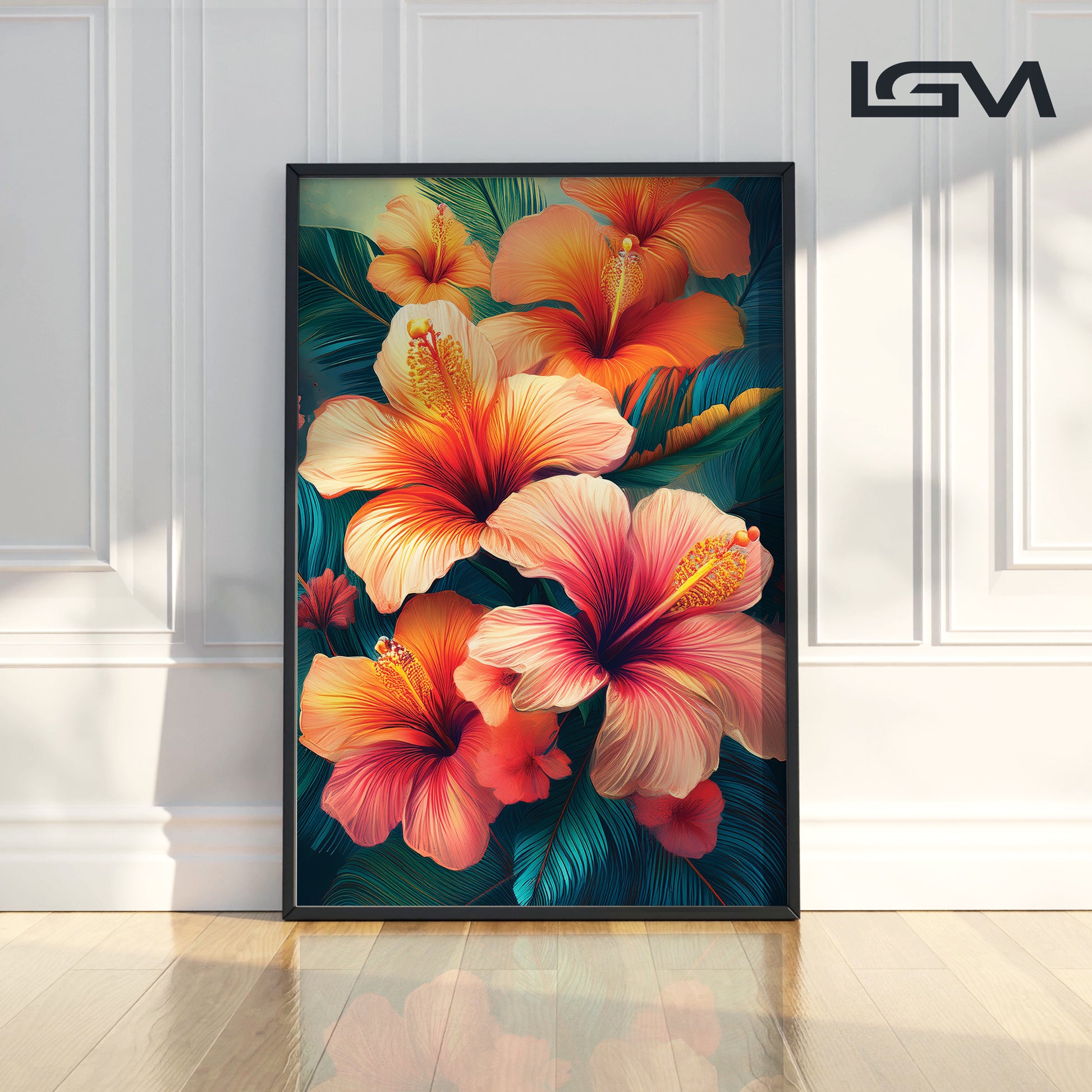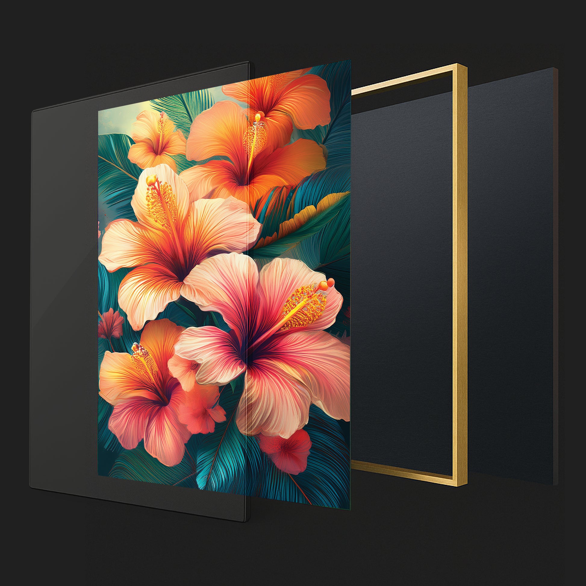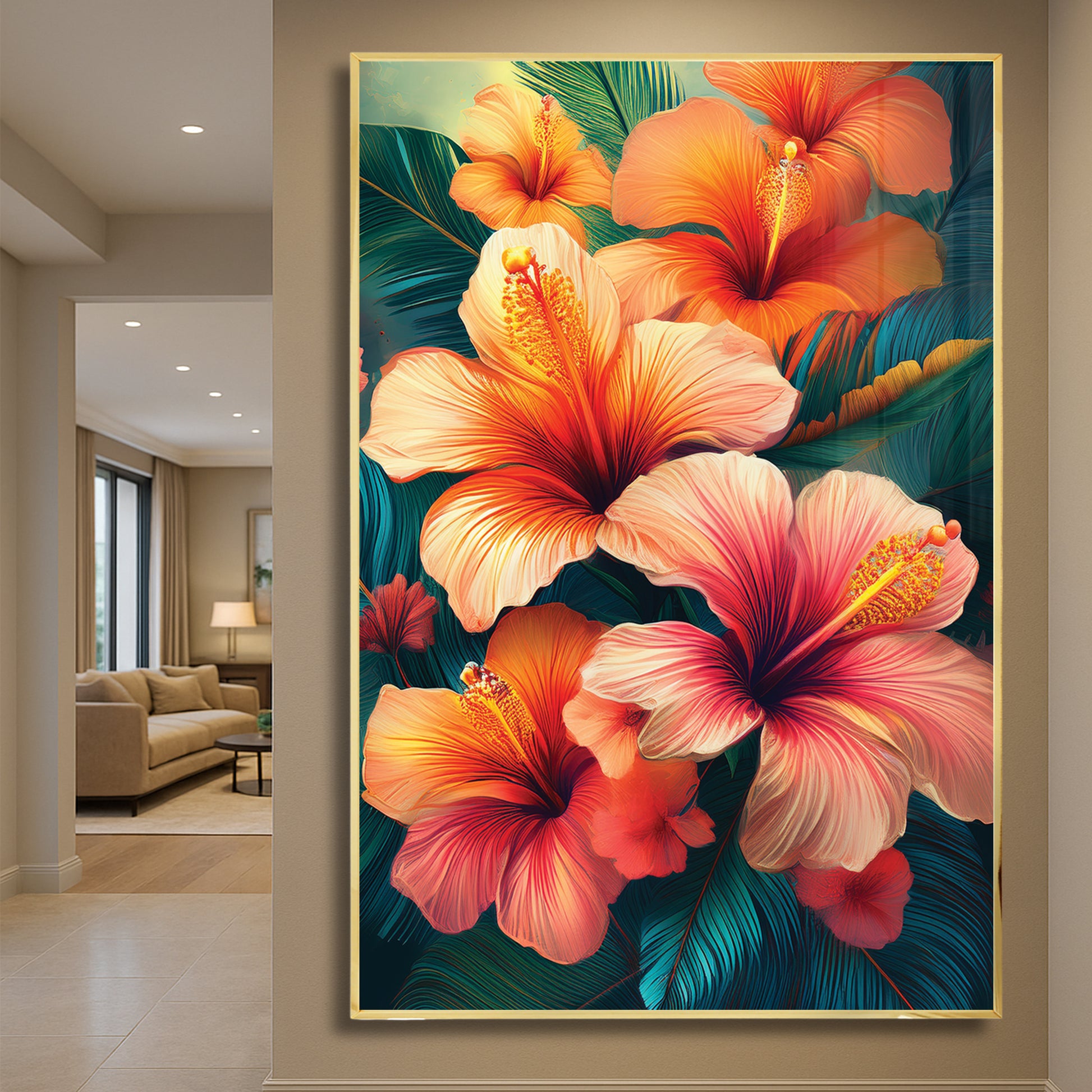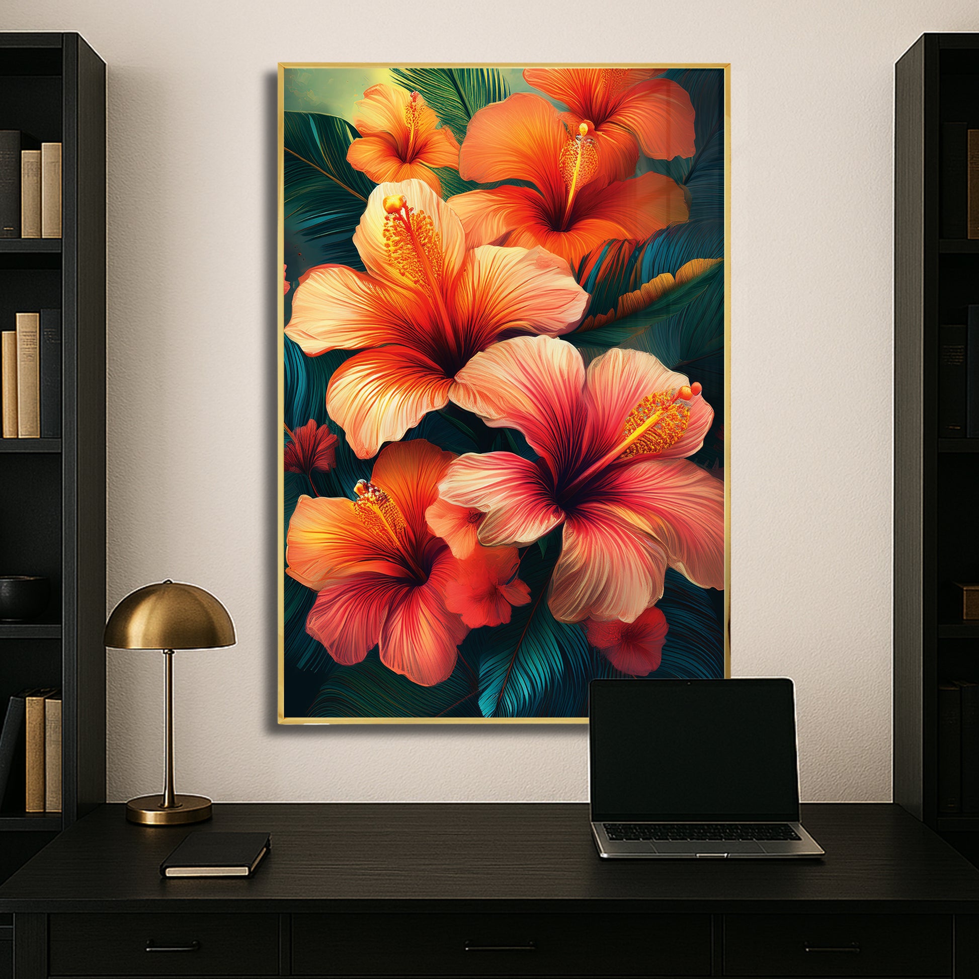 Bring the tropics into your home with this Tropical Hibiscus Metal Framed Wall Art. Featuring fiery orange and pink hibiscus flowers with lush green leaves, this artwork radiates energy, warmth, and exotic charm. The vivid details and flowing design make it the perfect statement piece for living rooms, patios, or creative spaces. Professionally framed in sleek metal, it blends durability with bold artistry for modern interiors.