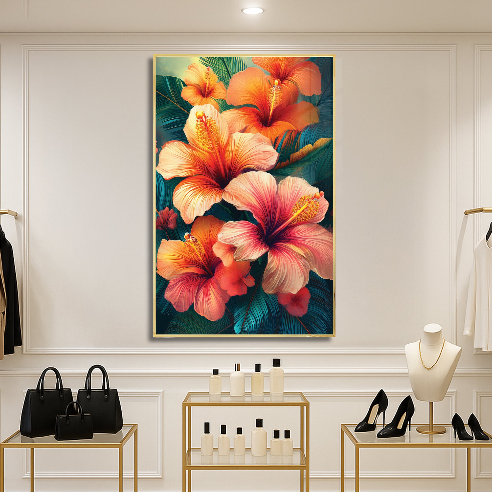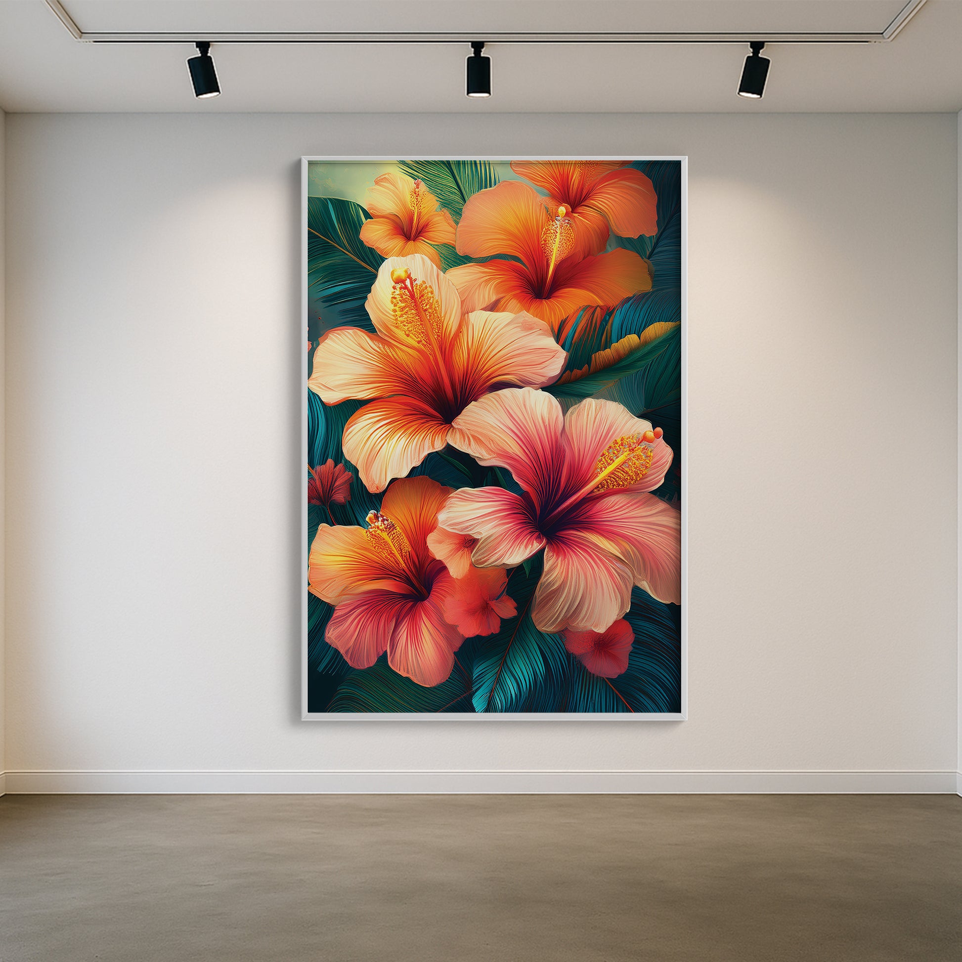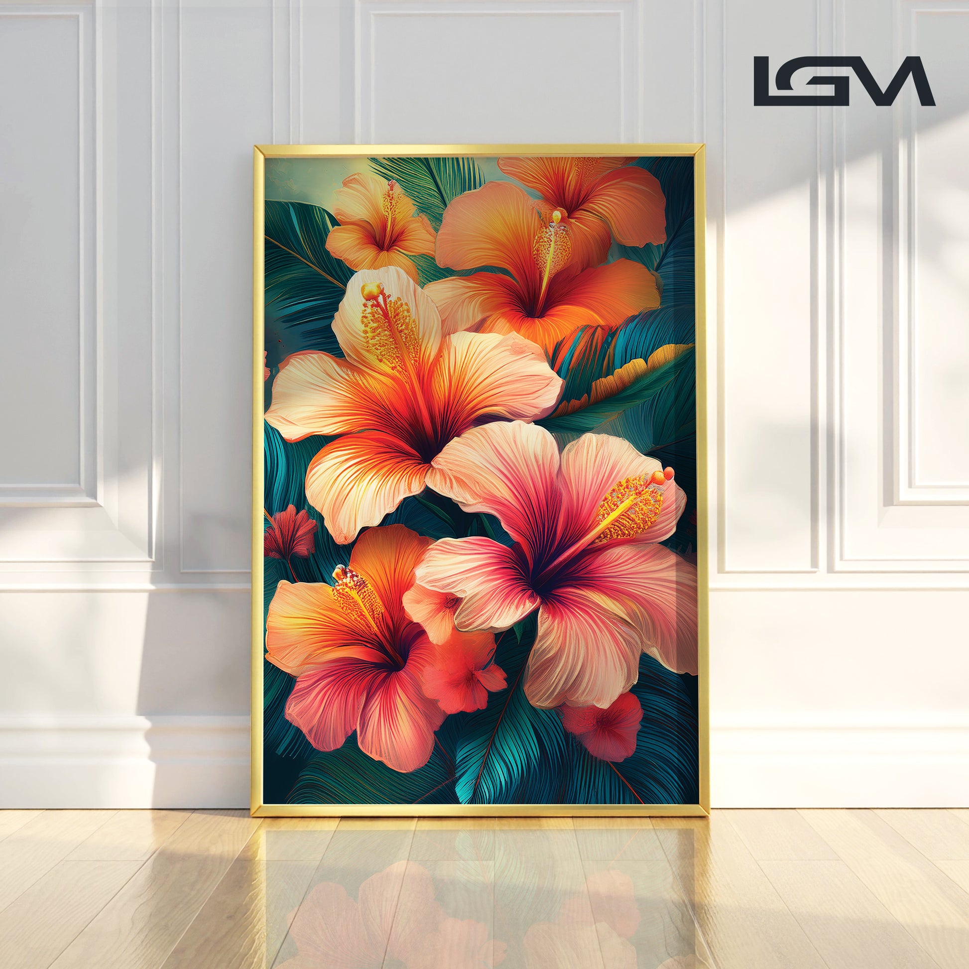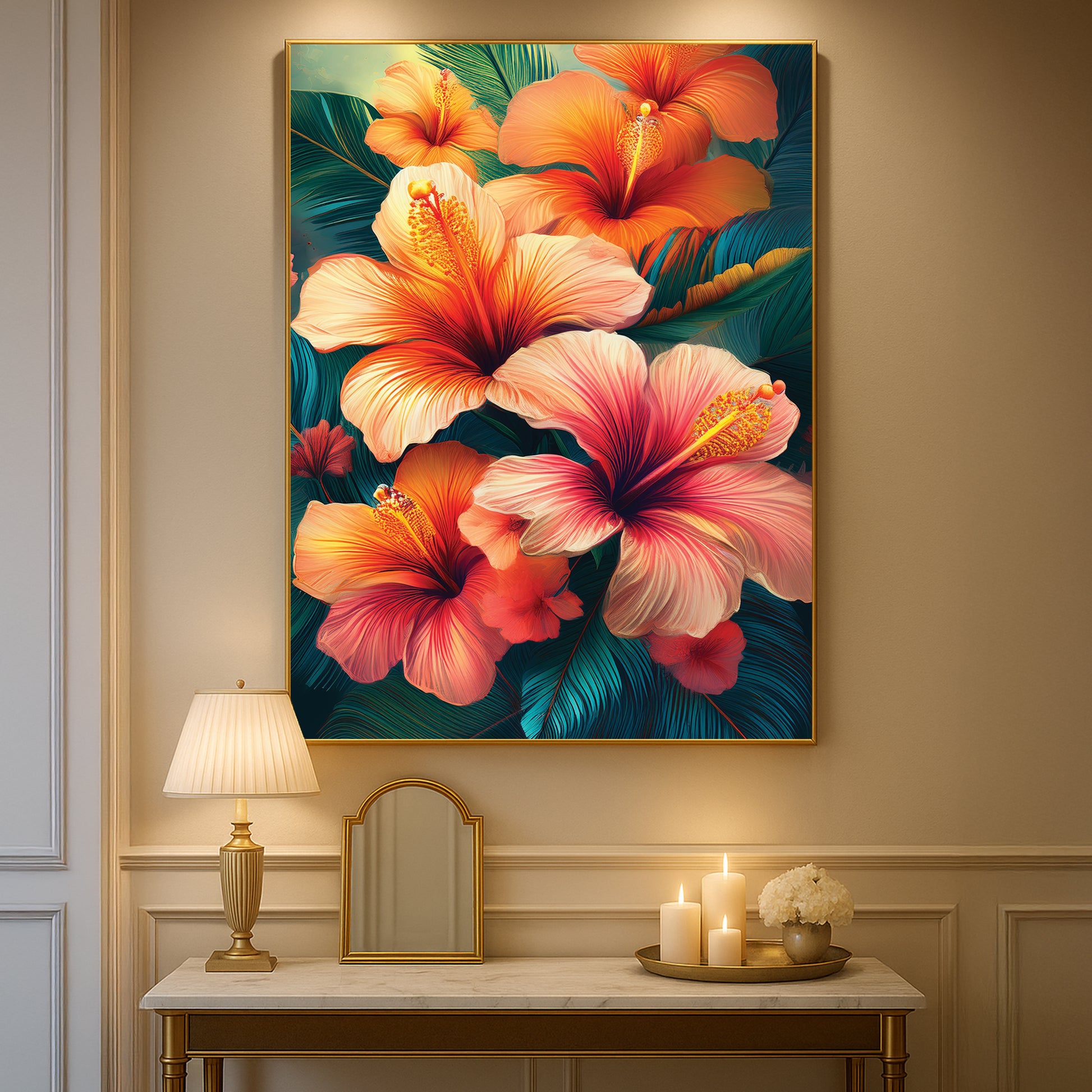 Bring the tropics into your home with this Tropical Hibiscus Metal Framed Wall Art. Featuring fiery orange and pink hibiscus flowers with lush green leaves, this artwork radiates energy, warmth, and exotic charm. The vivid details and flowing design make it the perfect statement piece for living rooms, patios, or creative spaces. Professionally framed in sleek metal, it blends durability with bold artistry for modern interiors.