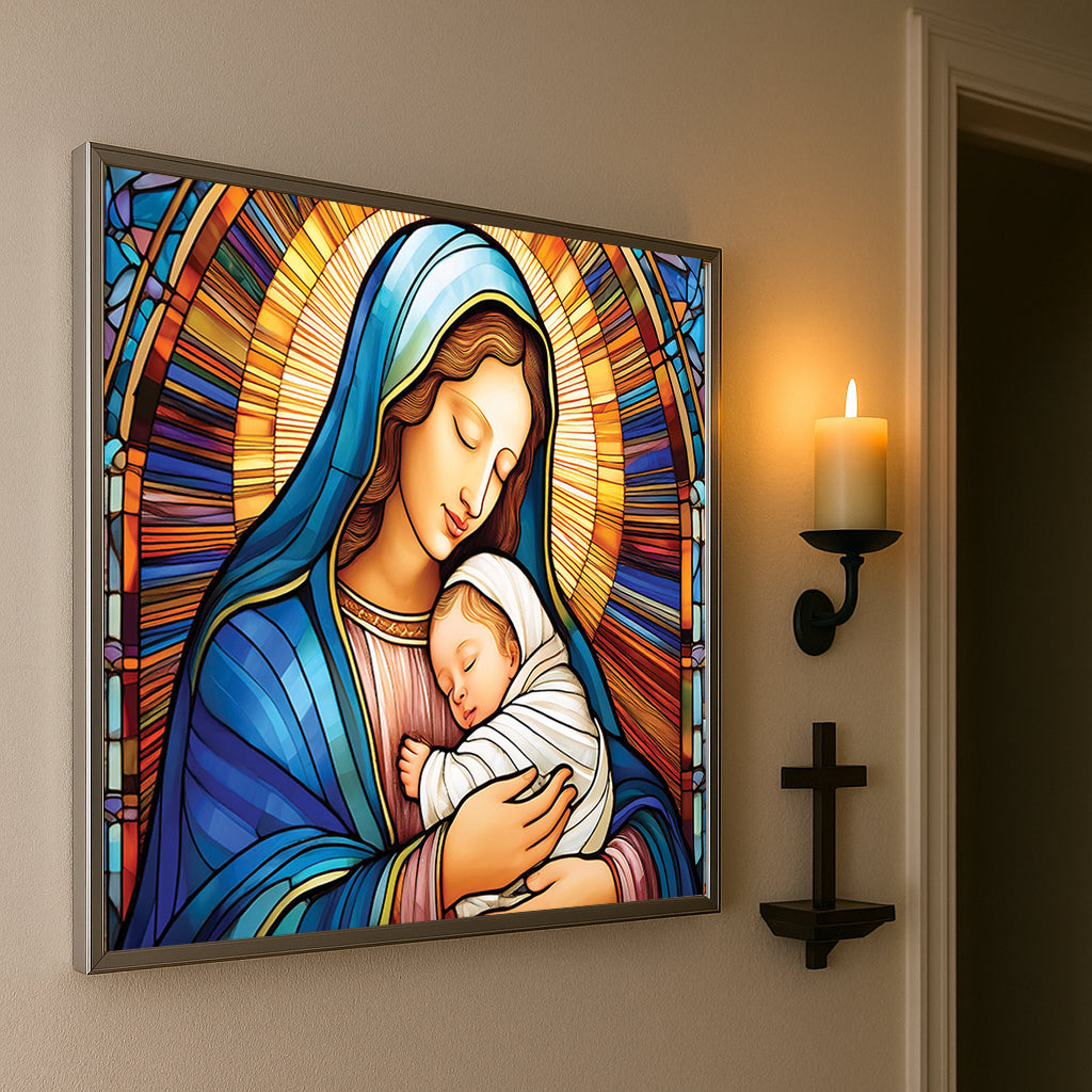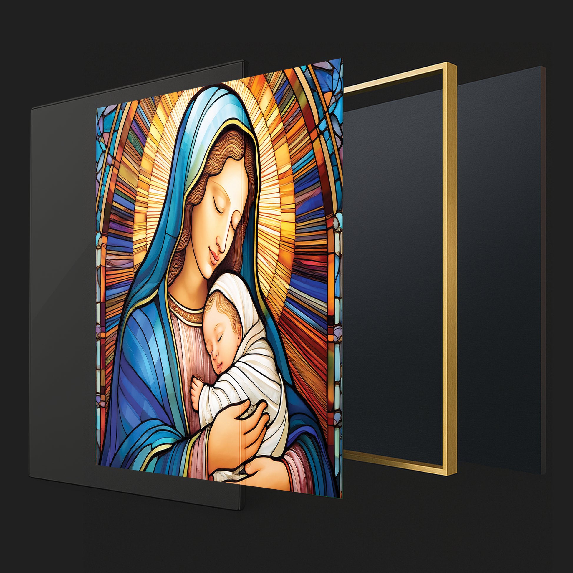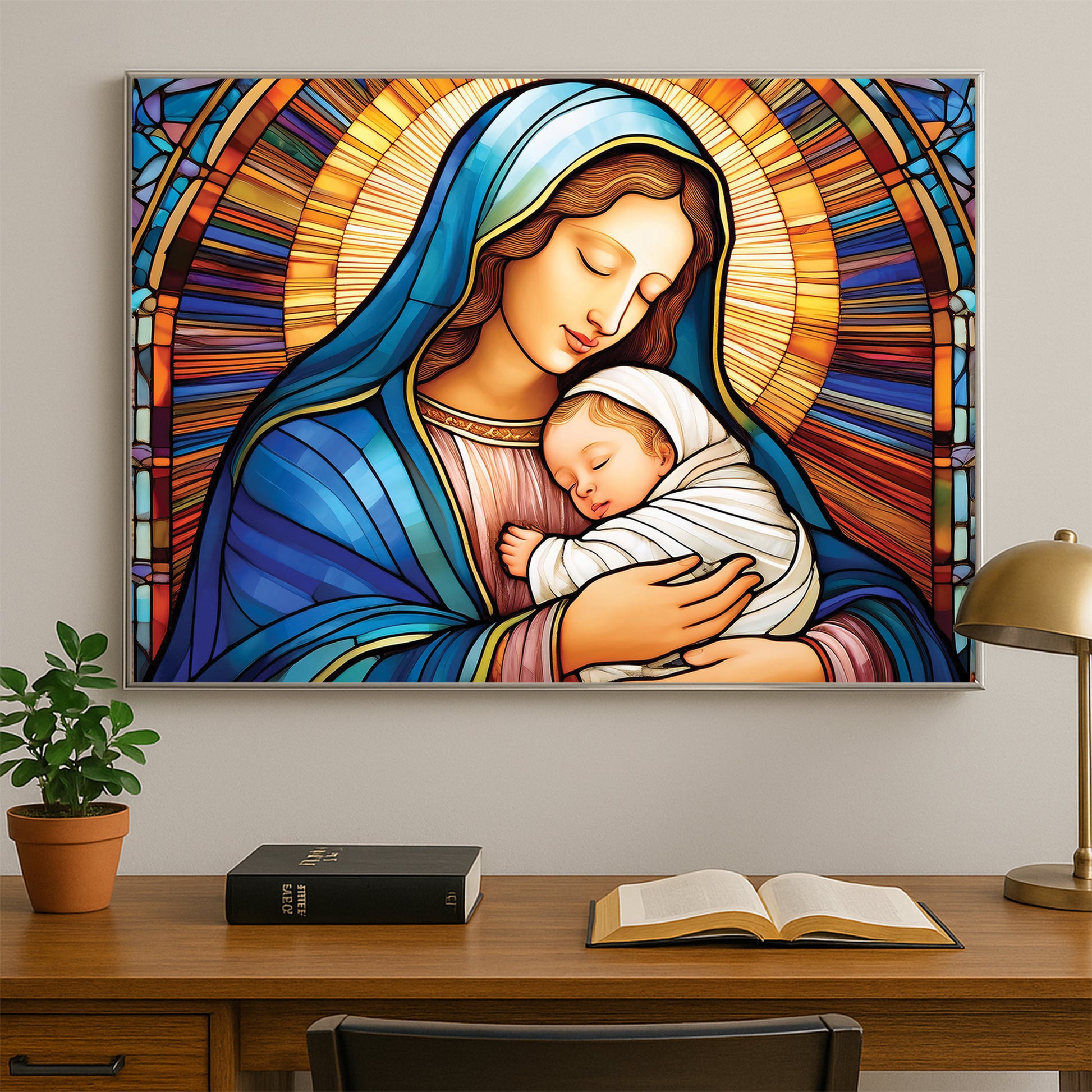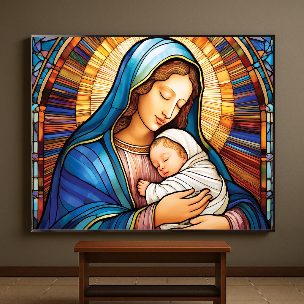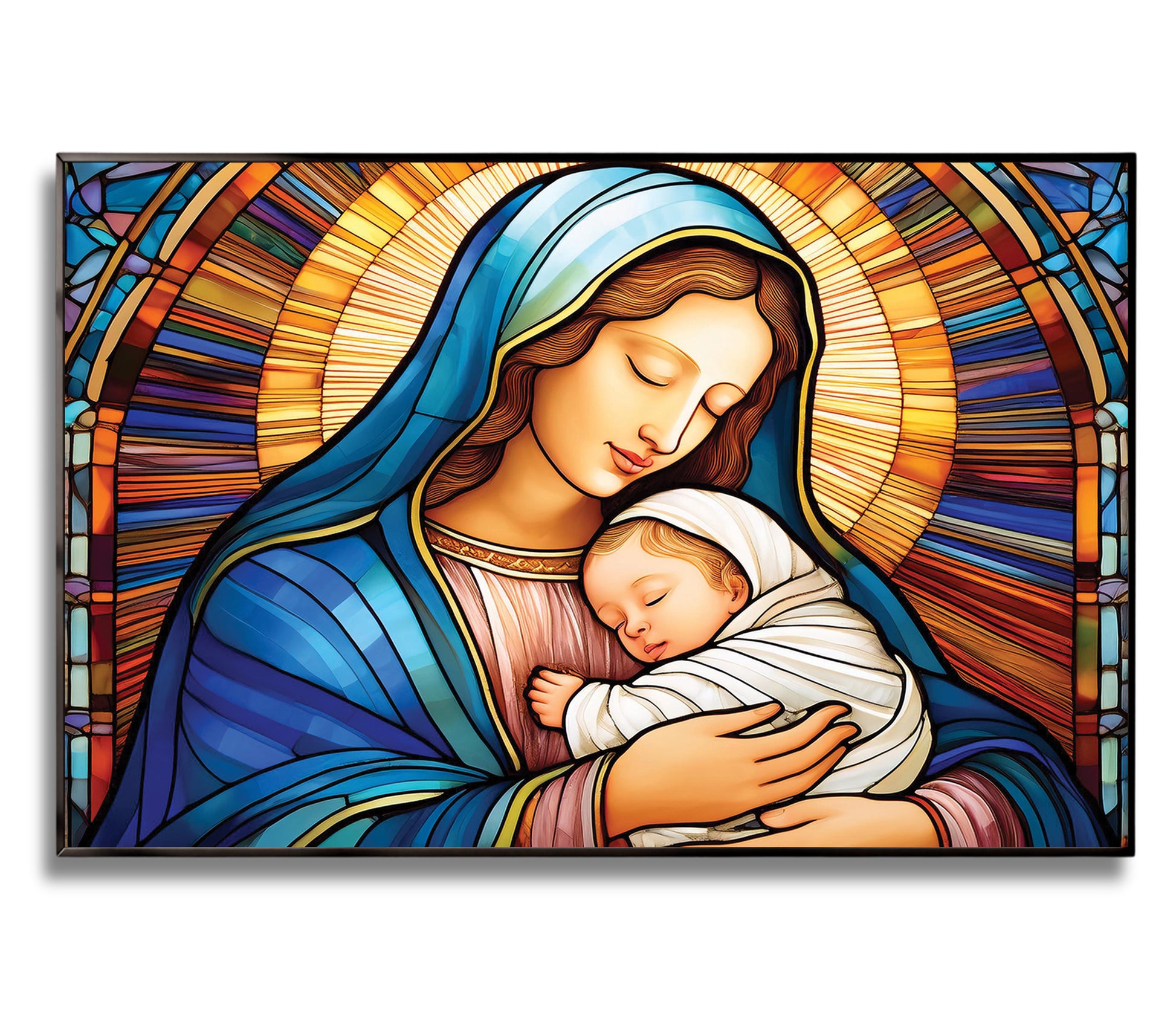 Celebrate the beauty of faith with this Virgin Mary and Baby Jesus Wall Art, designed in a luminous stained-glass style. The tender embrace of Mary holding the Christ Child radiates warmth, love, and divine grace, making this piece a timeless expression of Christian devotion. The rich blues and radiant golds bring depth and elegance, ideal for prayer spaces, churches, or sacred home décor. Professionally framed in durable metal, this artwork captures sacred tradition with modern sophistication.