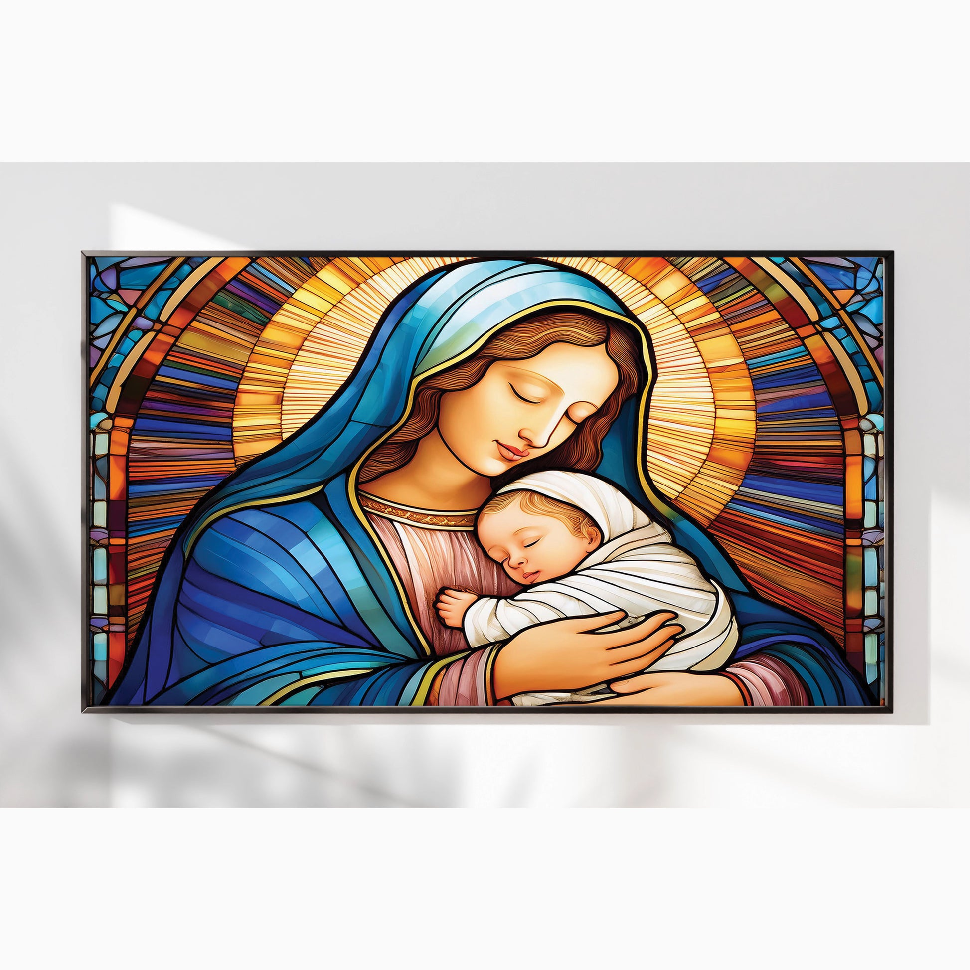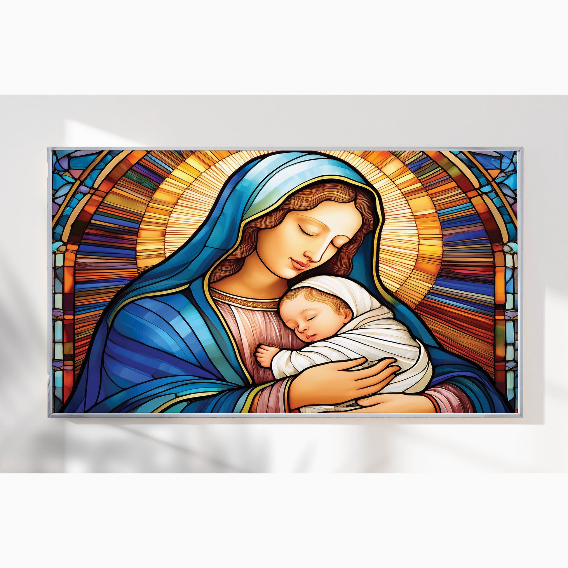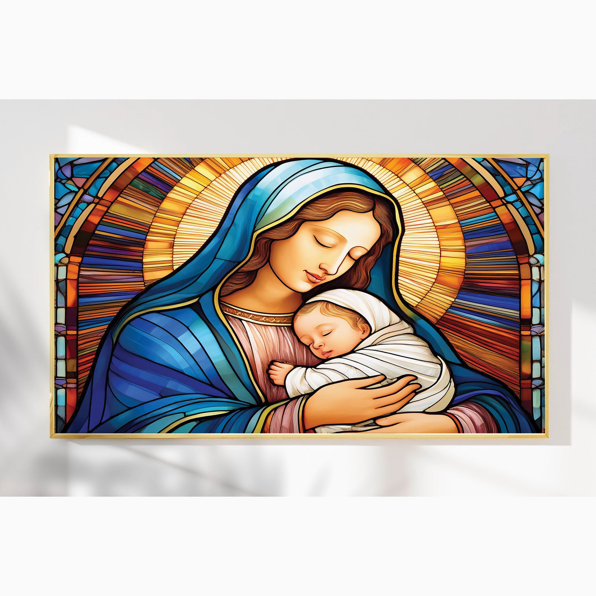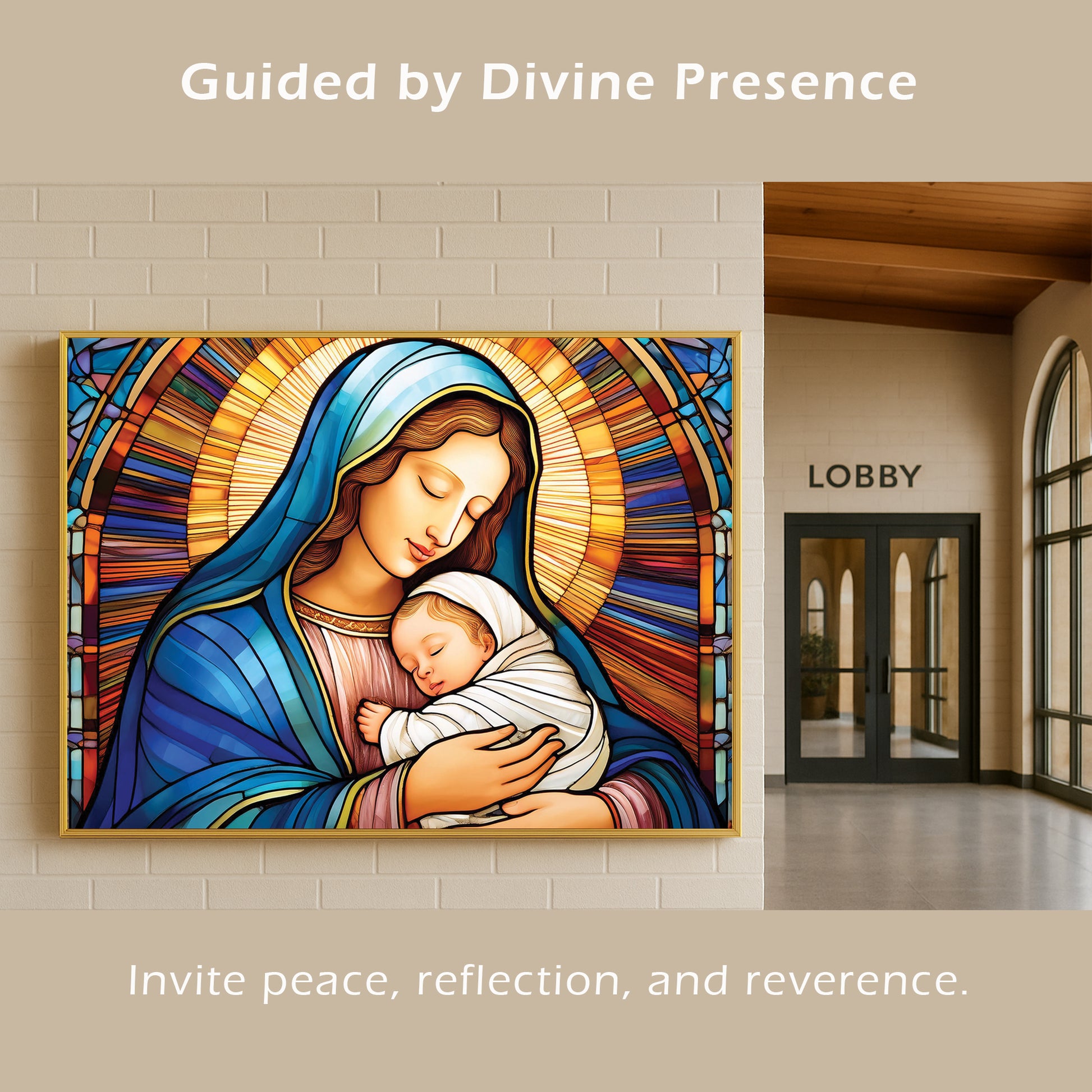 Celebrate the beauty of faith with this Virgin Mary and Baby Jesus Wall Art, designed in a luminous stained-glass style. The tender embrace of Mary holding the Christ Child radiates warmth, love, and divine grace, making this piece a timeless expression of Christian devotion. The rich blues and radiant golds bring depth and elegance, ideal for prayer spaces, churches, or sacred home décor. Professionally framed in durable metal, this artwork captures sacred tradition with modern sophistication.