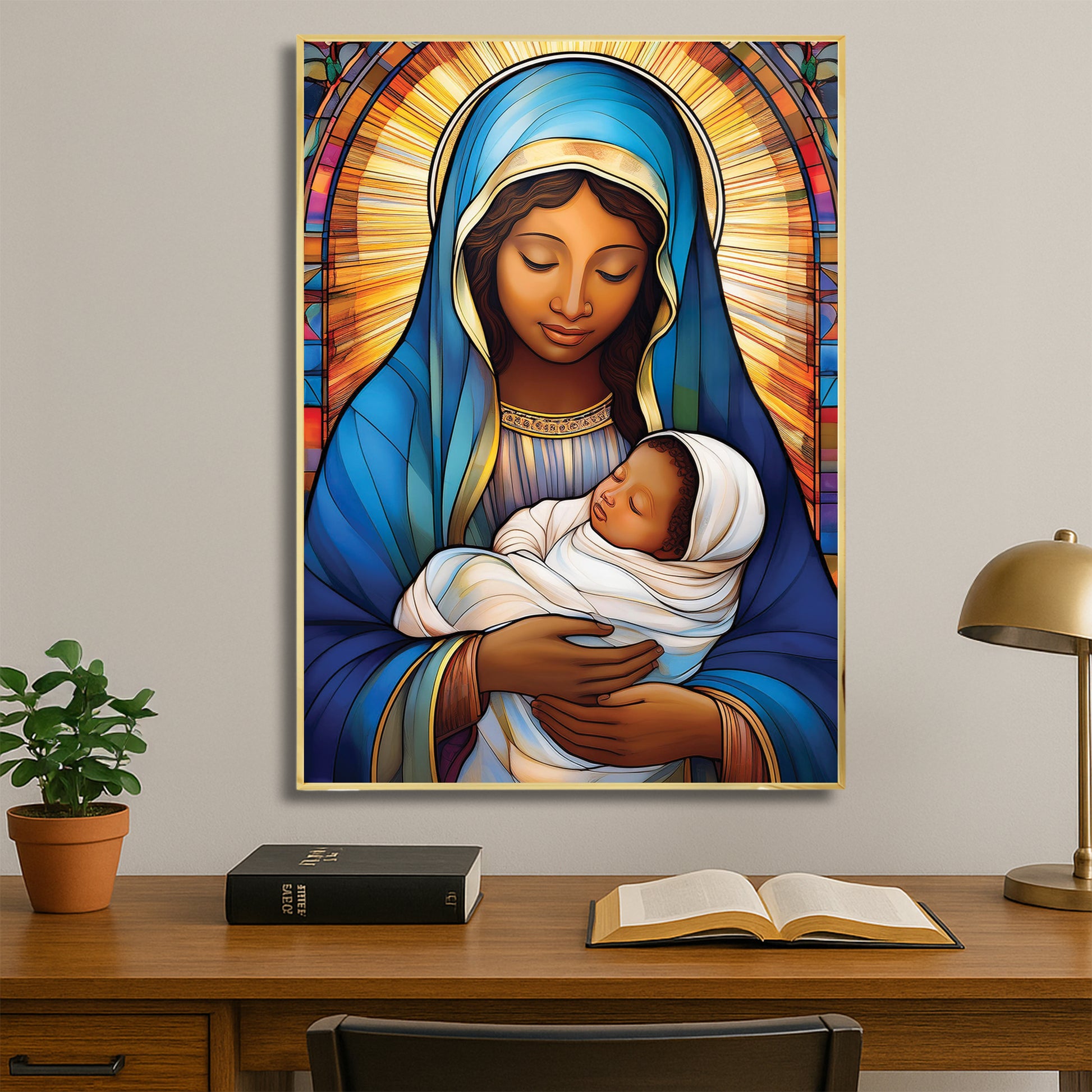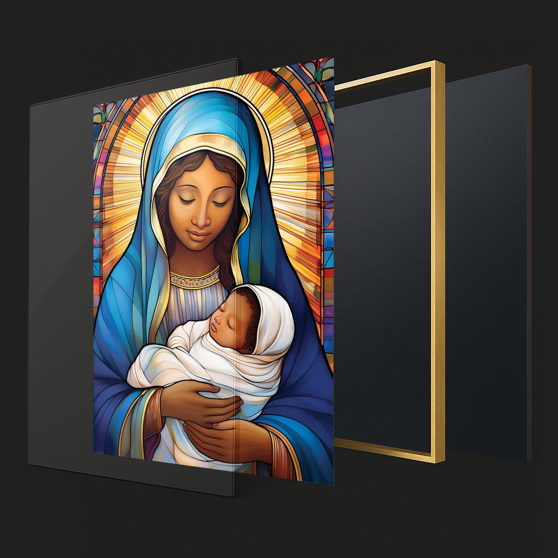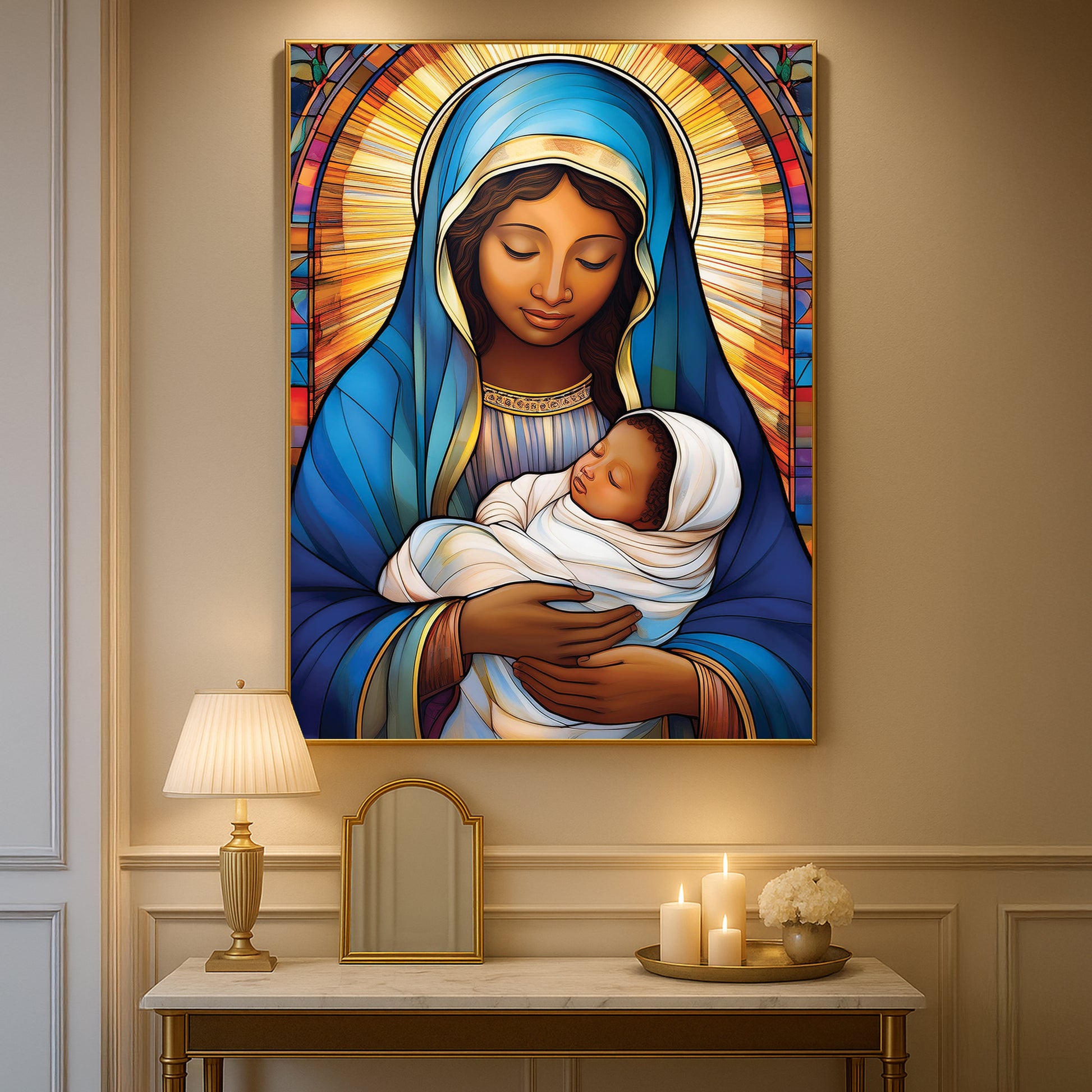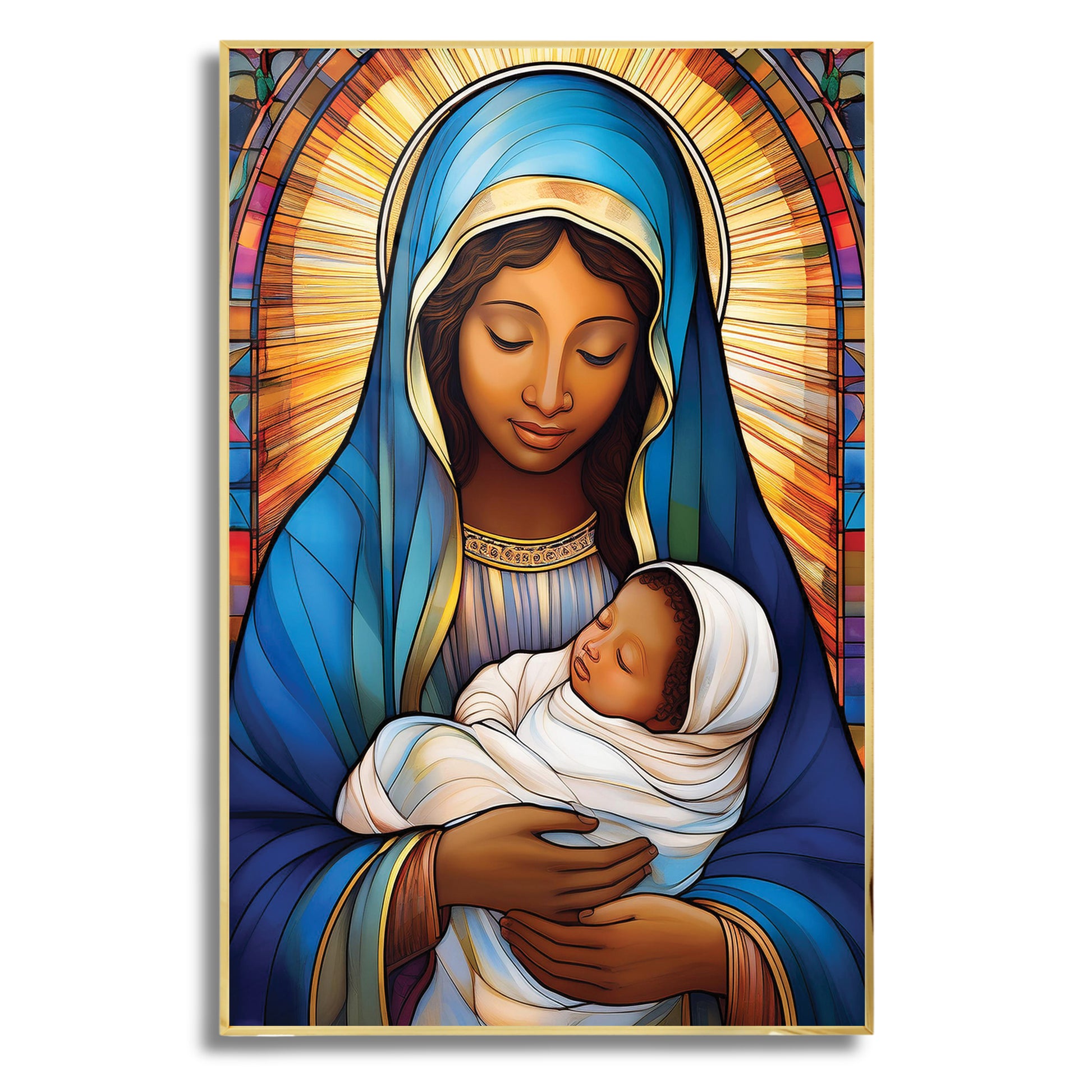 Celebrate divine love and spiritual strength with this Mary and Child Stained Glass Wall Art. Featuring the Virgin Mary in radiant blue robes holding the sleeping infant Jesus, this piece captures maternal tenderness and holiness. Brilliant gold rays and intricate stained-glass details highlight the sacred bond of mother and child, bringing reverence and peace into your space. Perfect for prayer rooms, churches, or as a meaningful centerpiece for faithful homes.