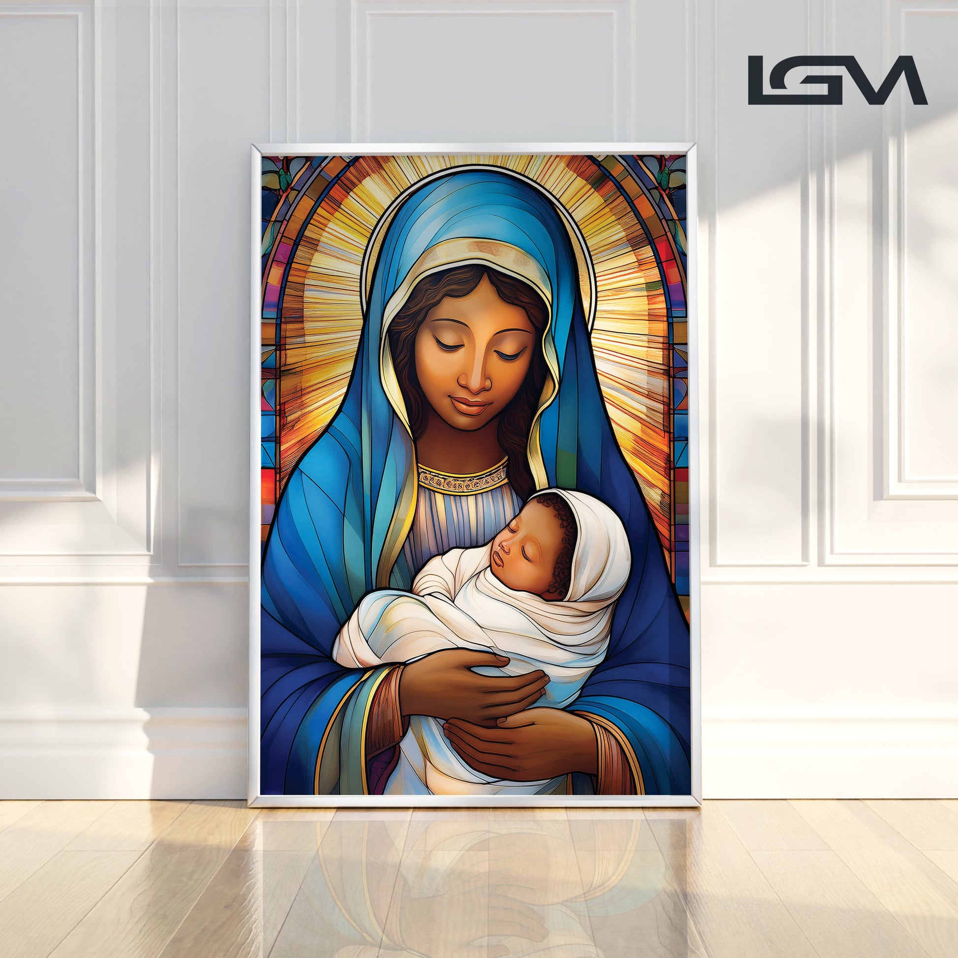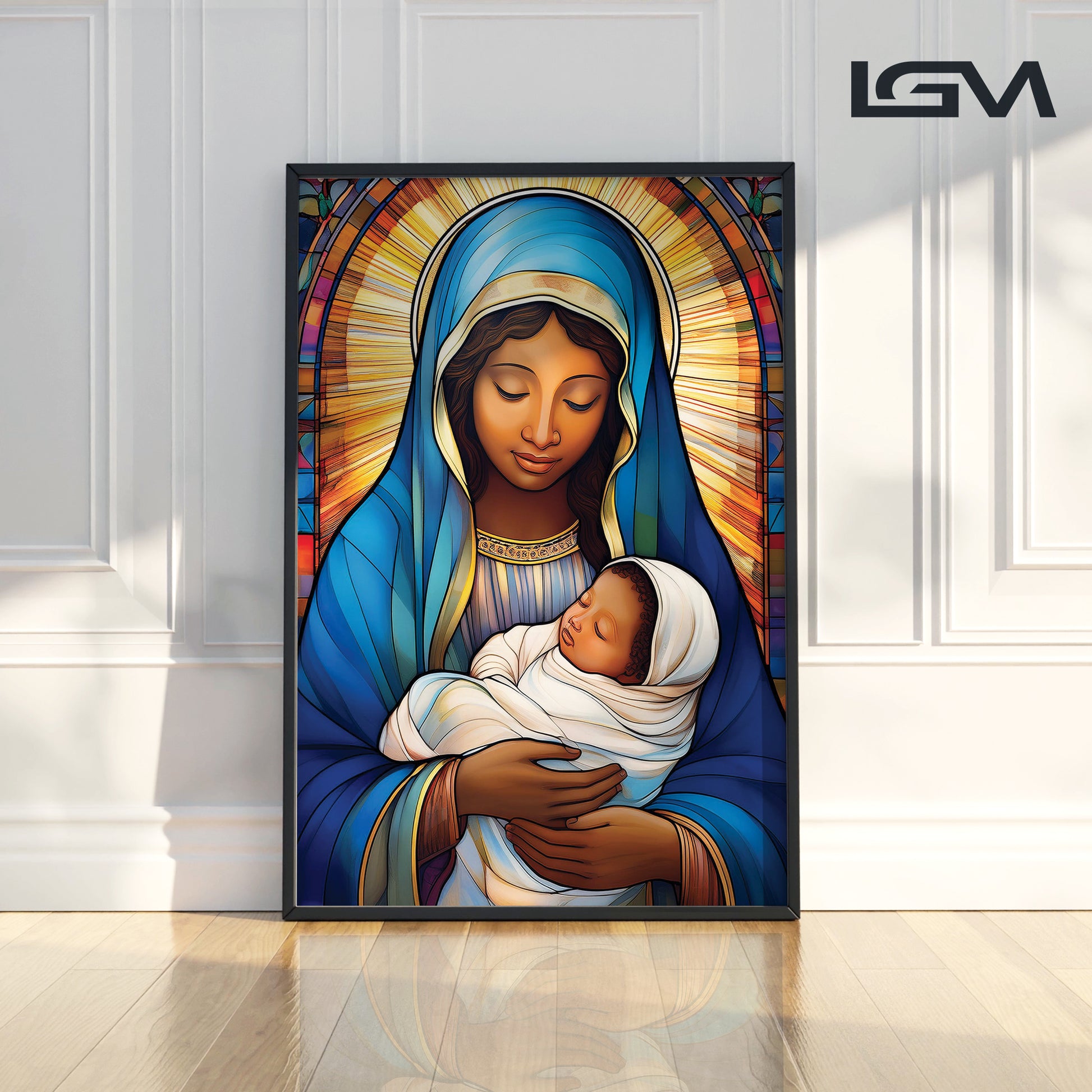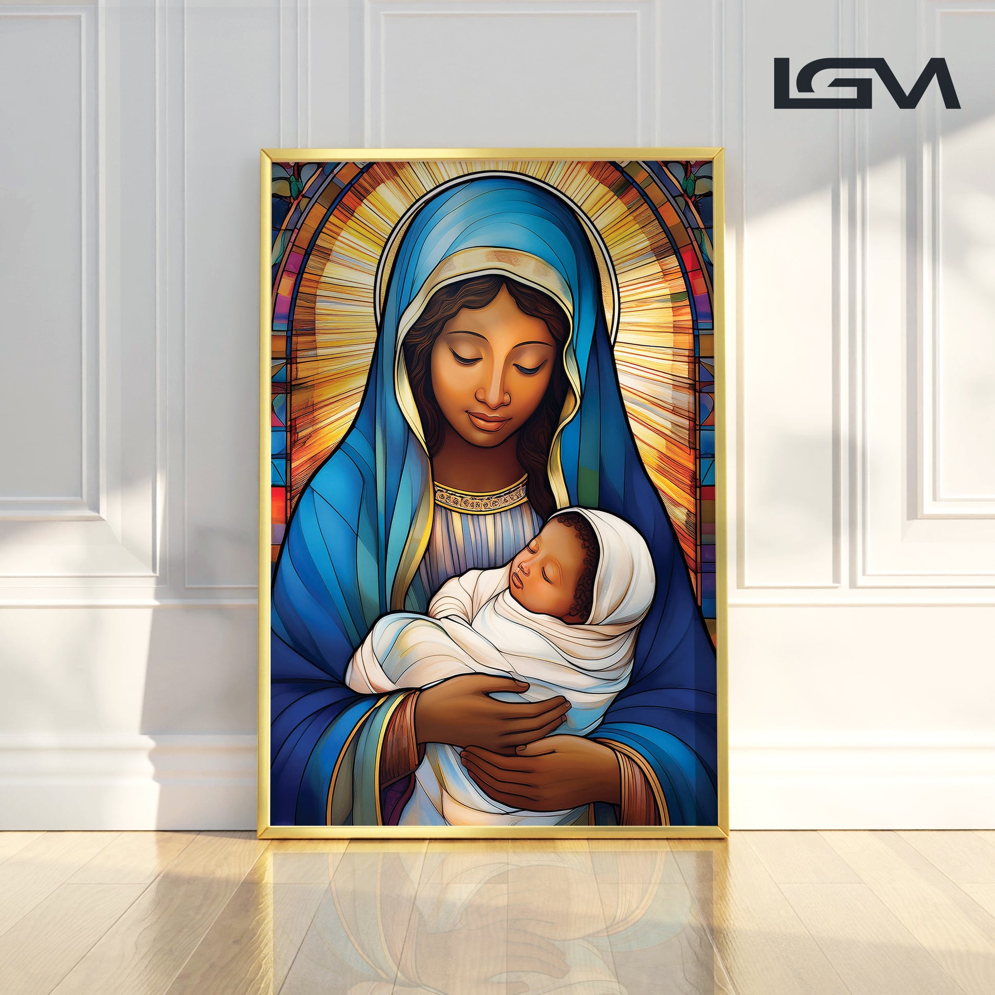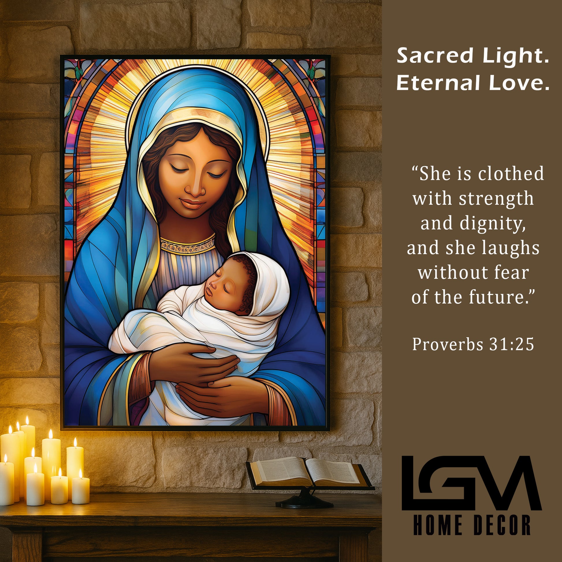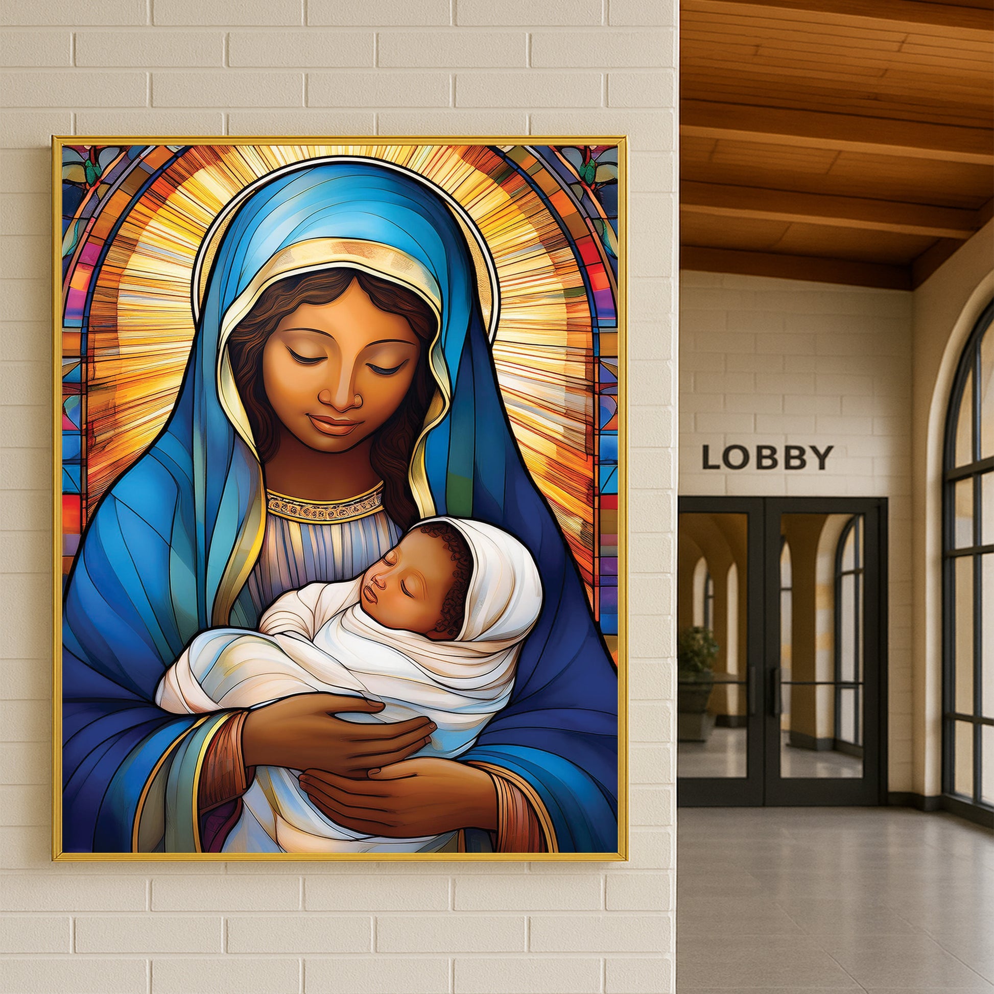 Celebrate divine love and spiritual strength with this Mary and Child Stained Glass Wall Art. Featuring the Virgin Mary in radiant blue robes holding the sleeping infant Jesus, this piece captures maternal tenderness and holiness. Brilliant gold rays and intricate stained-glass details highlight the sacred bond of mother and child, bringing reverence and peace into your space. Perfect for prayer rooms, churches, or as a meaningful centerpiece for faithful homes.