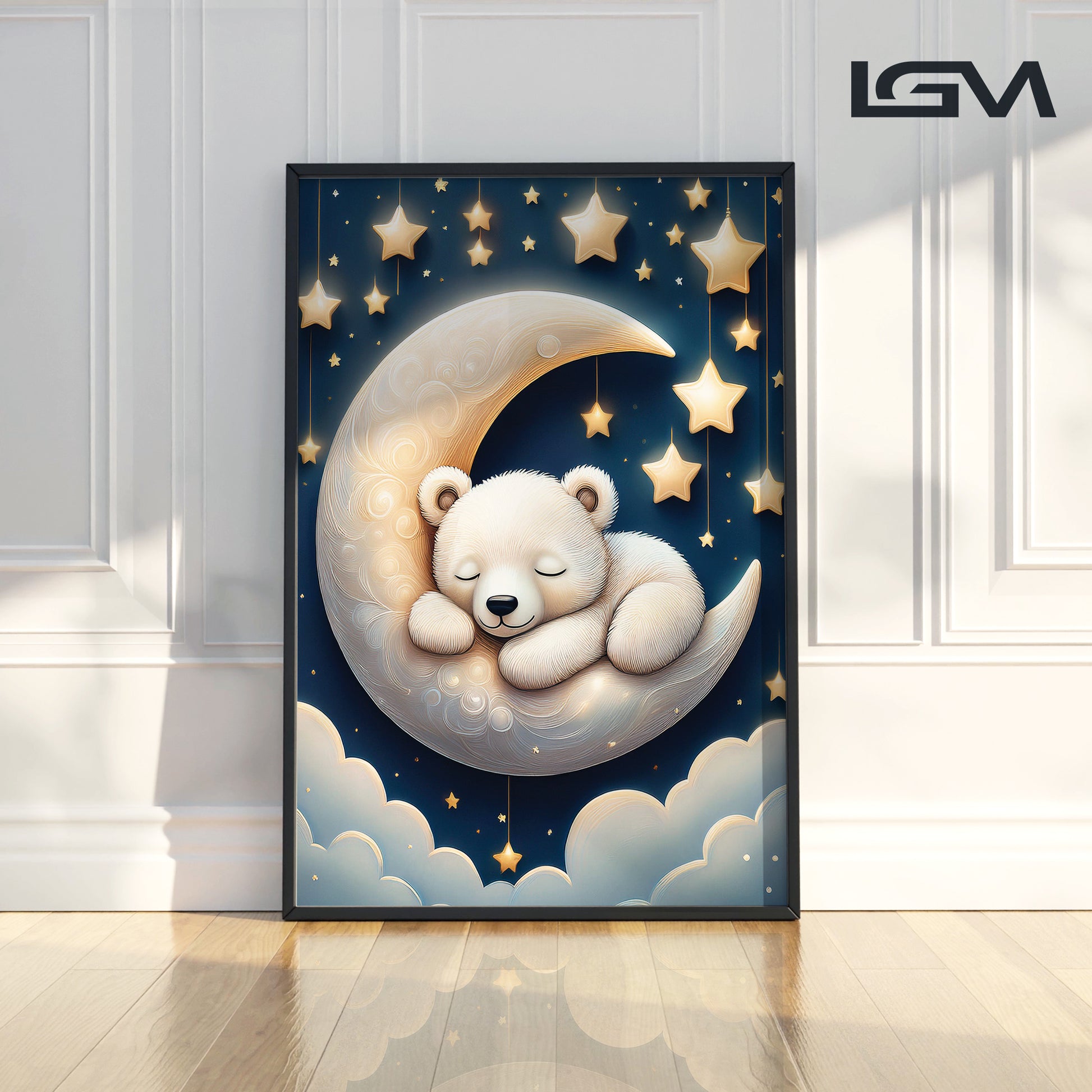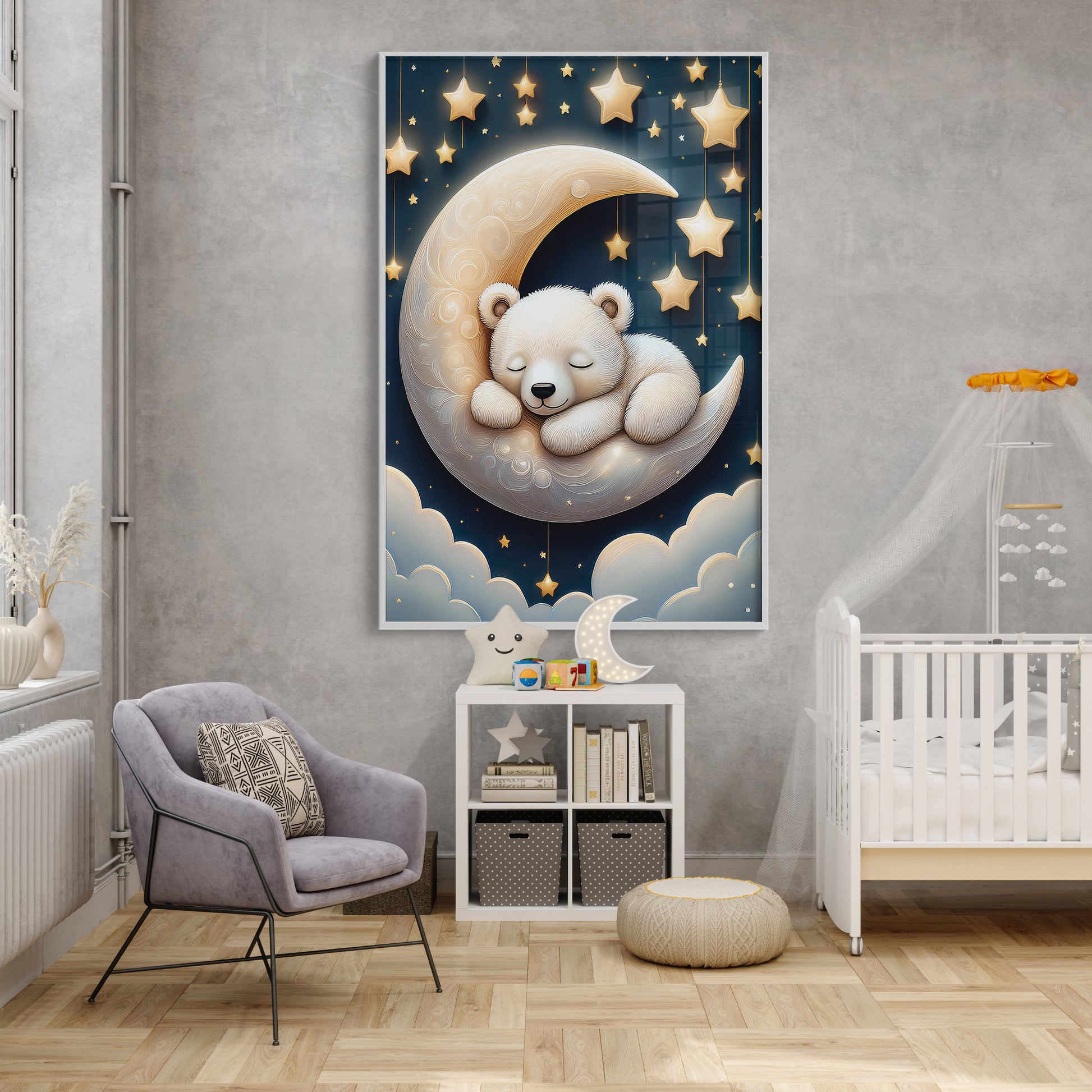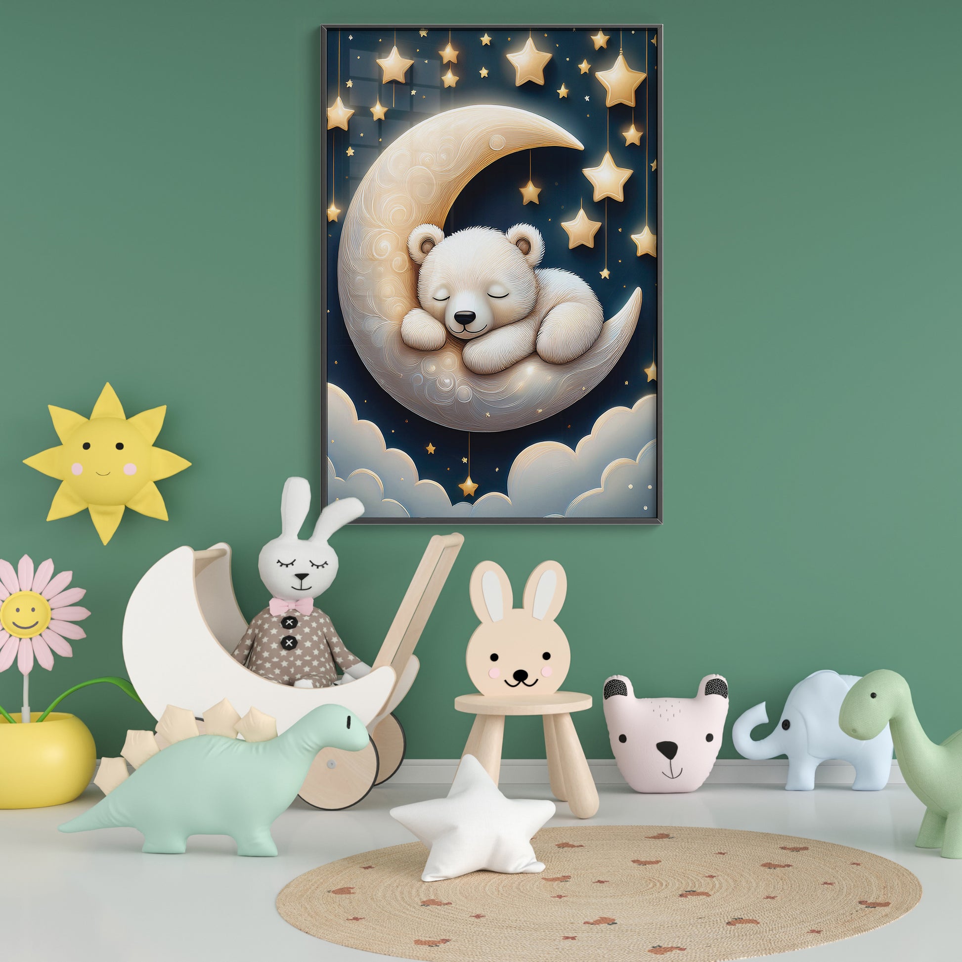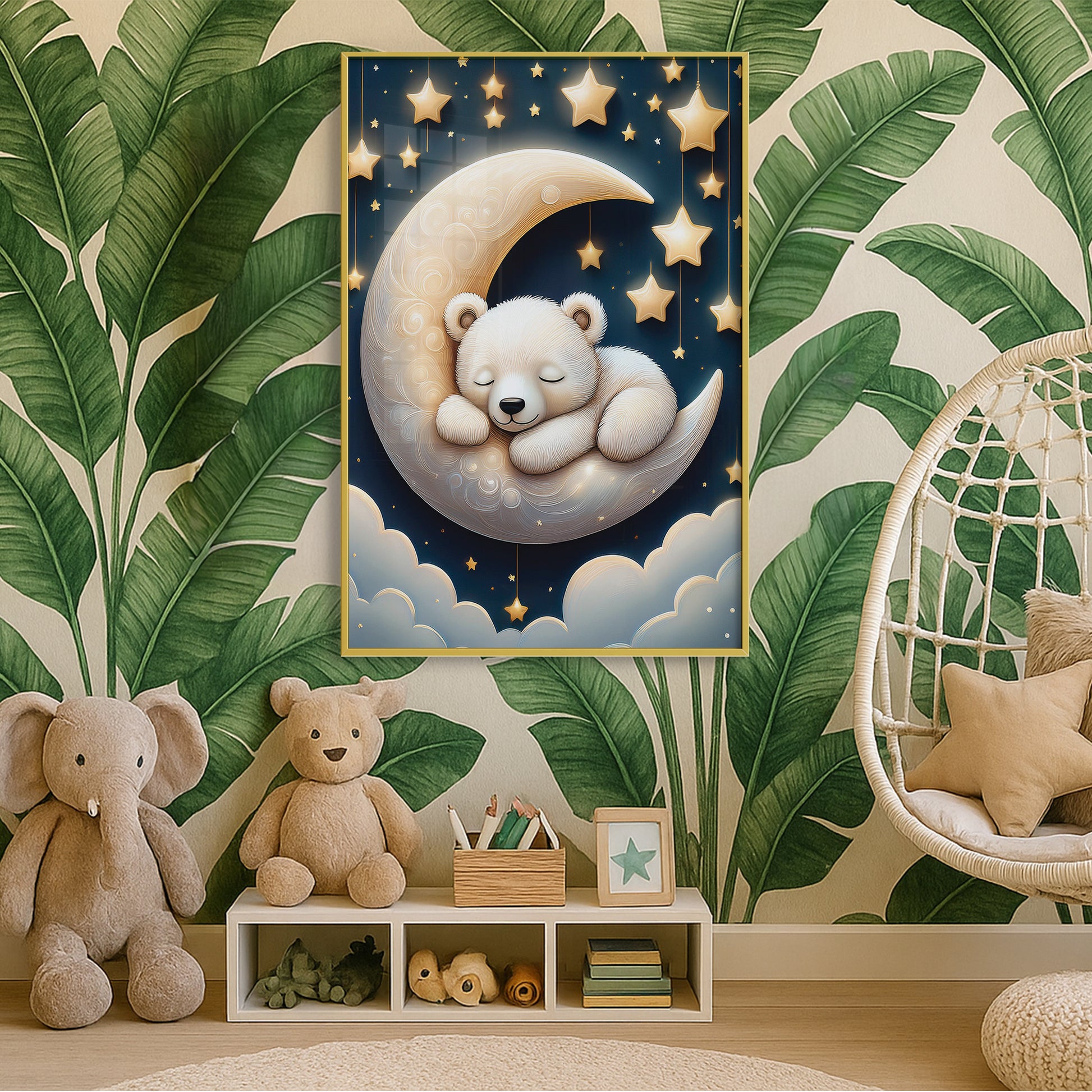 Create a dreamy sanctuary with this stunning artwork of a fluffy white bear sleeping on a moon that glows with swirling patterns and stardust. A constellation of stars dances in the deep blue sky, casting a magical light over the scene. This serene design is perfect for quiet bedtime routines and imaginative storytime.