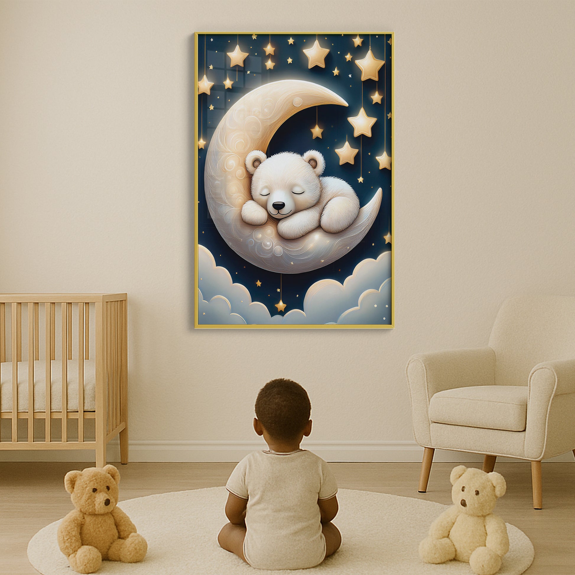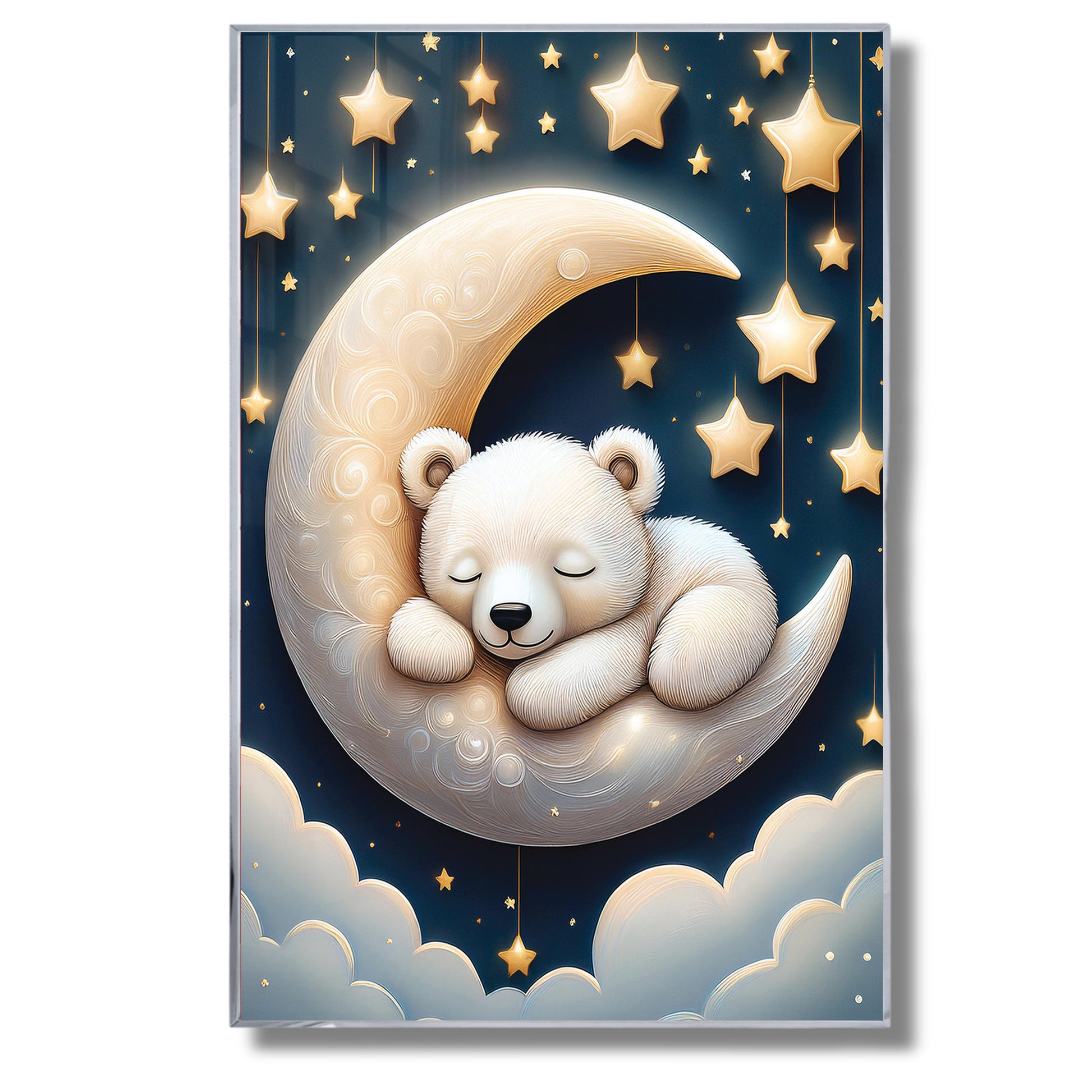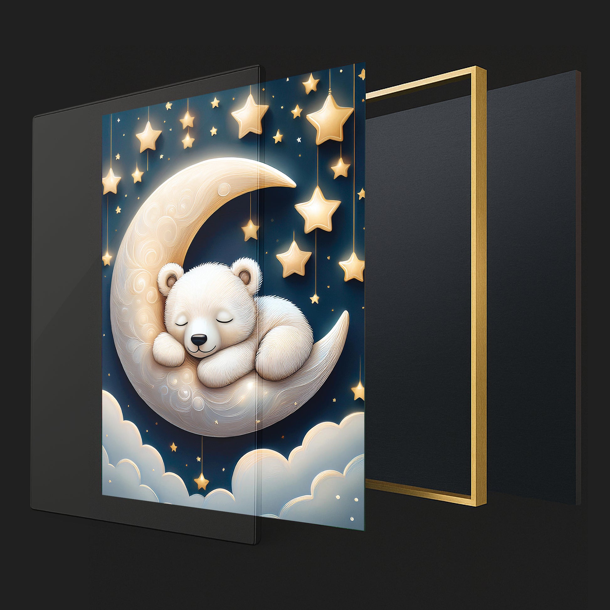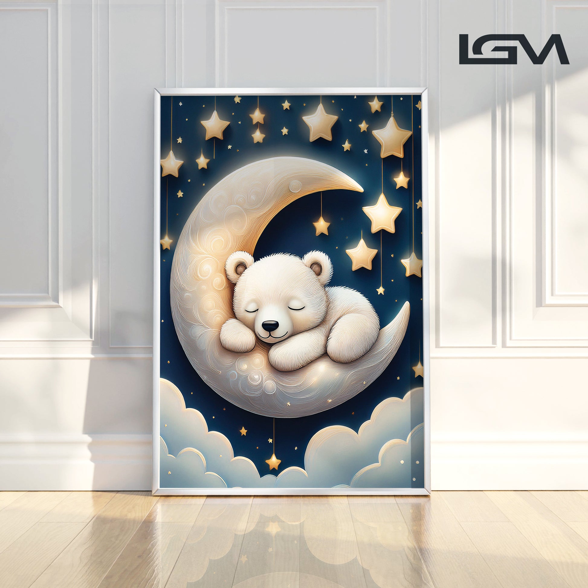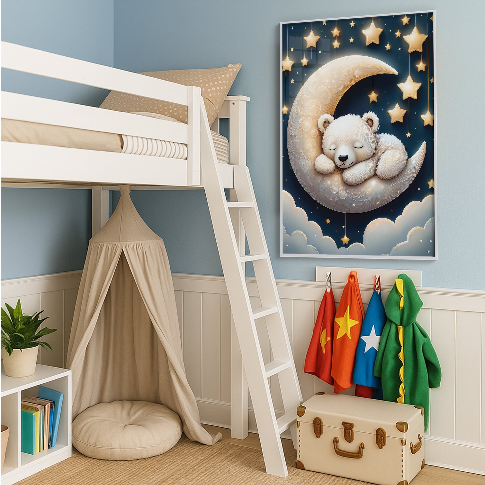 Create a dreamy sanctuary with this stunning artwork of a fluffy white bear sleeping on a moon that glows with swirling patterns and stardust. A constellation of stars dances in the deep blue sky, casting a magical light over the scene. This serene design is perfect for quiet bedtime routines and imaginative storytime.