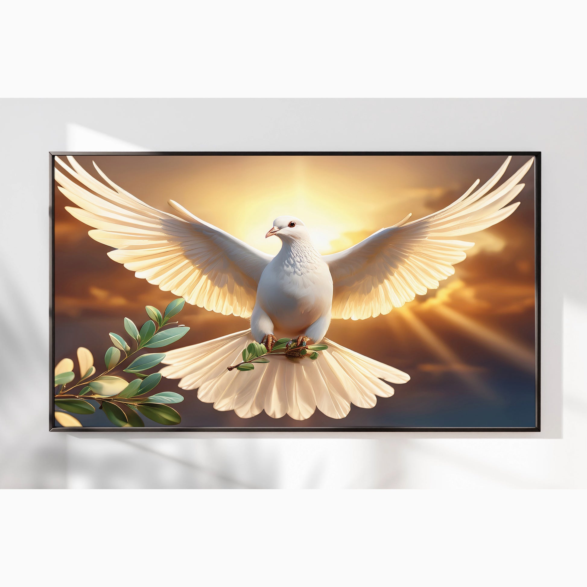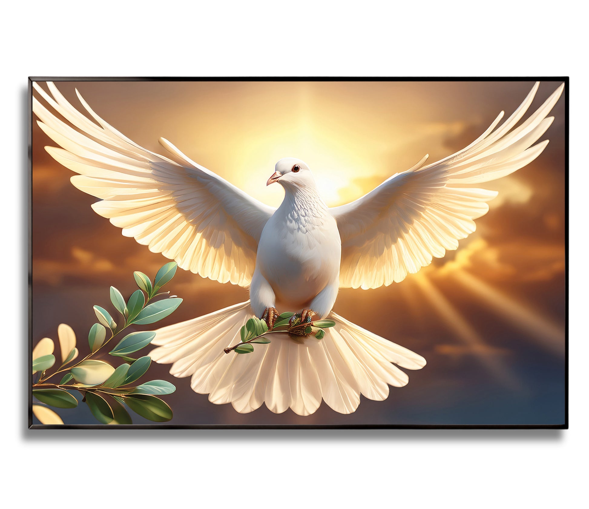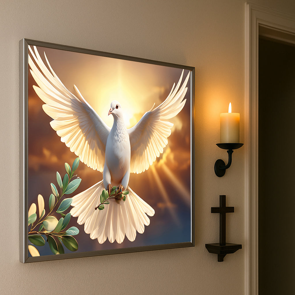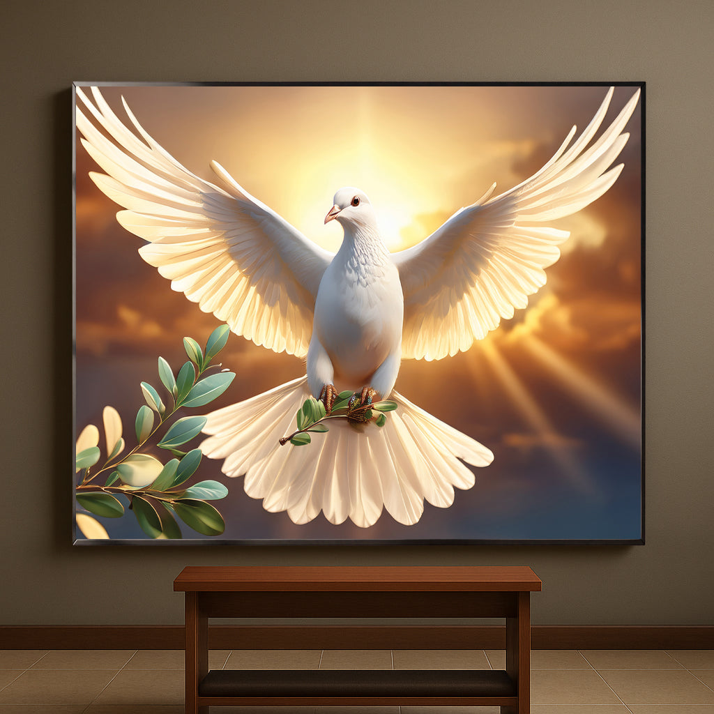 Bring serenity and inspiration into your home with this White Dove with Olive Branch Wall Art. Featuring a radiant dove soaring against a golden sunrise, this artwork symbolizes peace, purity, and new beginnings. The glowing light and soft details create a spiritual and uplifting atmosphere, making it an ideal centerpiece for living rooms, meditation spaces, or prayer rooms. Professionally framed in metal, it blends elegance and timeless meaning.