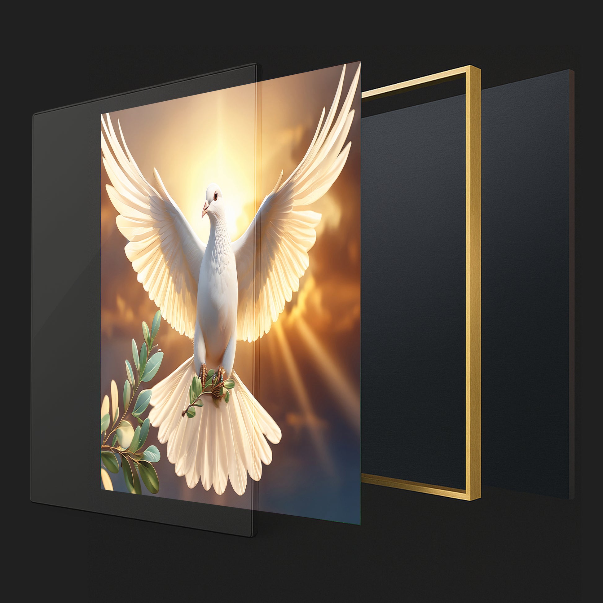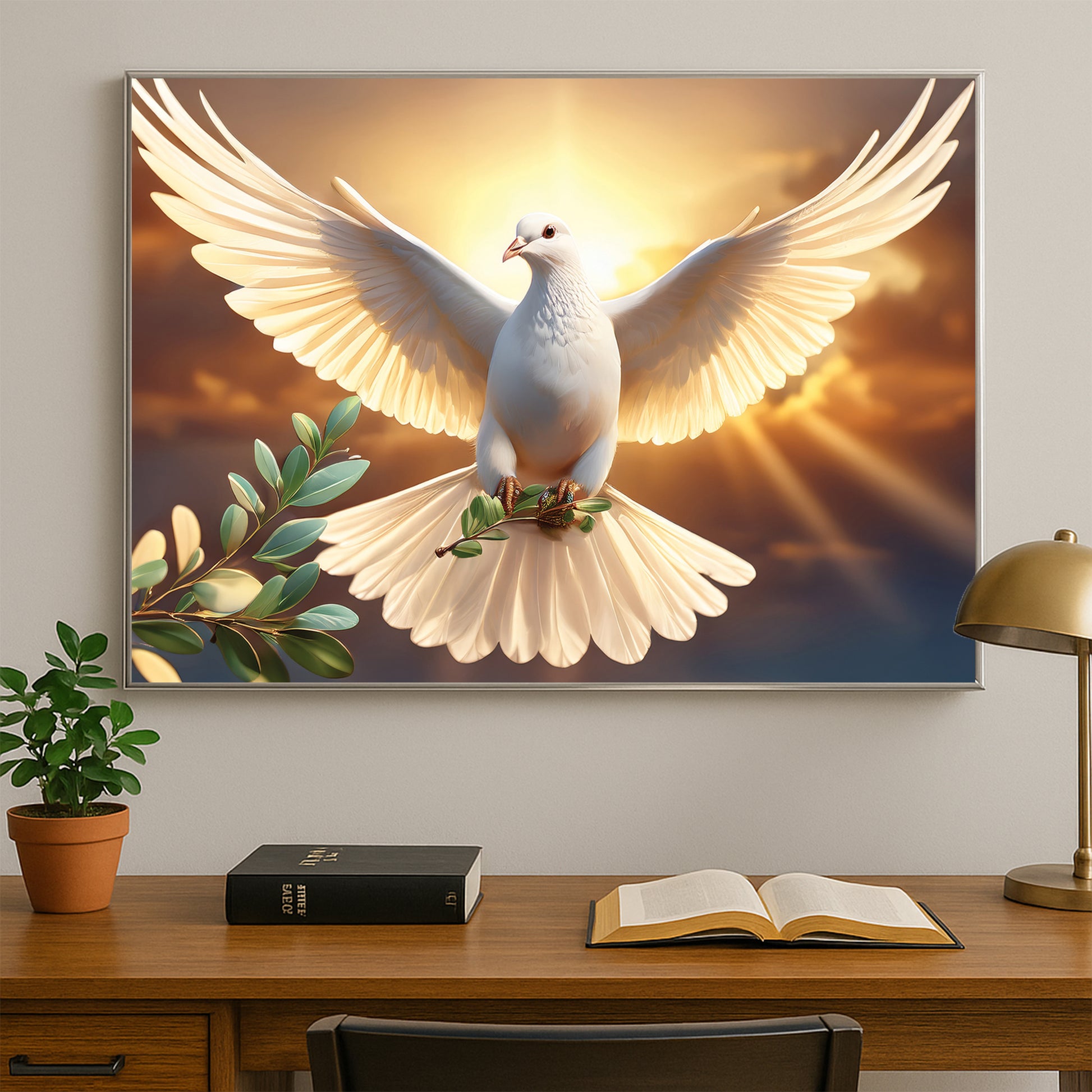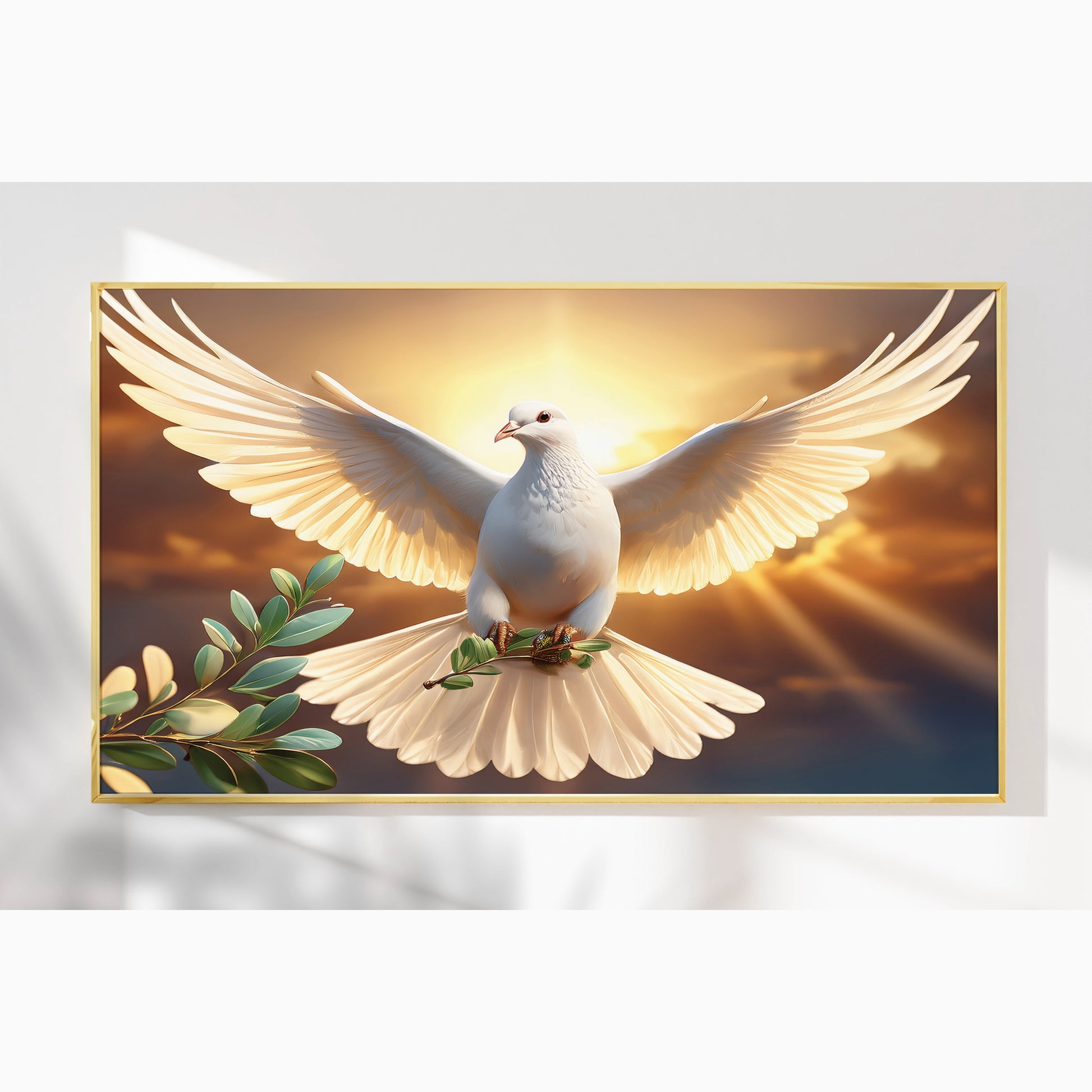 Bring serenity and inspiration into your home with this White Dove with Olive Branch Wall Art. Featuring a radiant dove soaring against a golden sunrise, this artwork symbolizes peace, purity, and new beginnings. The glowing light and soft details create a spiritual and uplifting atmosphere, making it an ideal centerpiece for living rooms, meditation spaces, or prayer rooms. Professionally framed in metal, it blends elegance and timeless meaning.