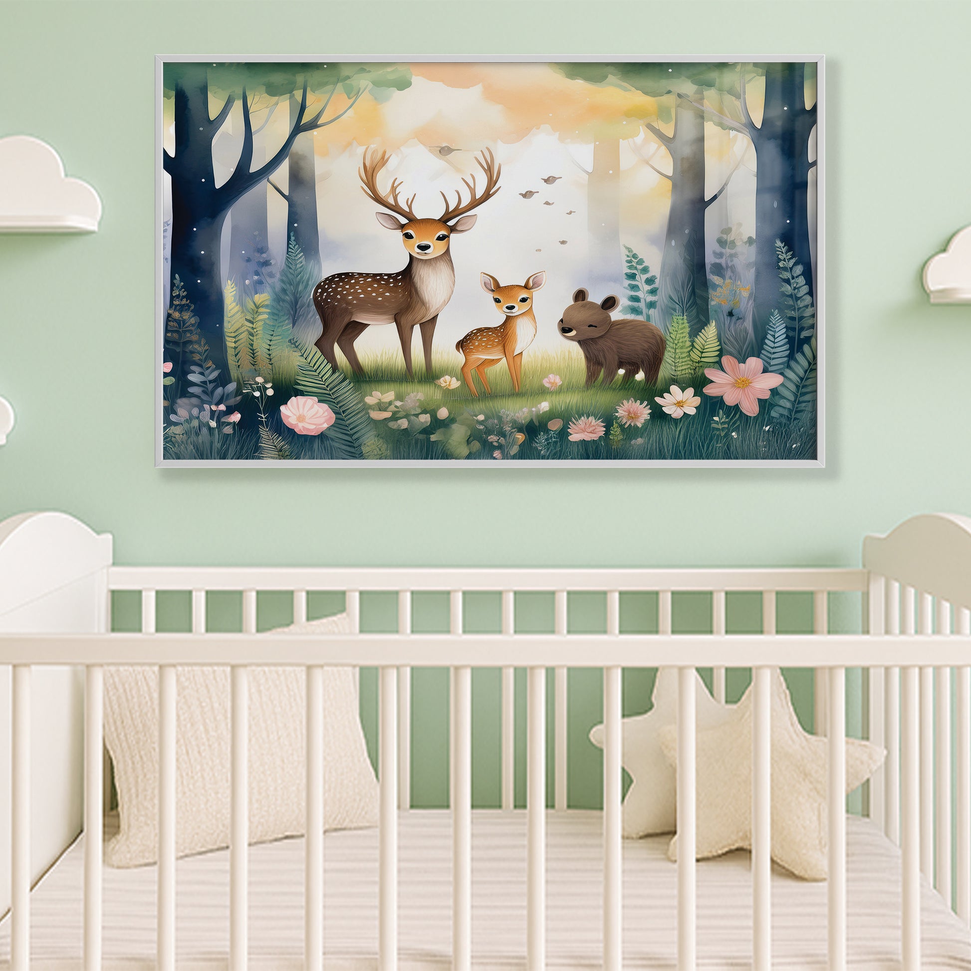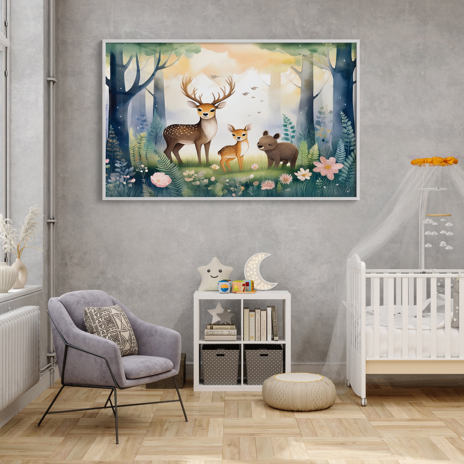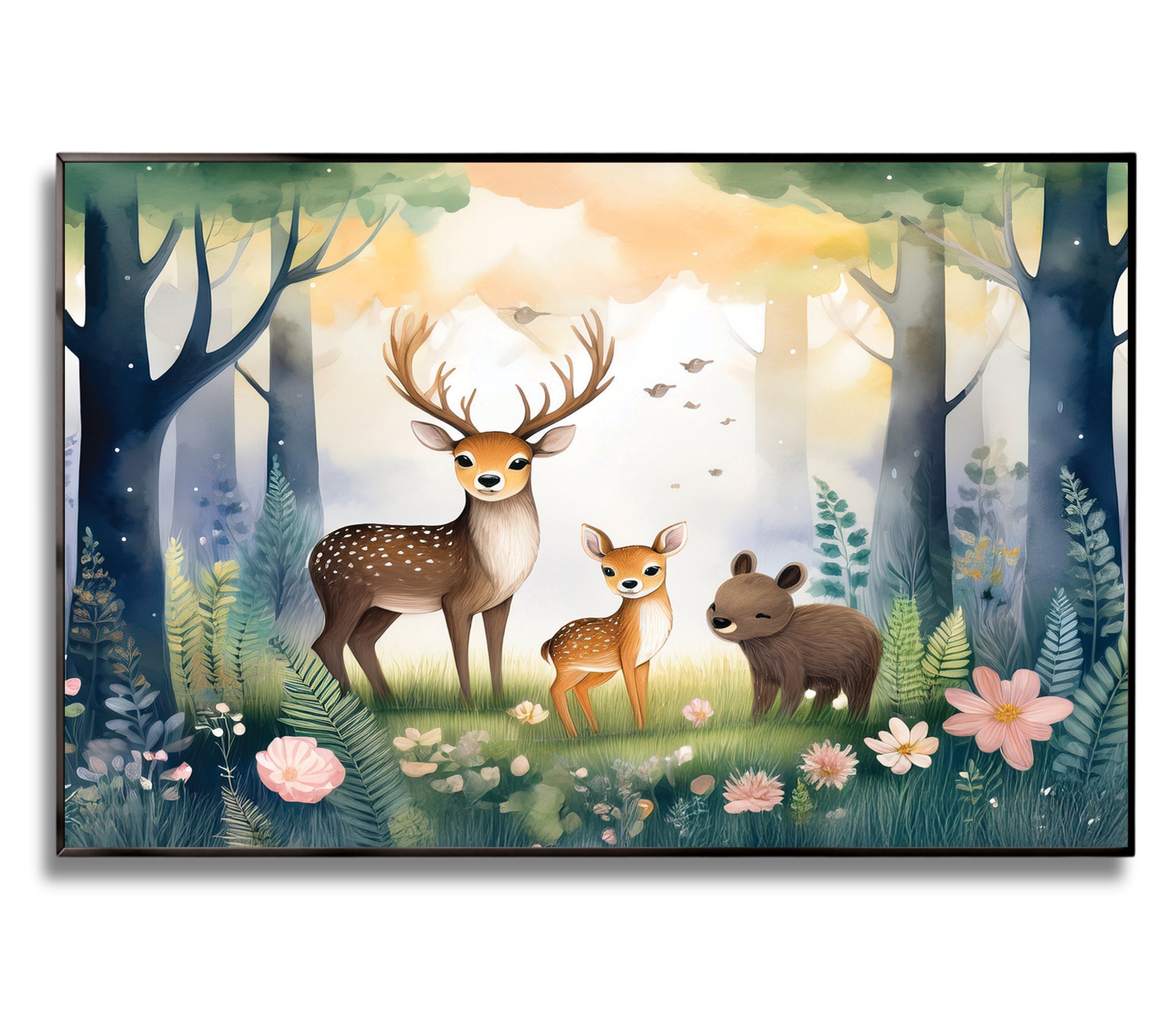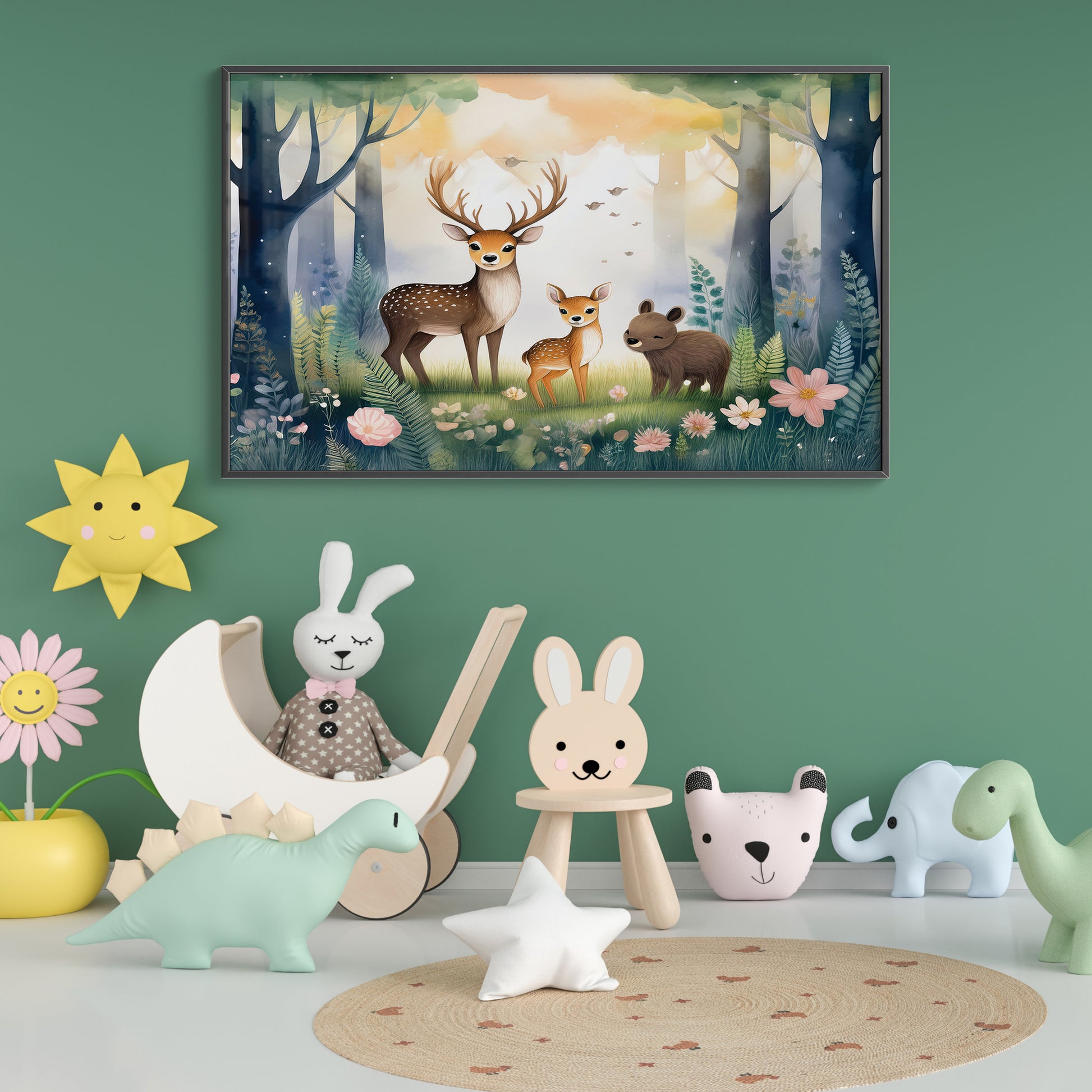 Bring warmth and calm to your nursery or playroom with this heartwarming woodland deer family scene. A proud stag, a gentle doe, and a curious bear cub stand together in a lush forest filled with pastel flowers and ferns. The soft, watercolor-inspired tones make it perfect for a serene, nurturing space.