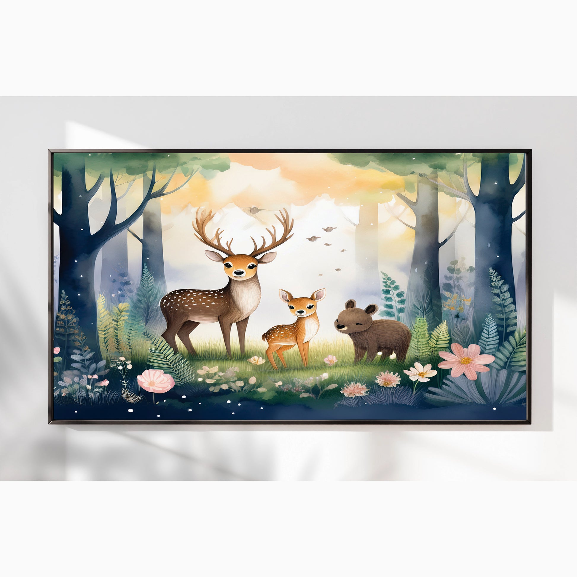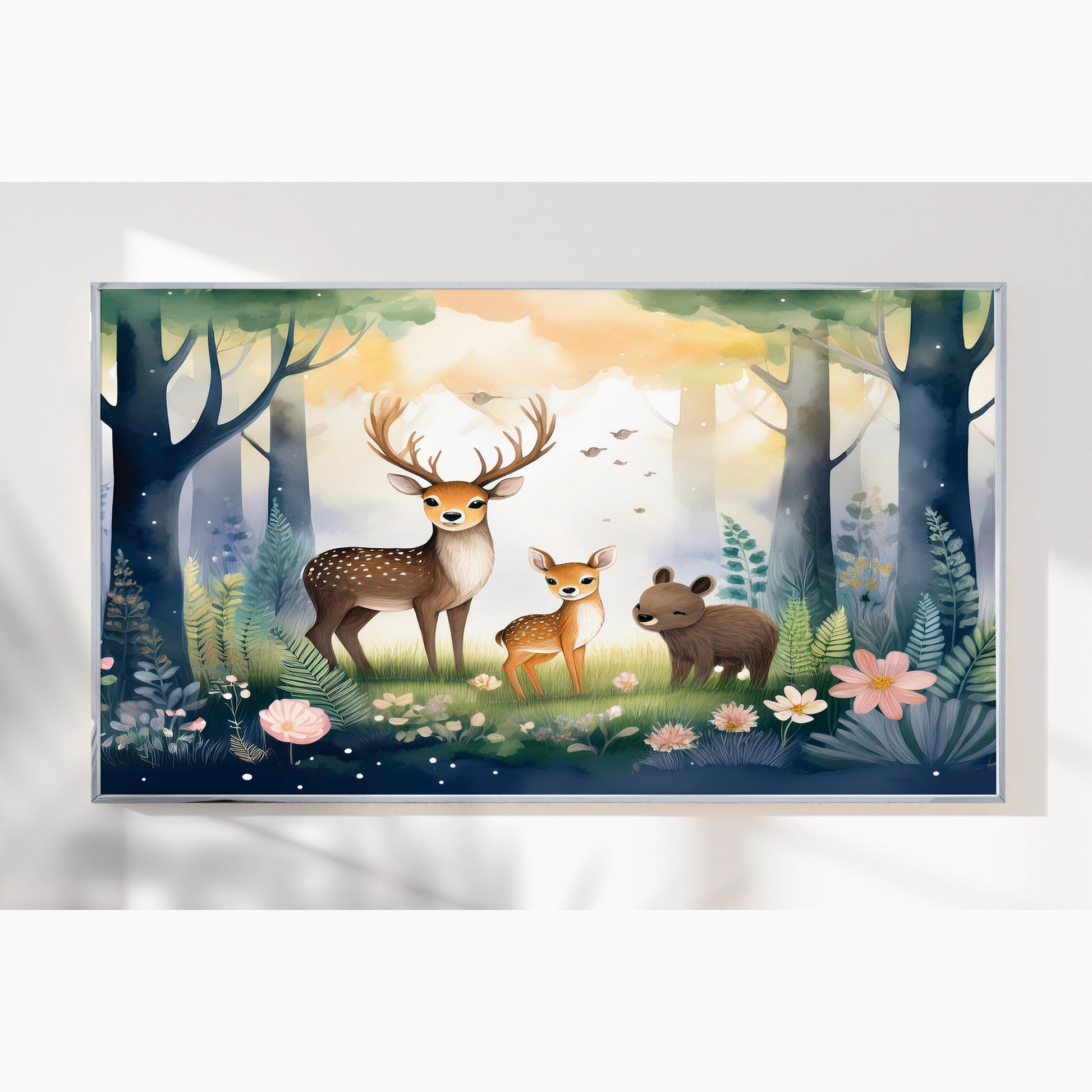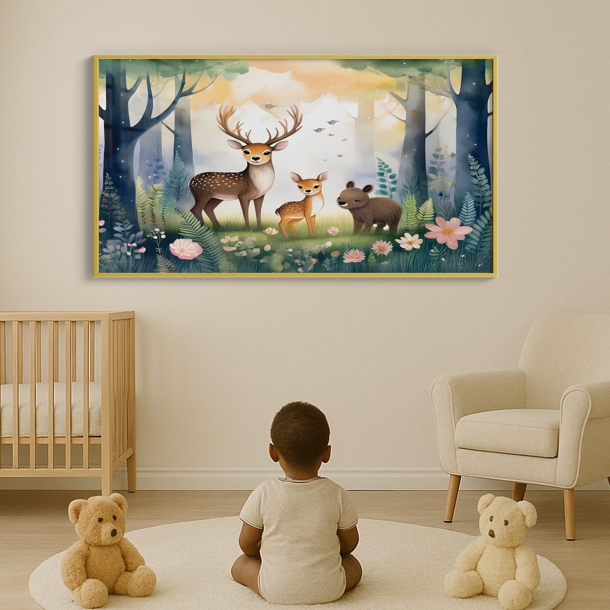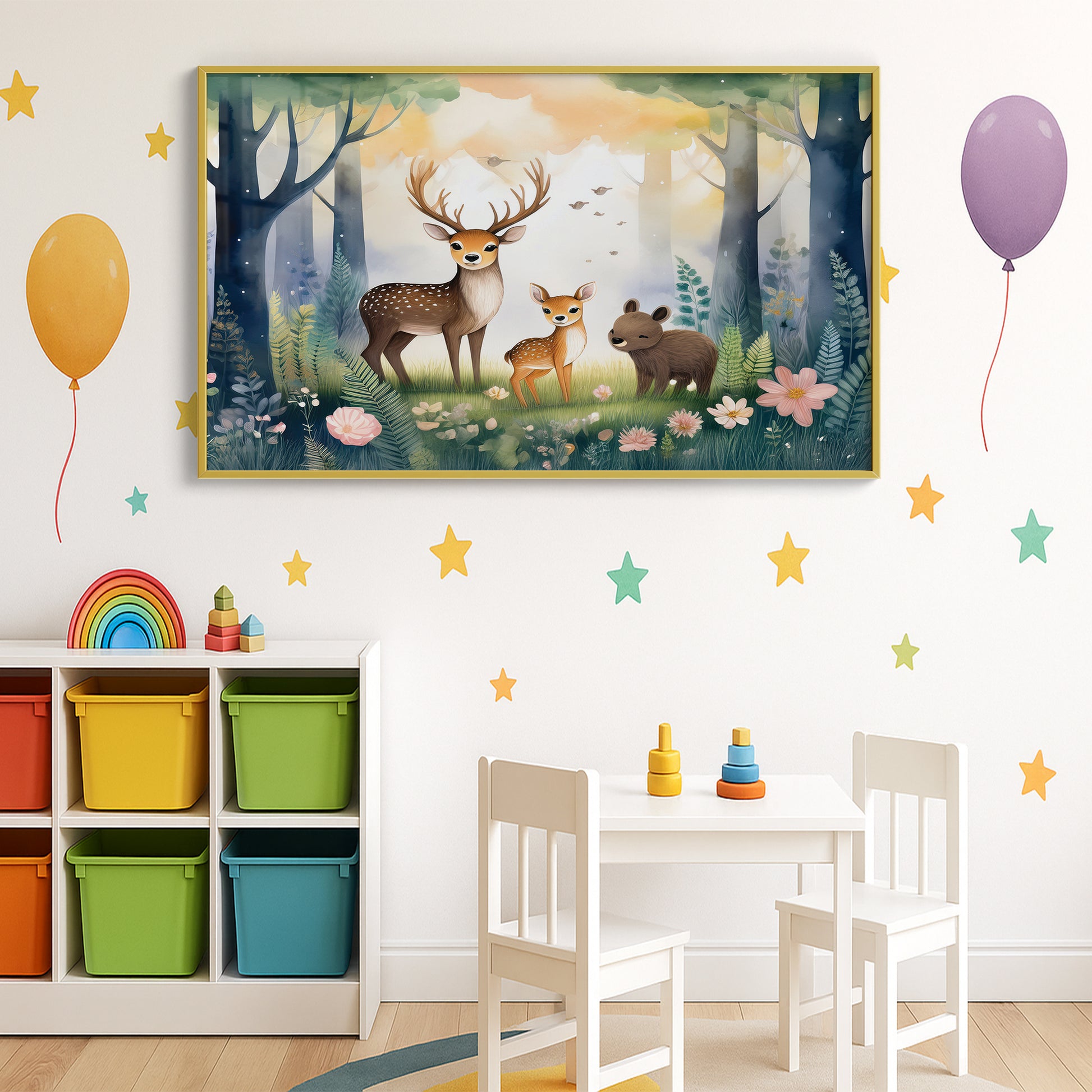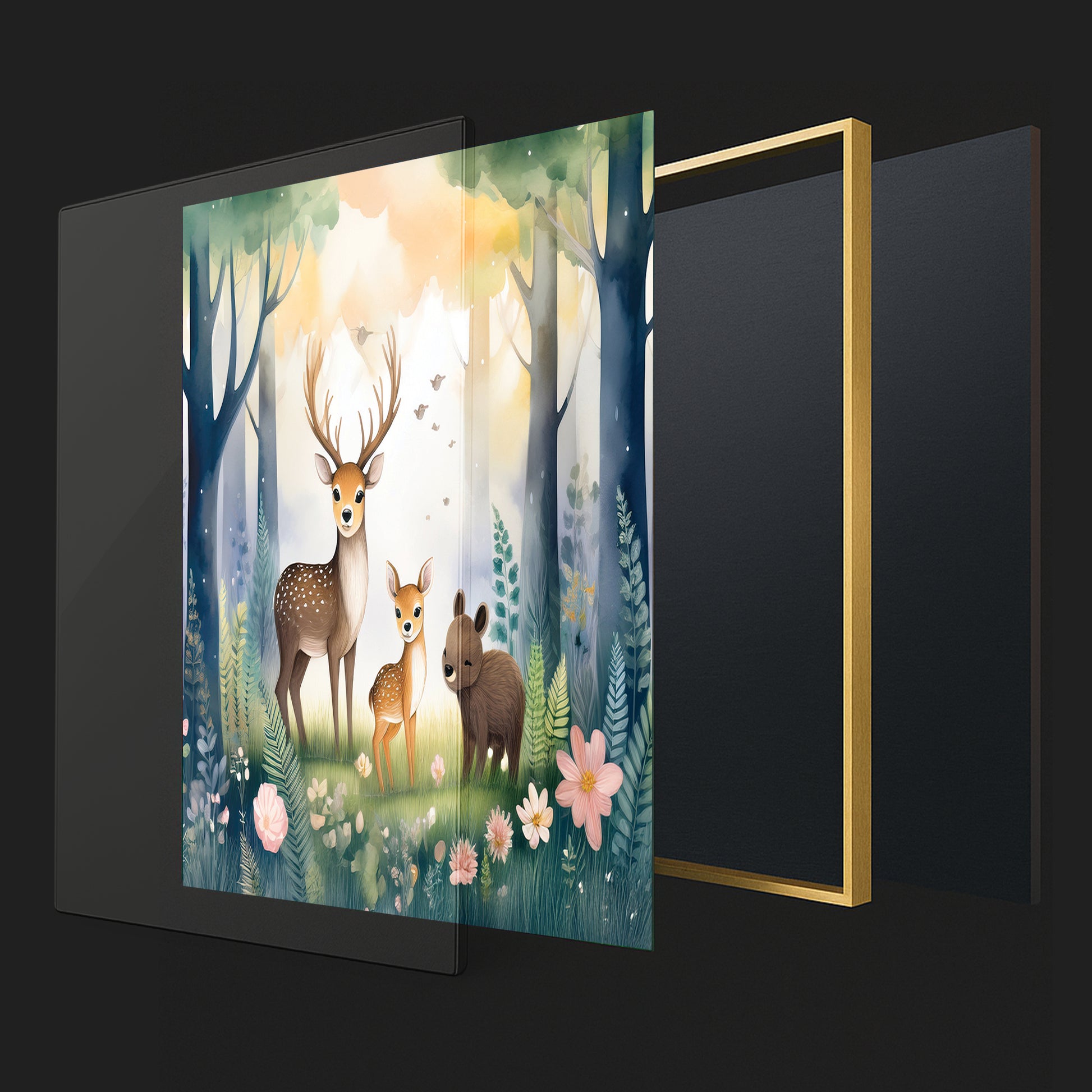 Bring warmth and calm to your nursery or playroom with this heartwarming woodland deer family scene. A proud stag, a gentle doe, and a curious bear cub stand together in a lush forest filled with pastel flowers and ferns. The soft, watercolor-inspired tones make it perfect for a serene, nurturing space.